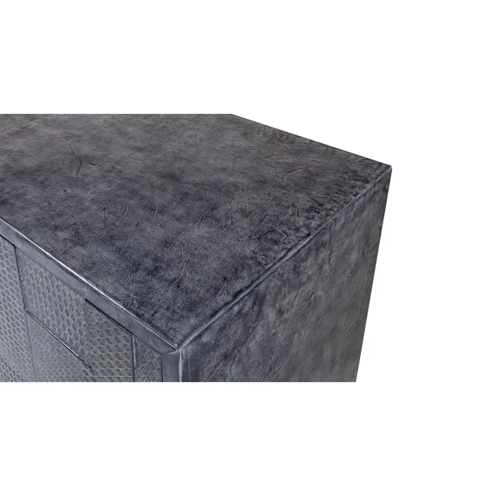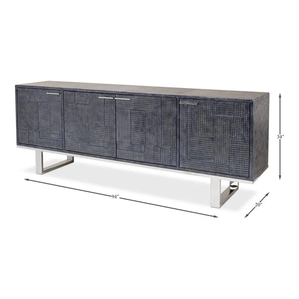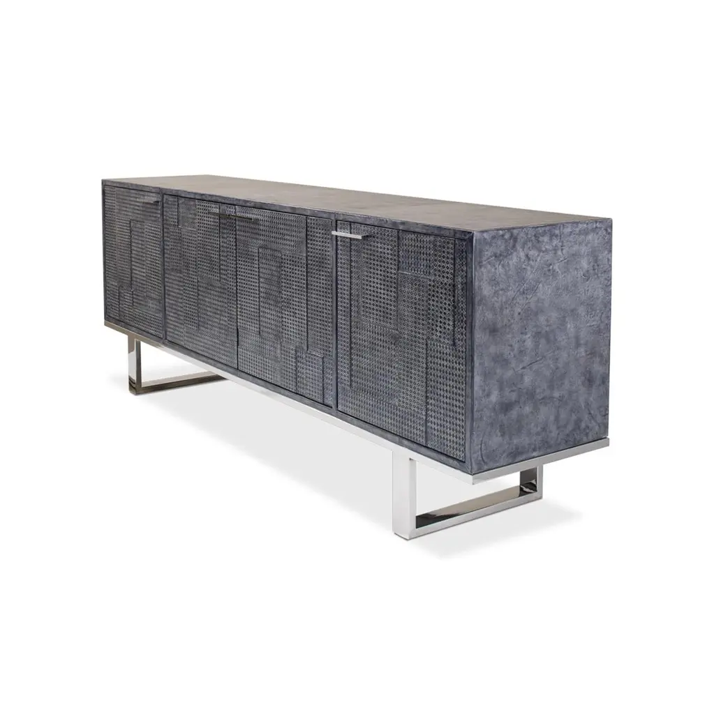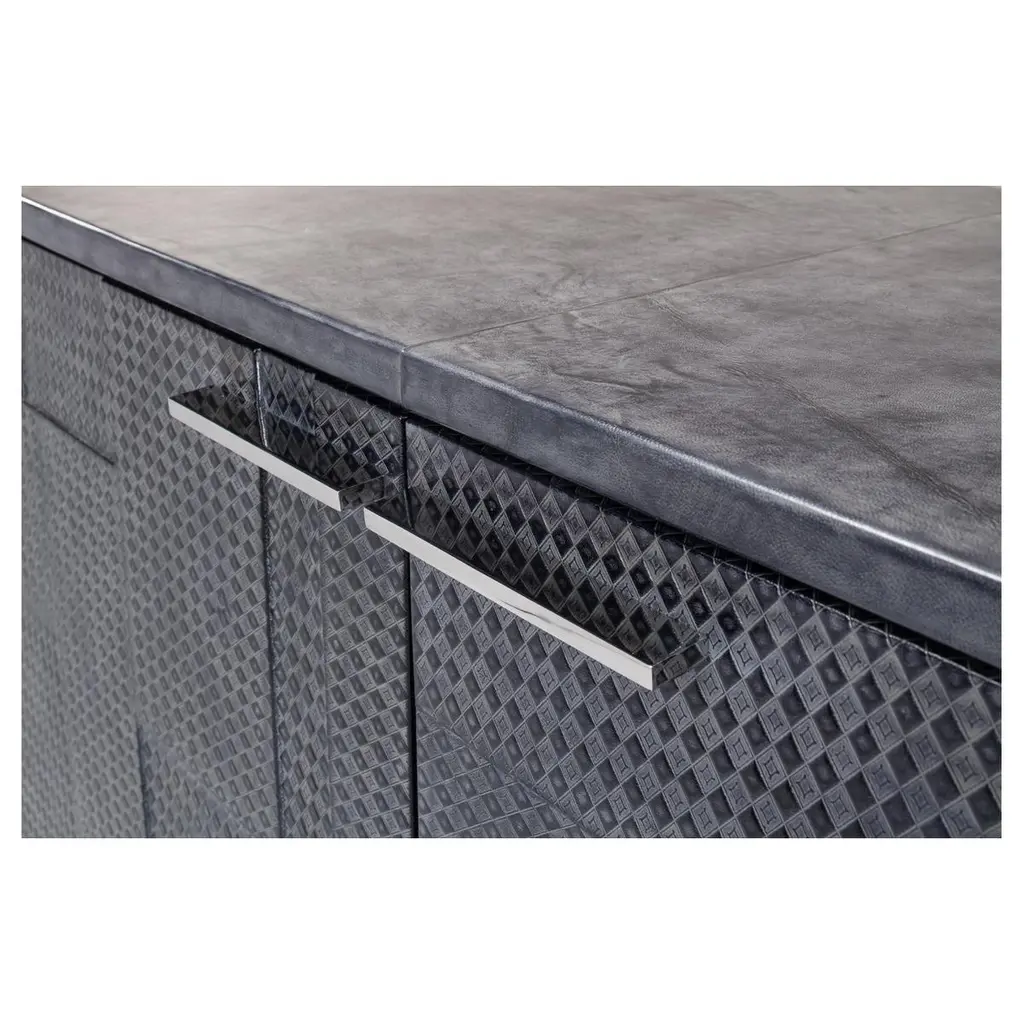 Modern Italian leather wrapped credenza, with an embossed grey/blue leather wrapped around the four-door cabinet with a natural wood finish interior and raised on stainless steel finish iron base.Dimensions: 94" W x 20" D x 34" H.