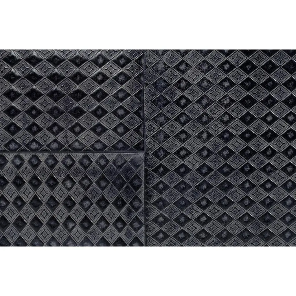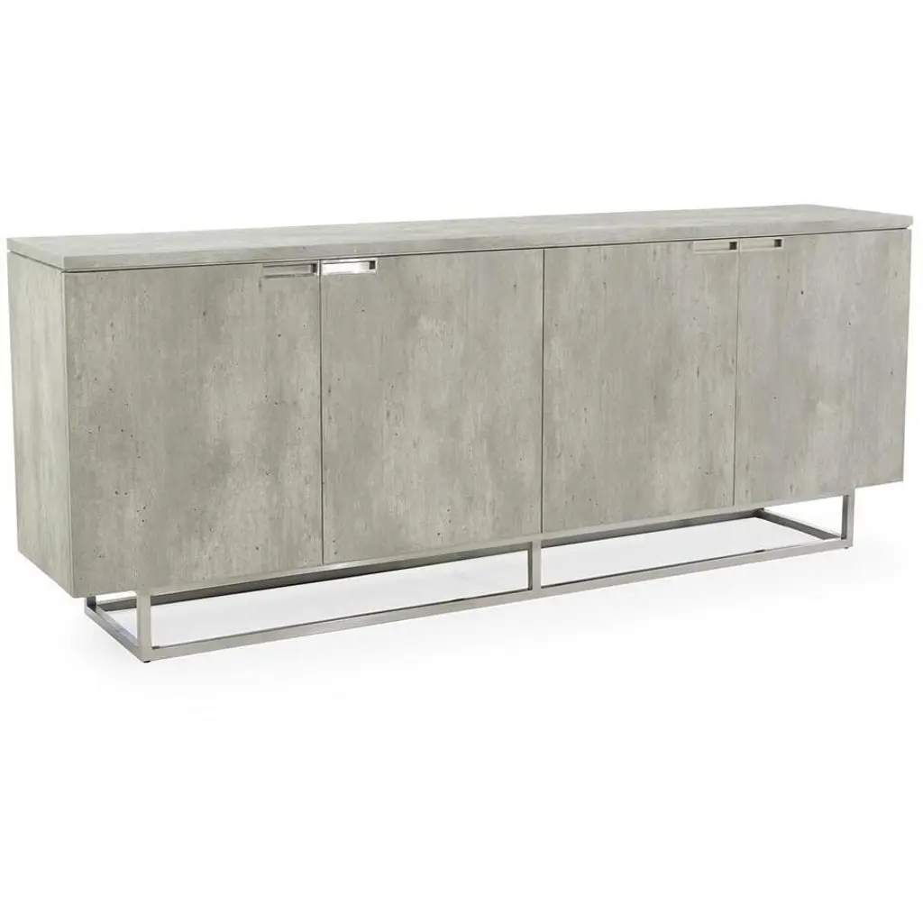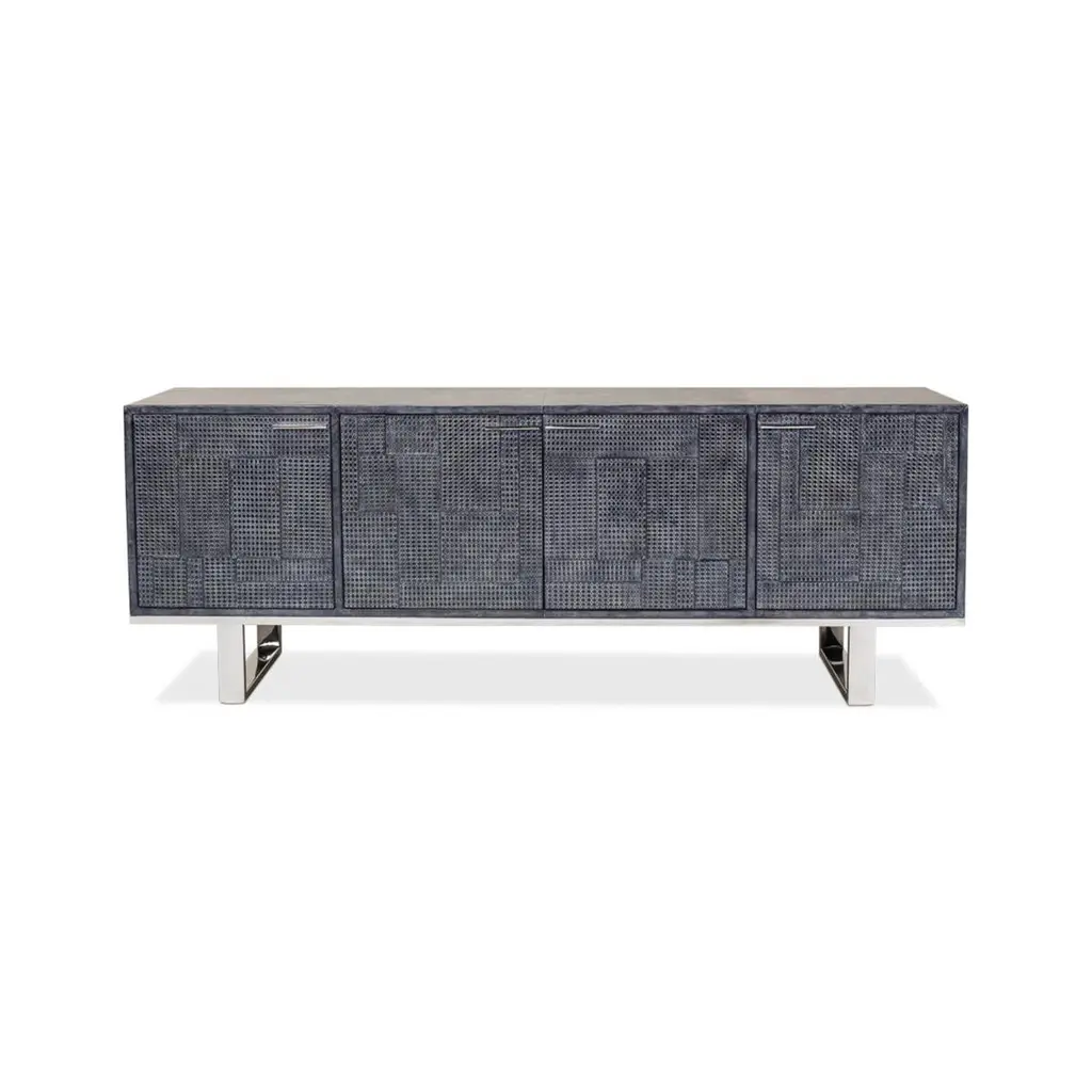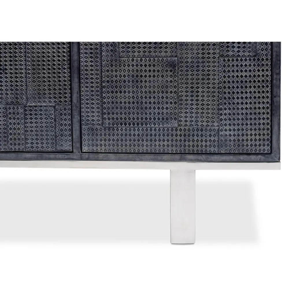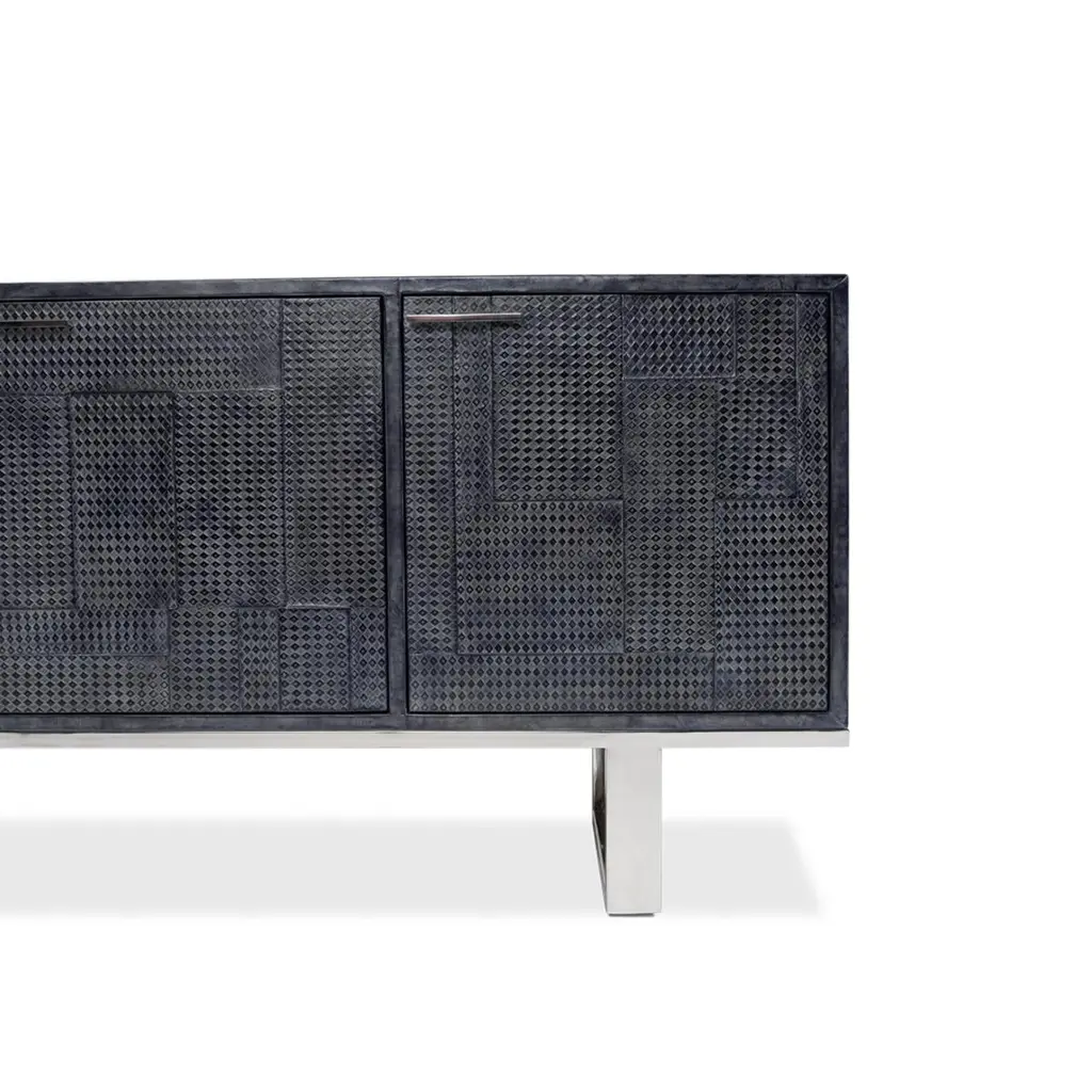 Modern Italian leather wrapped credenza, with an embossed grey/blue leather wrapped around the four-door cabinet with a natural wood finish interior and raised on stainless steel finish iron base.Dimensions: 94" W x 20" D x 34" H.