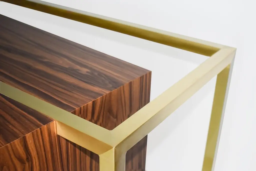 The Credenza Sideboard ExCentric 2.0 listed here is made of walnut wood and brushed brass. However, we can produce this in customised options: Structure and handles: Stainless steel (polished or brushed); brass (polished or brushed).Body: Another kind of wood (ebony macassar, tineo, black oak, ironwood).Interiors: Oak wood. Shelves are available by request.Custom dimensions are only available after analysis.Its elegant and sophisticated design makes it perfect for contemporary living spaces or office rooms. This piece would make the ideal companion to an ExCentric 2.0 Executive Desk.Assembled piece. Given the weight and size, it will be delivered in a wooden box packed in bubble wrap.You can try it in your space using Augmented Reality on your mobile phone (available on our website, ExCentric 2.0 Collection).This piece is entirely made in Portugal and manufactured artisanally. The author carefully executed or supervised every process step in a small workshop context.Labour of love from Portugal.Designer/Author - Joao Faria/Emotional Objects.Manufacturer - Joao Faria/Emotional Objects.At Emotional Objects, we don't follow trends or fashion. Instead, we create distinct and timeless objects with solid ideas and concepts. Every Emotional Object has a meaningful story behind it. Made to last for generations, we proudly see our objects as future furniture classics that will stand the test of time.Working in Portugal with the best artisans, the distinction between functional and fine art is difficult to find in Joao Faria's work. He uses the finest materials and techniques, but, most importantly, he only makes pieces he would want for himself.Art Furniture, Unique, Tailored, Emotional, Truly Yours.