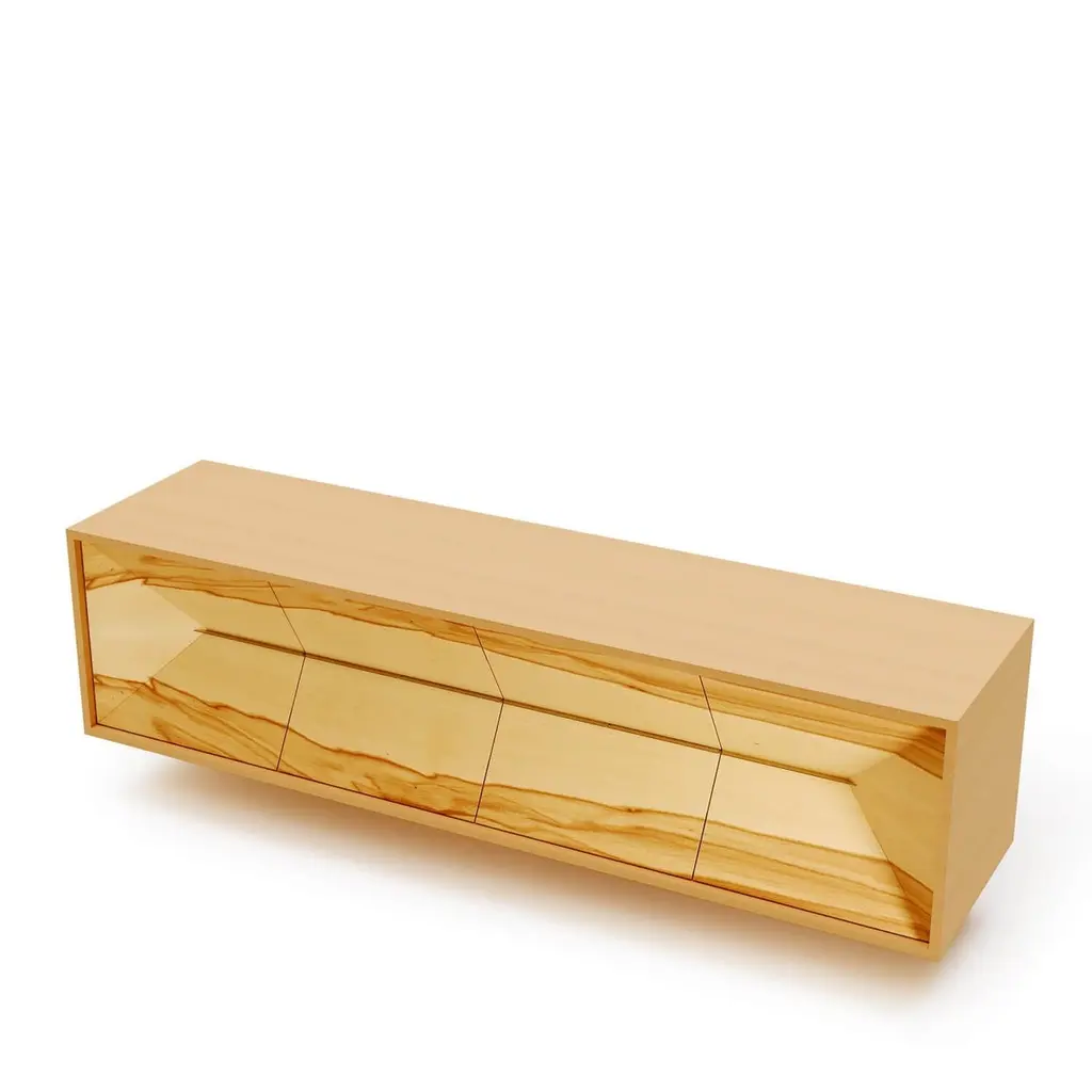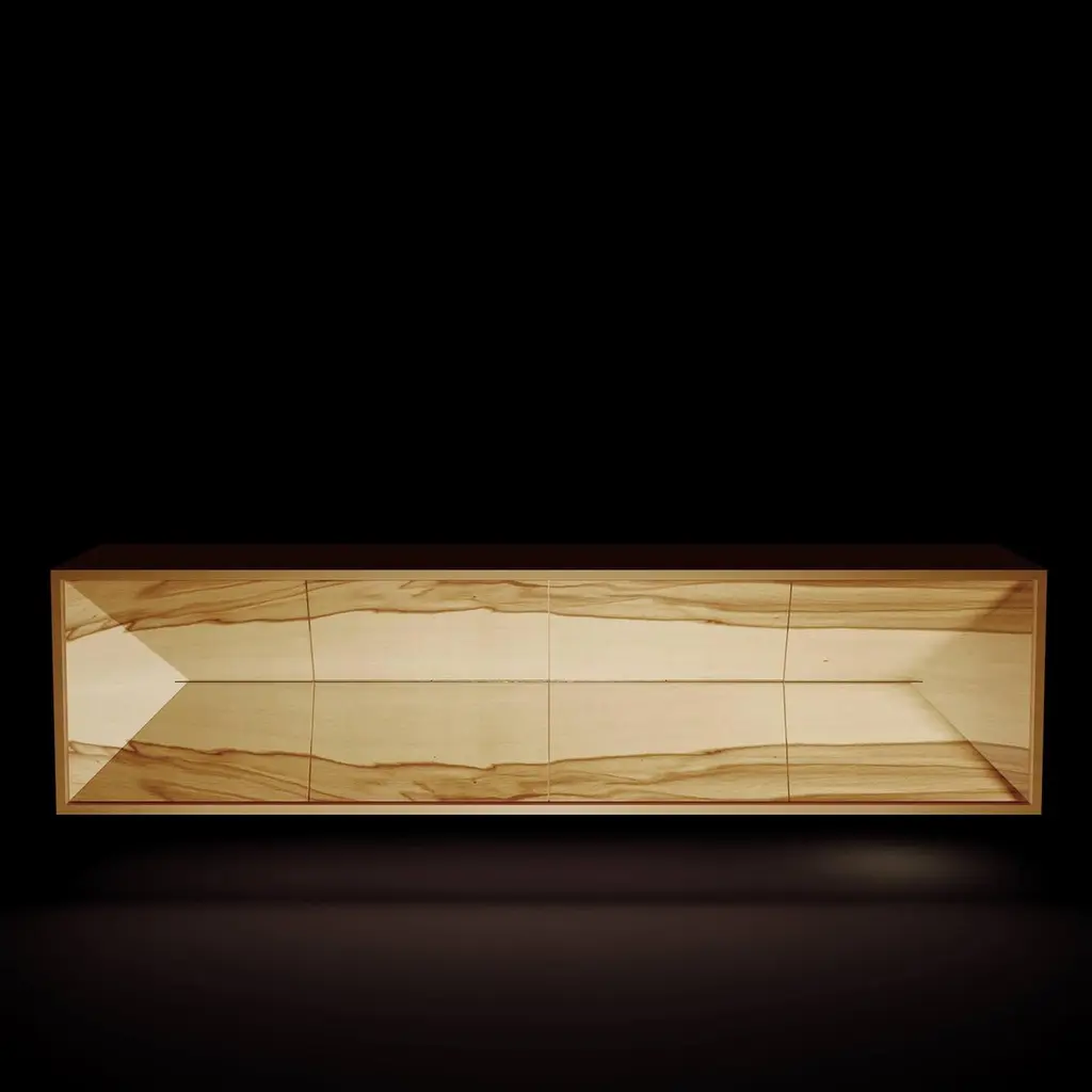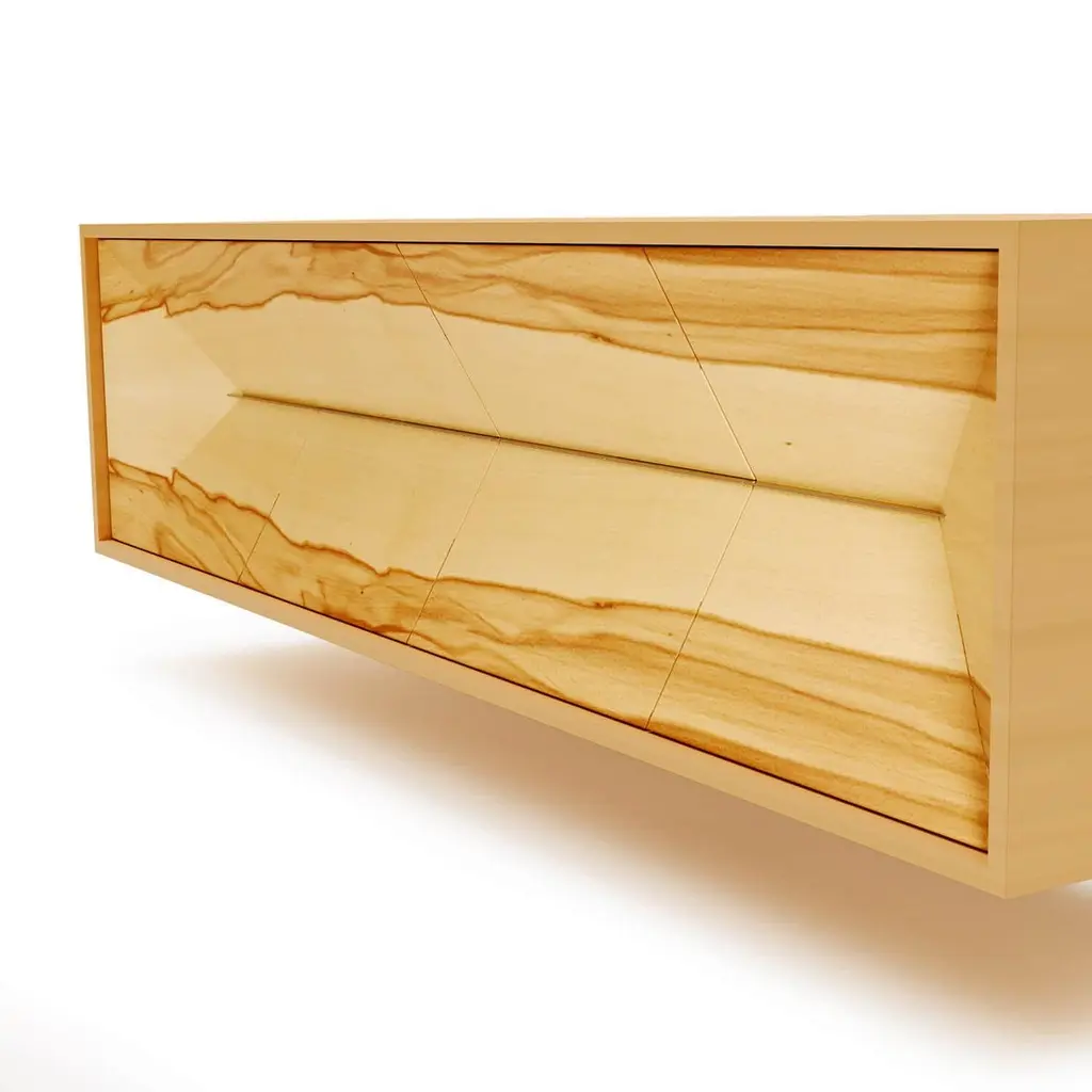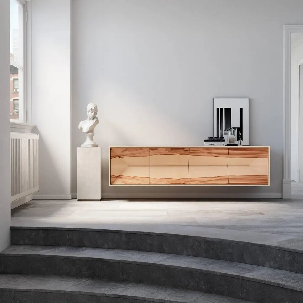 The Credenza Sideboard Convex is made to last for generations and features exquisite wood veneers that beautifully balance simplicity in form.This sideboard is suspended and includes both drawers and doors.Front: SatinwoodSides and top: Red GumwoodInteriors: Birdseye Maple woodHandles: Brushed Stainless SteelYou can experience this piece in your space using Augmented Reality on your mobile phone (available in the Convex Collection on our website).The piece is fully assembled and delivered in a wooden box, securely packed with bubble wrap.This piece is entirely manufactured in Portugal and mastercrafted artisanally. The author carefully executed or supervised every process step in a small workshop context.Labour of love from Portugal.Designer/Author - Joao Faria/Emotional Objects.Manufacturer - Joao Faria/Emotional Objects.At Emotional Objects, we don't follow trends or fashion. Instead, we create distinct and timeless objects with solid ideas and concepts. Every Emotional Object has a meaningful story behind it. Made to last for generations, we proudly see our objects as future furniture classics that will stand the test of time.Working in Portugal with the best artisans, Joao Faria's work is difficult to distinguish between functional and fine art. He uses the finest materials and techniques, but most importantly, he only makes pieces he would want for himself.Art Furniture, Unique, Tailored, Emotional, Truly Yours.