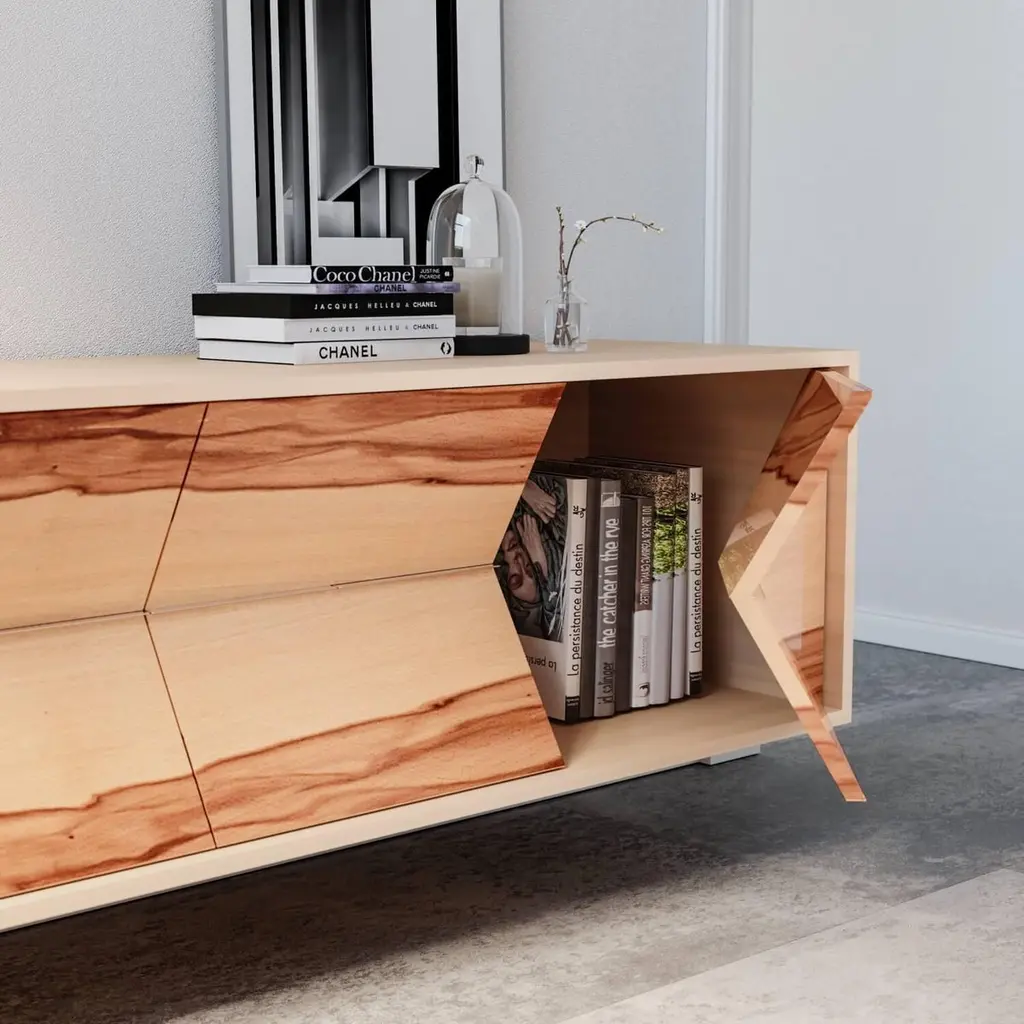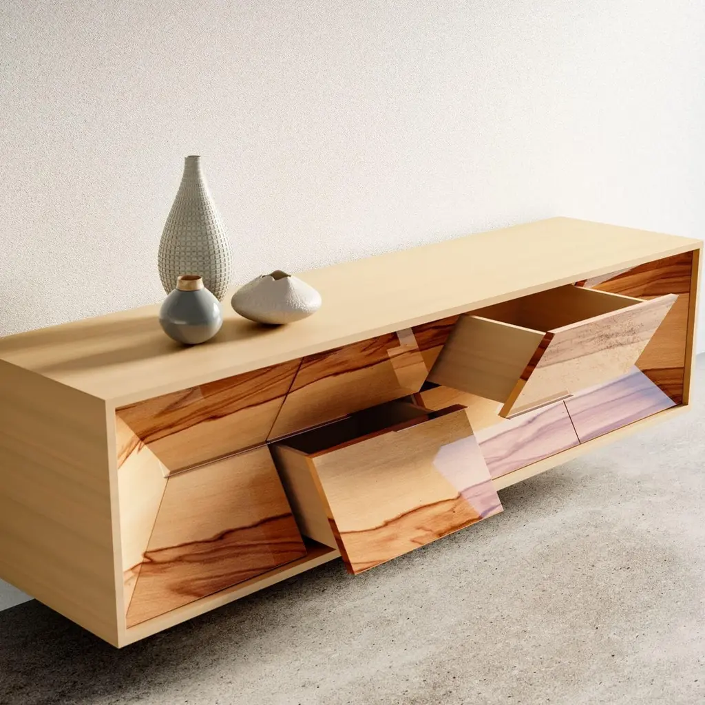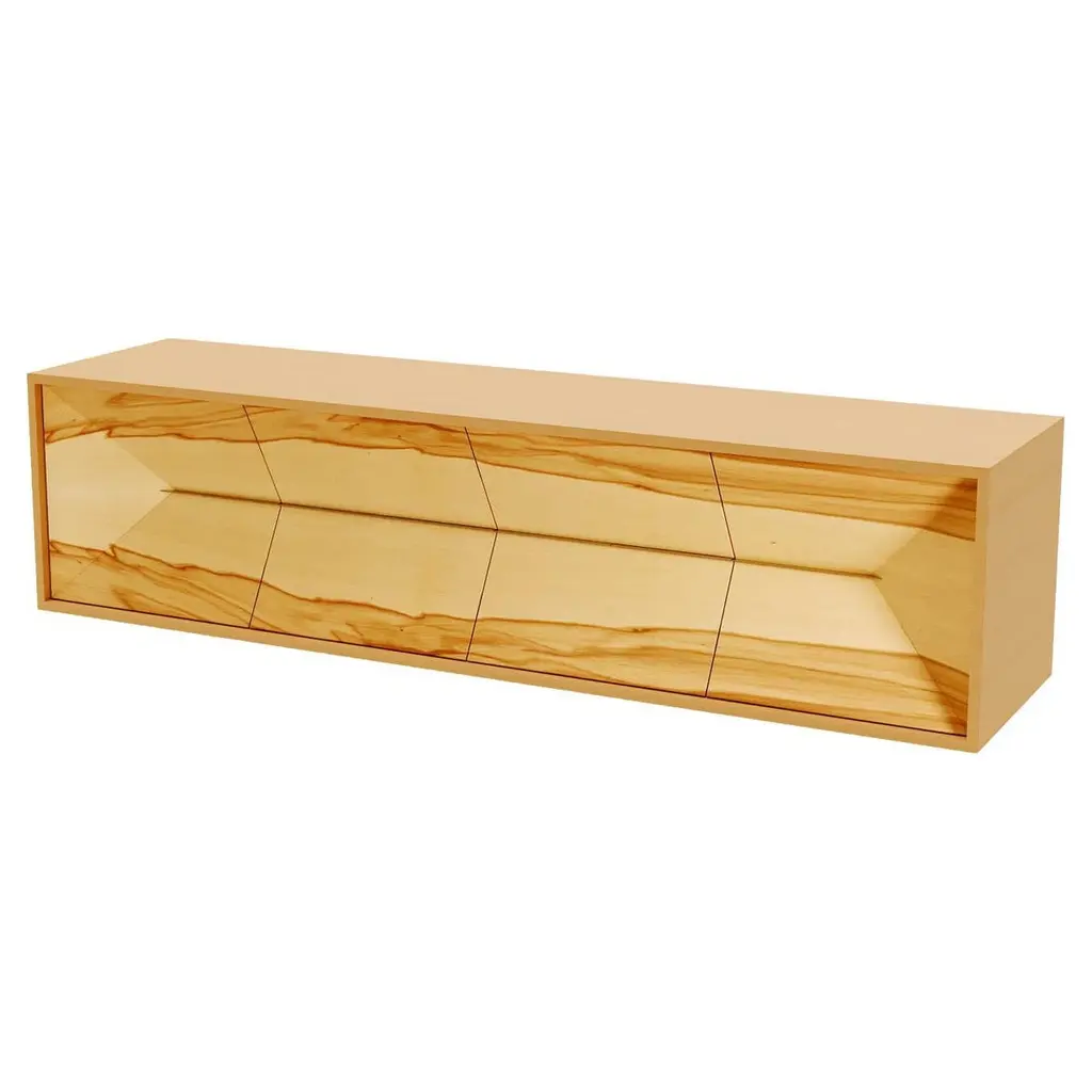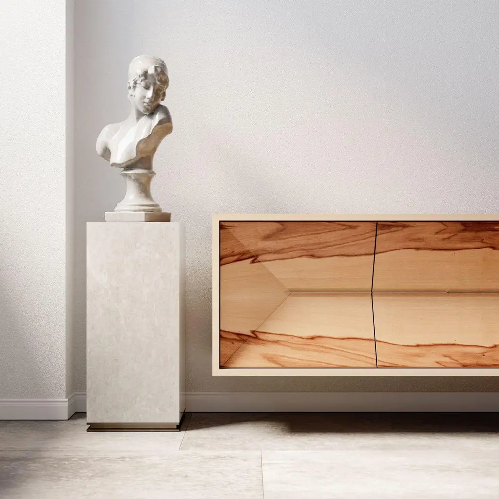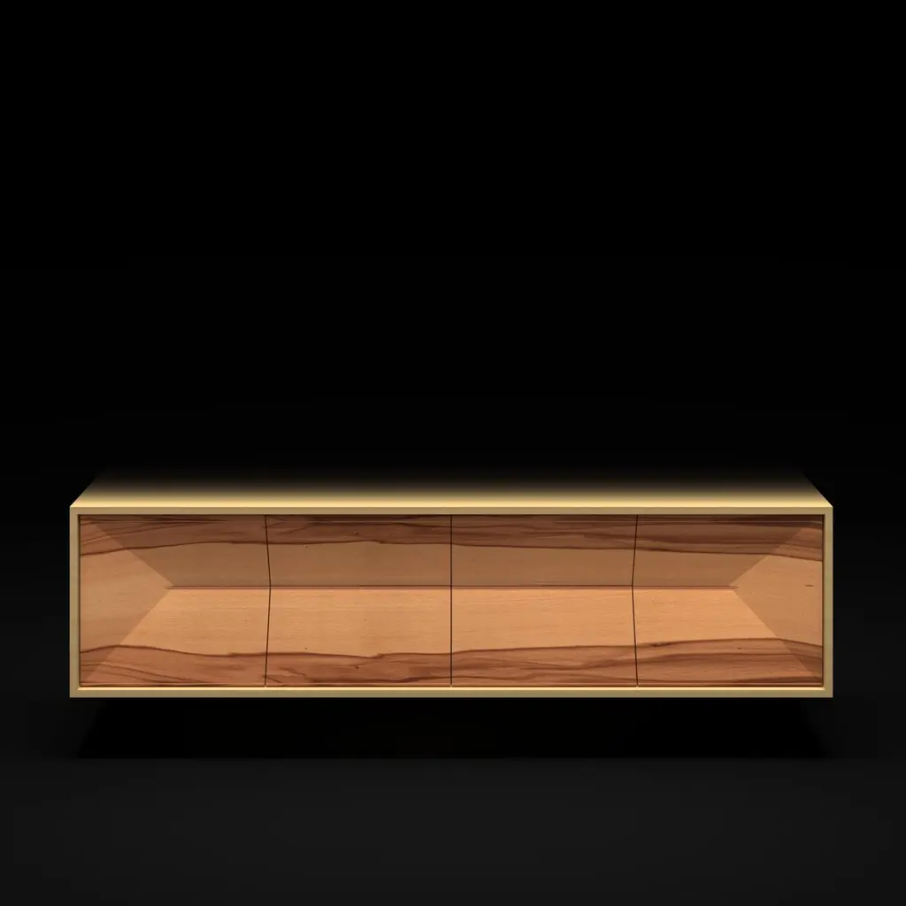 The Credenza Sideboard Convex is made to last for generations and features exquisite wood veneers that beautifully balance simplicity in form.This sideboard is suspended and includes both drawers and doors.Front: SatinwoodSides and top: Red GumwoodInteriors: Birdseye Maple woodHandles: Brushed Stainless SteelYou can experience this piece in your space using Augmented Reality on your mobile phone (available in the Convex Collection on our website).The piece is fully assembled and delivered in a wooden box, securely packed with bubble wrap.This piece is entirely manufactured in Portugal and mastercrafted artisanally. The author carefully executed or supervised every process step in a small workshop context.Labour of love from Portugal.Designer/Author - Joao Faria/Emotional Objects.Manufacturer - Joao Faria/Emotional Objects.At Emotional Objects, we don't follow trends or fashion. Instead, we create distinct and timeless objects with solid ideas and concepts. Every Emotional Object has a meaningful story behind it. Made to last for generations, we proudly see our objects as future furniture classics that will stand the test of time.Working in Portugal with the best artisans, Joao Faria's work is difficult to distinguish between functional and fine art. He uses the finest materials and techniques, but most importantly, he only makes pieces he would want for himself.Art Furniture, Unique, Tailored, Emotional, Truly Yours.