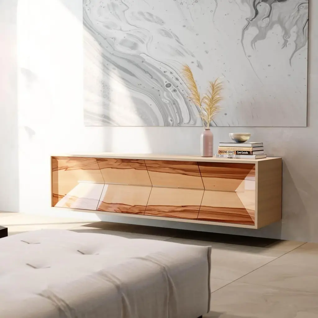 Modern Minimalist Suspended Credenza Sideboard Satinwood Brushed Stainless Steel