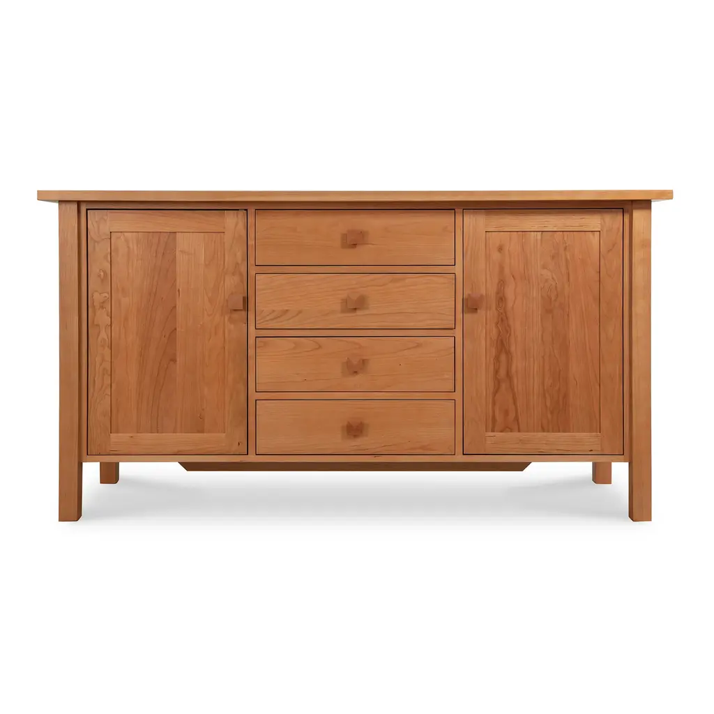The clean lines and modern styling of this high-end Modern Mission Sideboard-Buffet are perfect for the contemporary dining room! Handmade in beautiful Vermont by traditional furniture makers, this sideboard will add warmth and style to any room!Base price represents sideboard in natural cherryShown in natural cherry wood Matching furniture available in our Modern Mission Furniture Collection