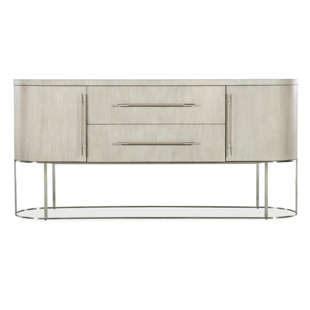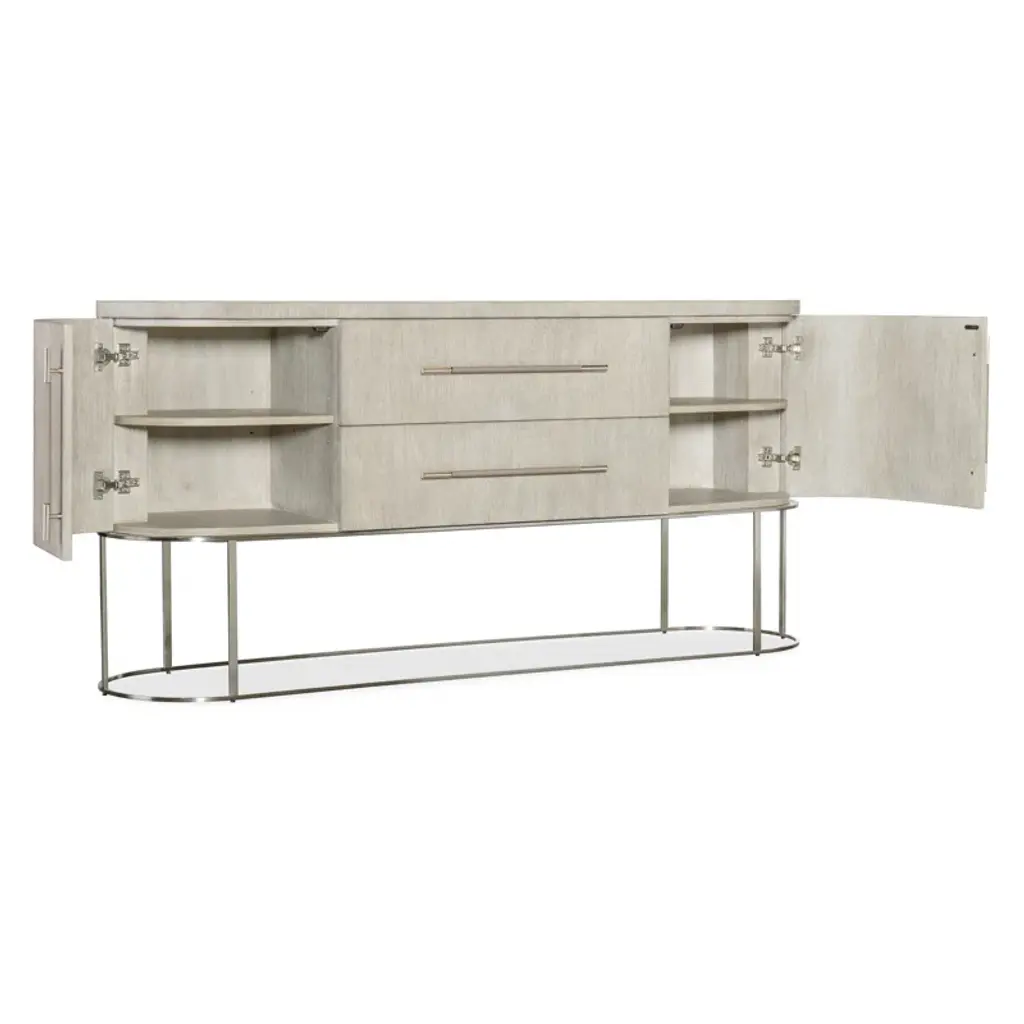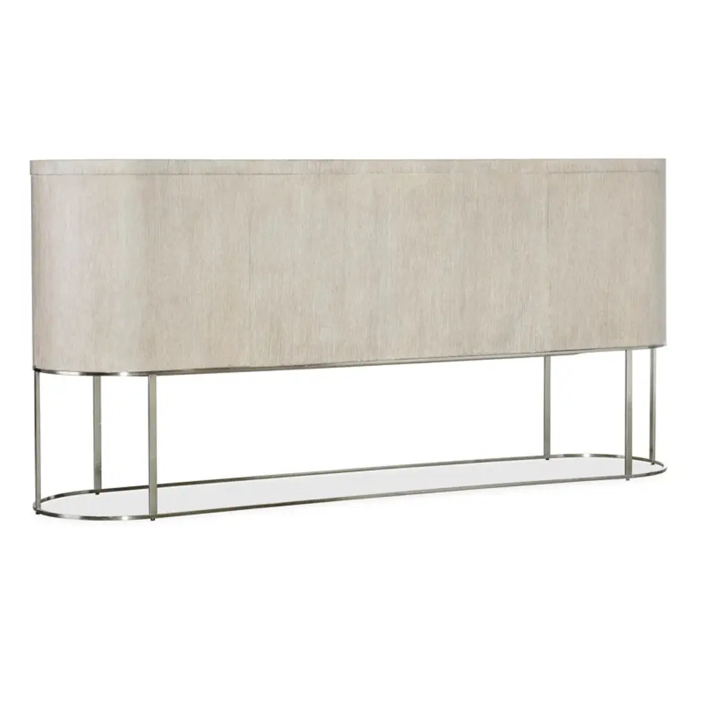 Sleek and stunning with a timeless sophistication and soft modern aesthetic, the Modern Mood sideboard combines flat-cut quartered oak veneers with raffia-wrapped doors, and warm pewter brushed metal bar pull accents. Features include 4 doors with soft-close hinges and magnetic catches, adjustable wood shelves behind each pair of doors, ventilated back panels wire management holes in the back panel, and a 3-plug electrical outlet behind the right-side doors. Unbound by geographical design, Modern Mood presents itself as an evolution of design choices, spanning a variety of decades and design movements, while maintaining an unmistakably modern aesthetic that transcends time. The 90-piece collection includes a bedroom, dining room, home office, accent, and occasional items characterized by substantive forms with soft architectural details. Elevated materials and brushed metal are evident throughout the collection.