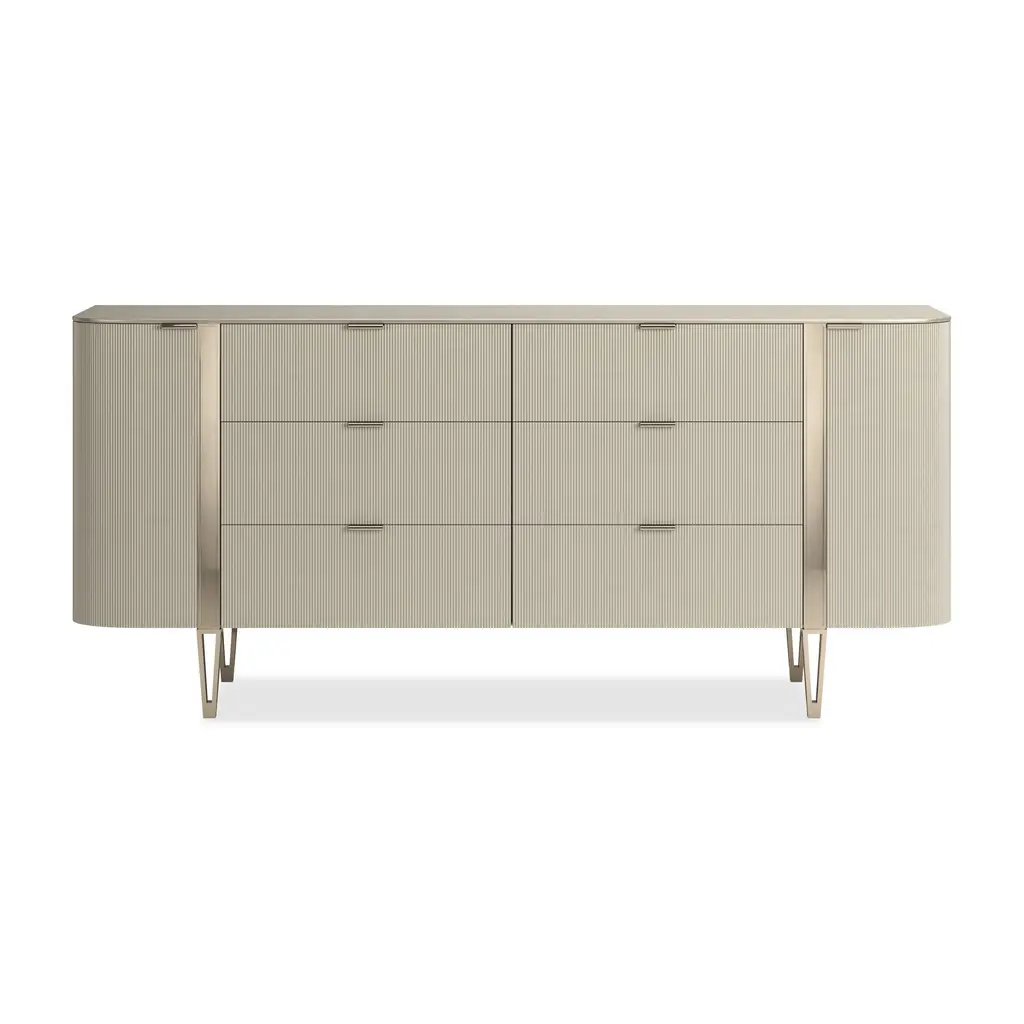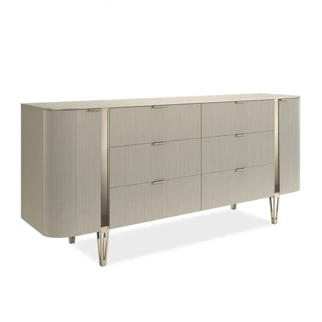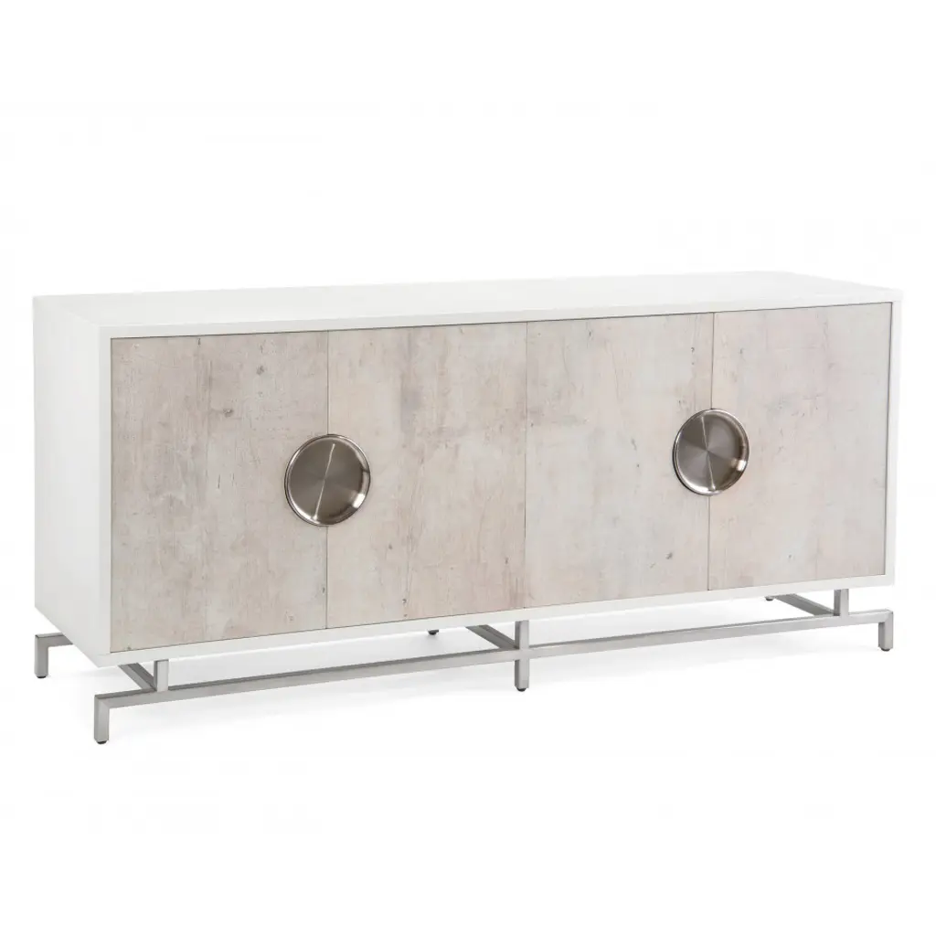 Sleek and stunning with a timeless sophistication and soft modern aesthetic, the Modern Mood sideboard combines flat-cut quartered oak veneers with raffia-wrapped doors, and warm pewter brushed metal bar pull accents. Features include 4 doors with soft-close hinges and magnetic catches, adjustable wood shelves behind each pair of doors, ventilated back panels wire management holes in the back panel, and a 3-plug electrical outlet behind the right-side doors. Unbound by geographical design, Modern Mood presents itself as an evolution of design choices, spanning a variety of decades and design movements, while maintaining an unmistakably modern aesthetic that transcends time. The 90-piece collection includes a bedroom, dining room, home office, accent, and occasional items characterized by substantive forms with soft architectural details. Elevated materials and brushed metal are evident throughout the collection.