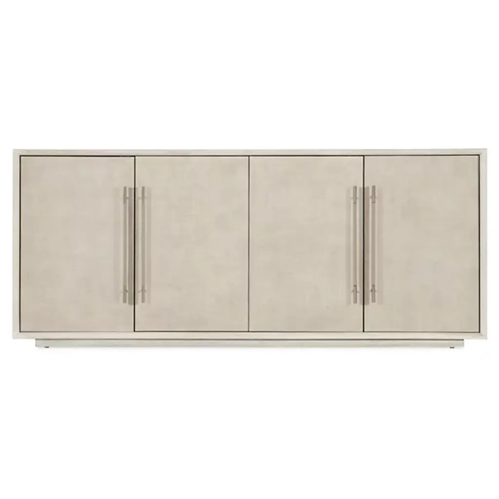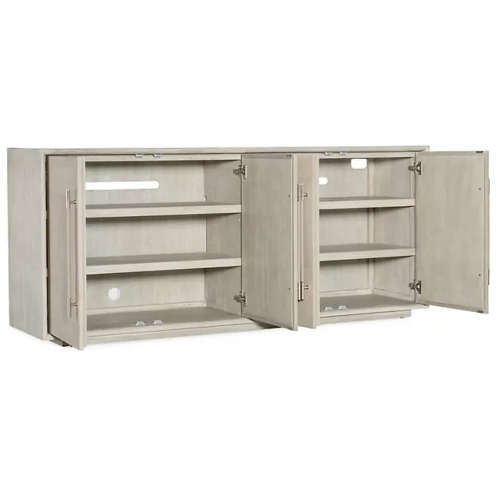 The Modern Mood Sideboard from Hooker Furniture blends soft, contemporary style with thoughtful function. Its clean lines and substantial form are paired with four soft-close drawers featuring magnetic catches. Inside, there are adjustable shelves, wire management, a ventilated back, and even a built-in three-plug outlet, perfect for modern living. Inspired by decades of design, this timeless piece offers a versatile aesthetic that effortlessly adapts to your space and lifestyle.