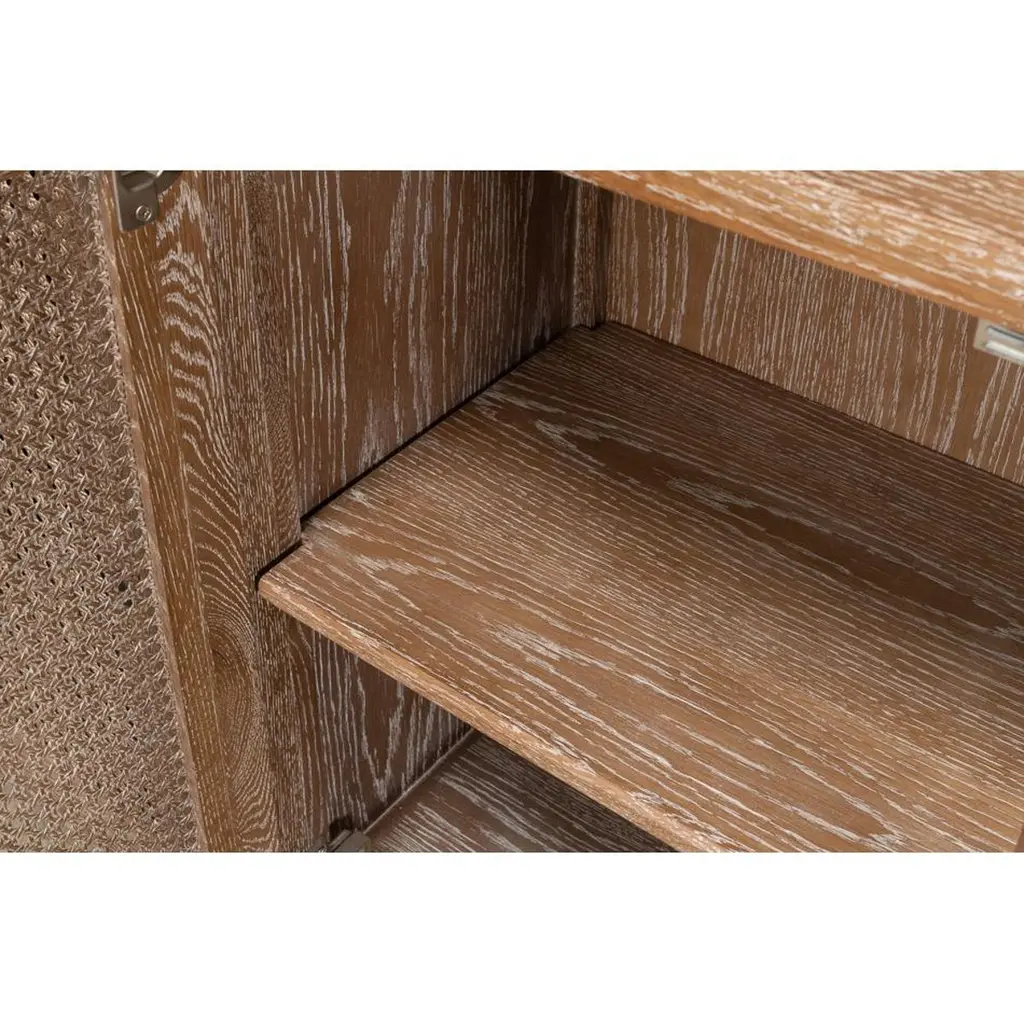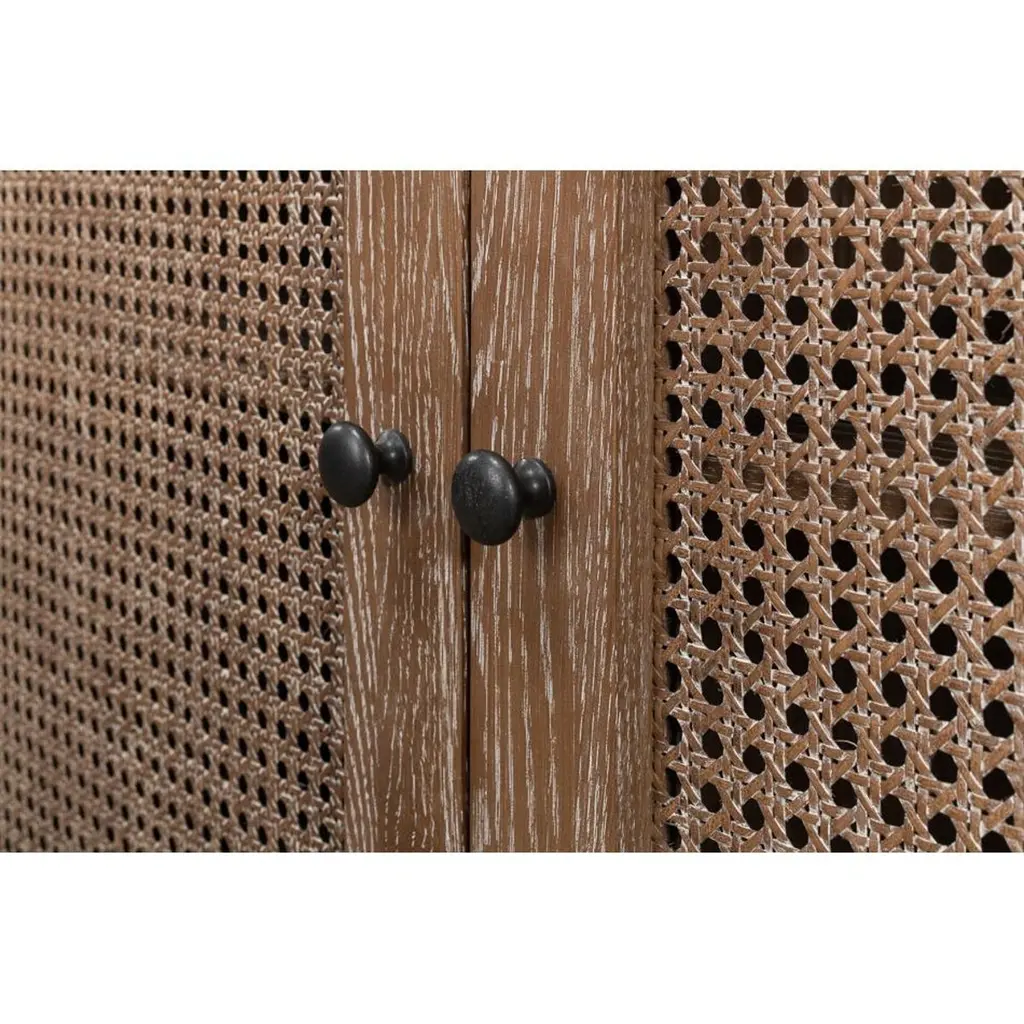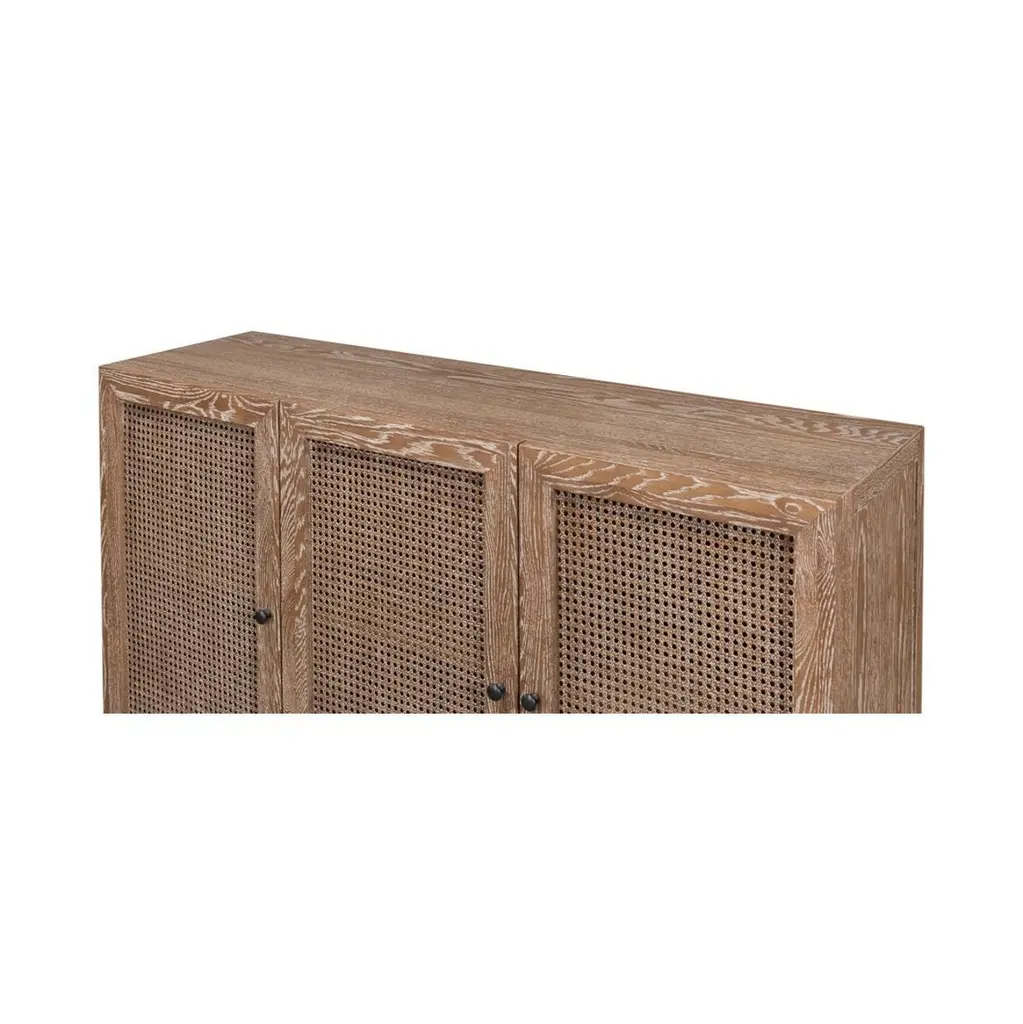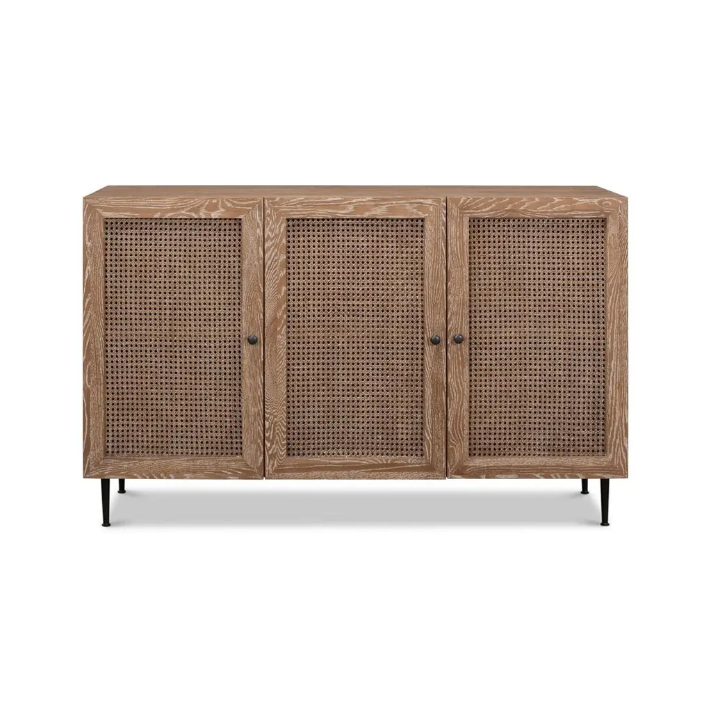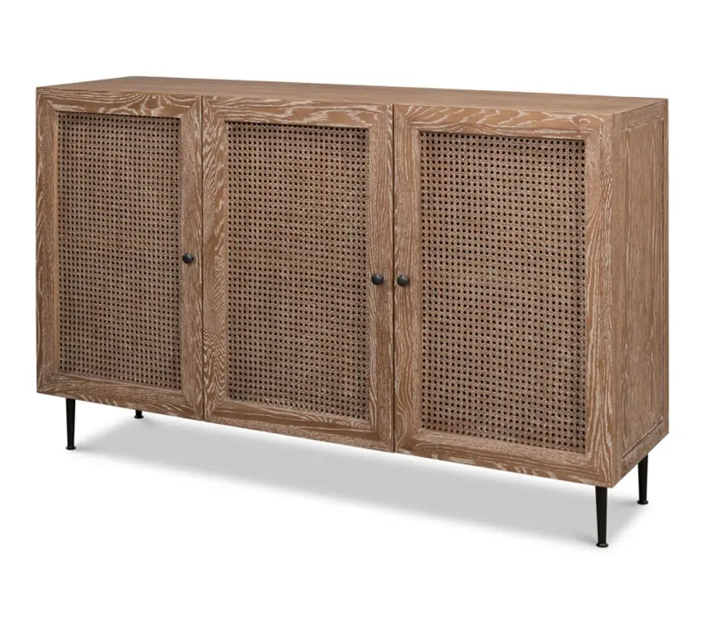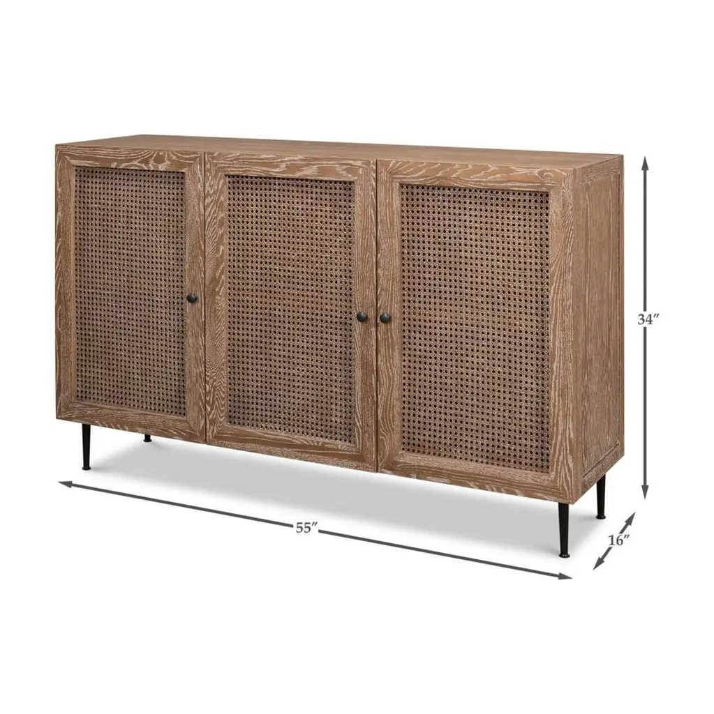 This beautifully crafted buffet sideboard exudes an air of understated elegance with its natural wood grain whitewash oak finish and woven cane detail panel door. Supported by slender yet sturdy black metal legs, it offers a modern twist on a classic design. With ample storage space behind its three charming doors, this sideboard is not only a feast for the eyes but also a practical solution to your organizational needs. Make a statement in your dining area or living room with this exquisite fusion of form and function.Dimensions: 55" W x 16" D x 34" H