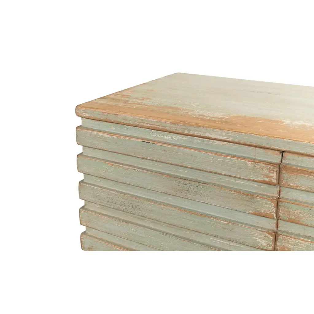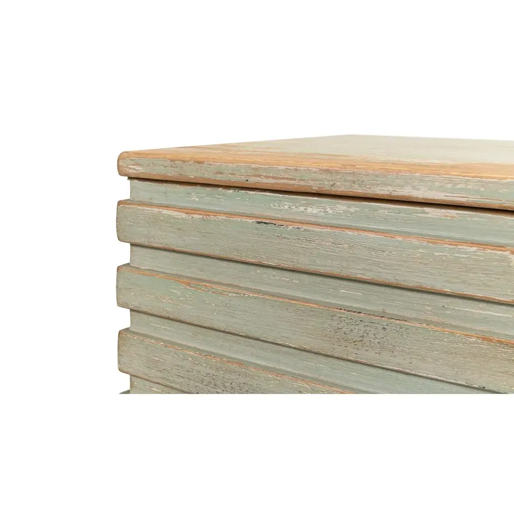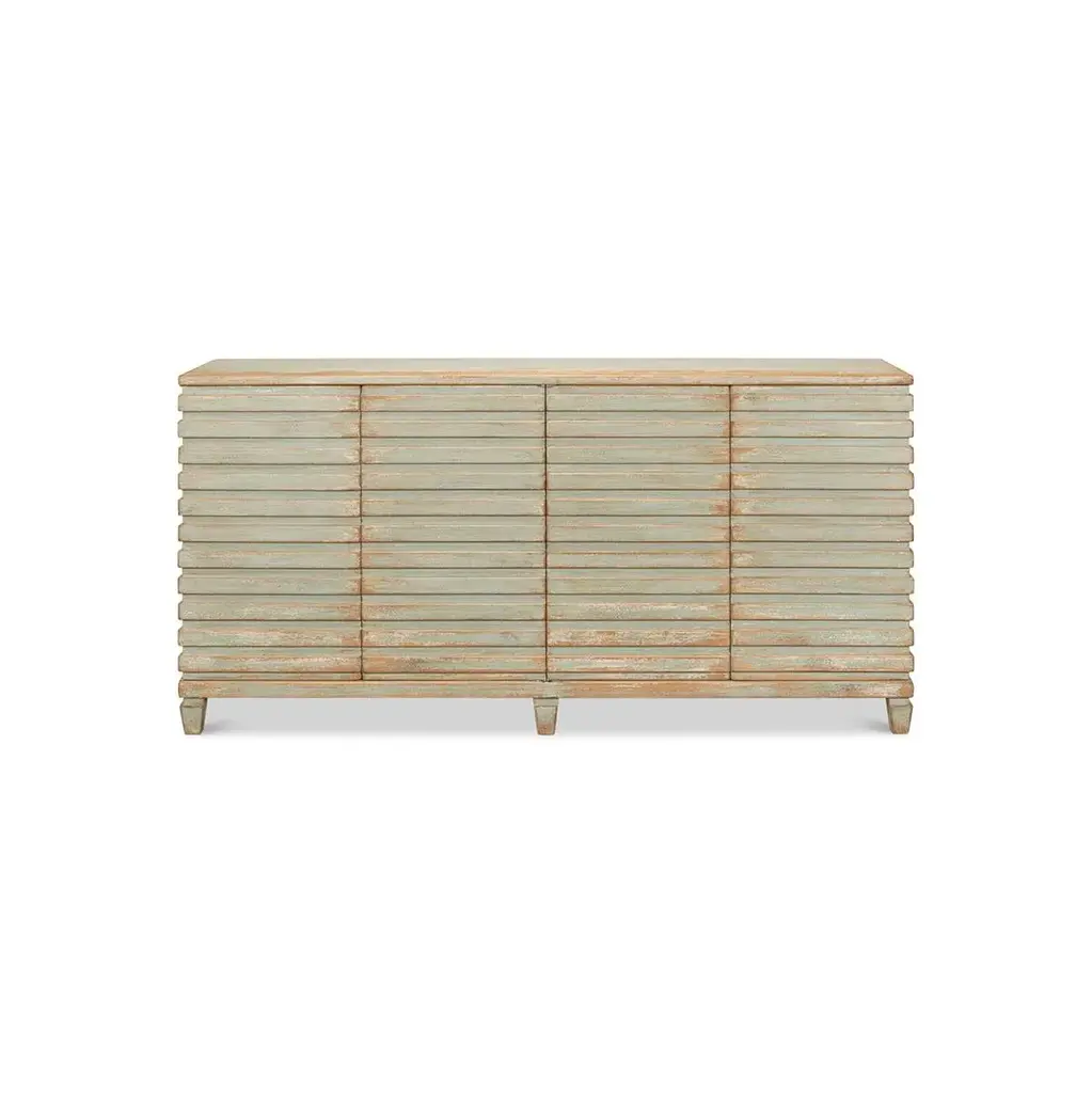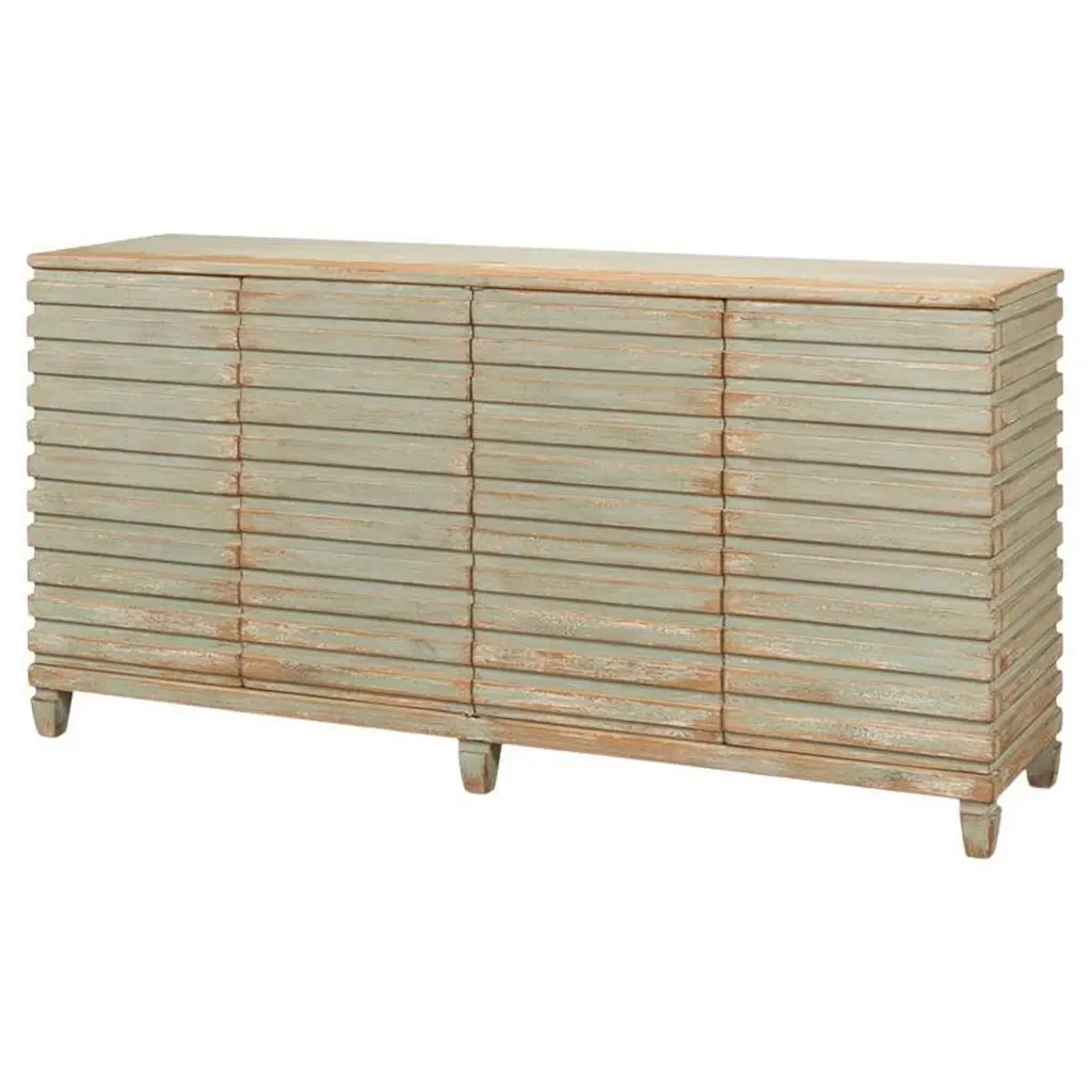 Modern Ribbed Sideboard of pine in an antiqued hand-rubbed sage green finish. The buffet cabinet with four doors and interior shelves and a geometric ribbed design that wraps around each side, with square tapered legs. Dimensions: 72" W x 19" D x 35" H
