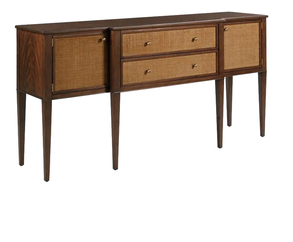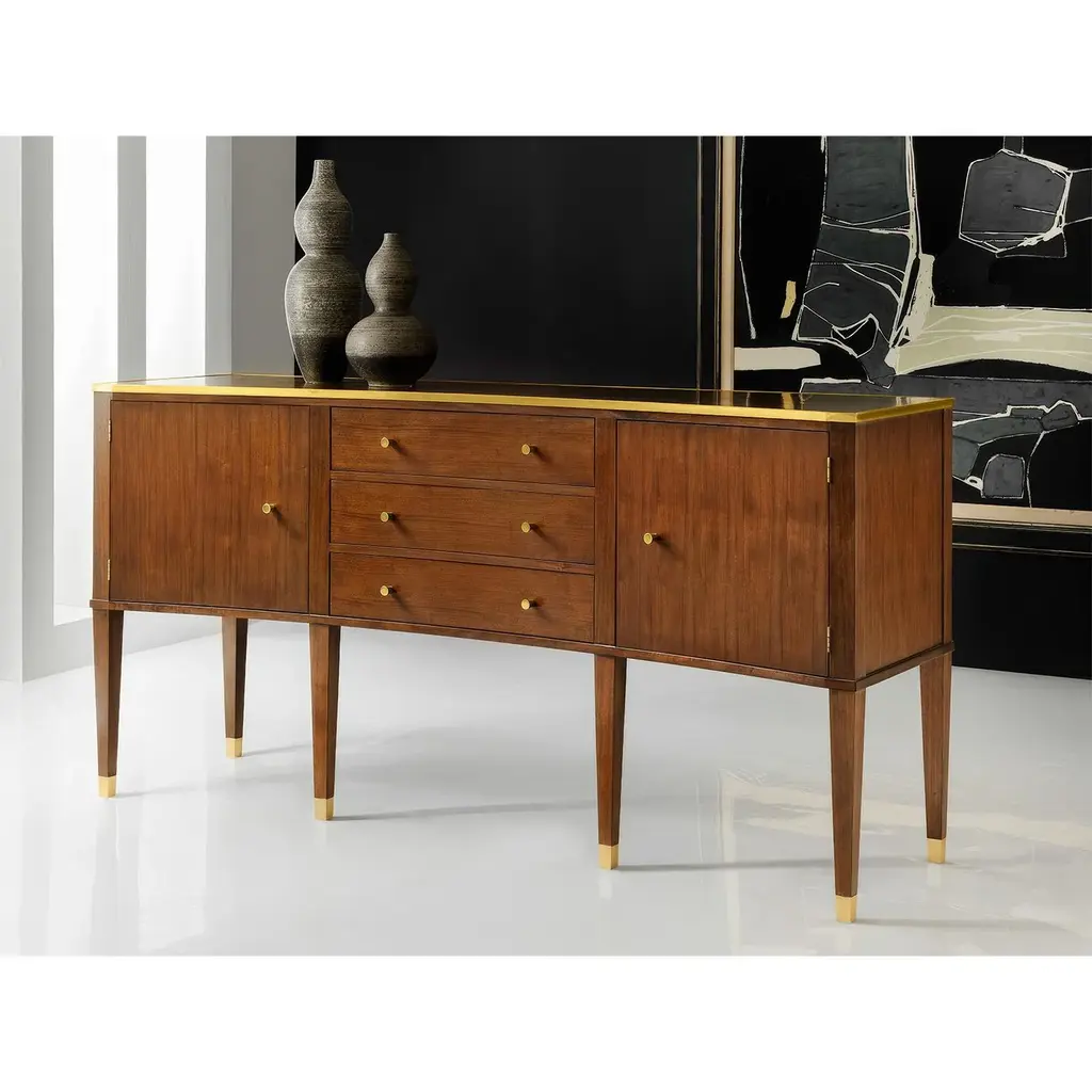 Crafted from rich walnut veneer, this sideboard boasts a sleek profile with clean lines, exuding timeless sophistication. Solid brass detailing adds a luxurious touch, from the drawer pulls to the elegantly tapered legs with brass-capped feet. Featuring three spacious drawers and two side cabinets, this sideboard offers ample storage for fine dining essentials or treasured décor pieces. Whether placed in a dining room, living space, or grand entryway, the sideboard is an exquisite statement of style and function. Dimensions: 80" W x 22" D x 40" H