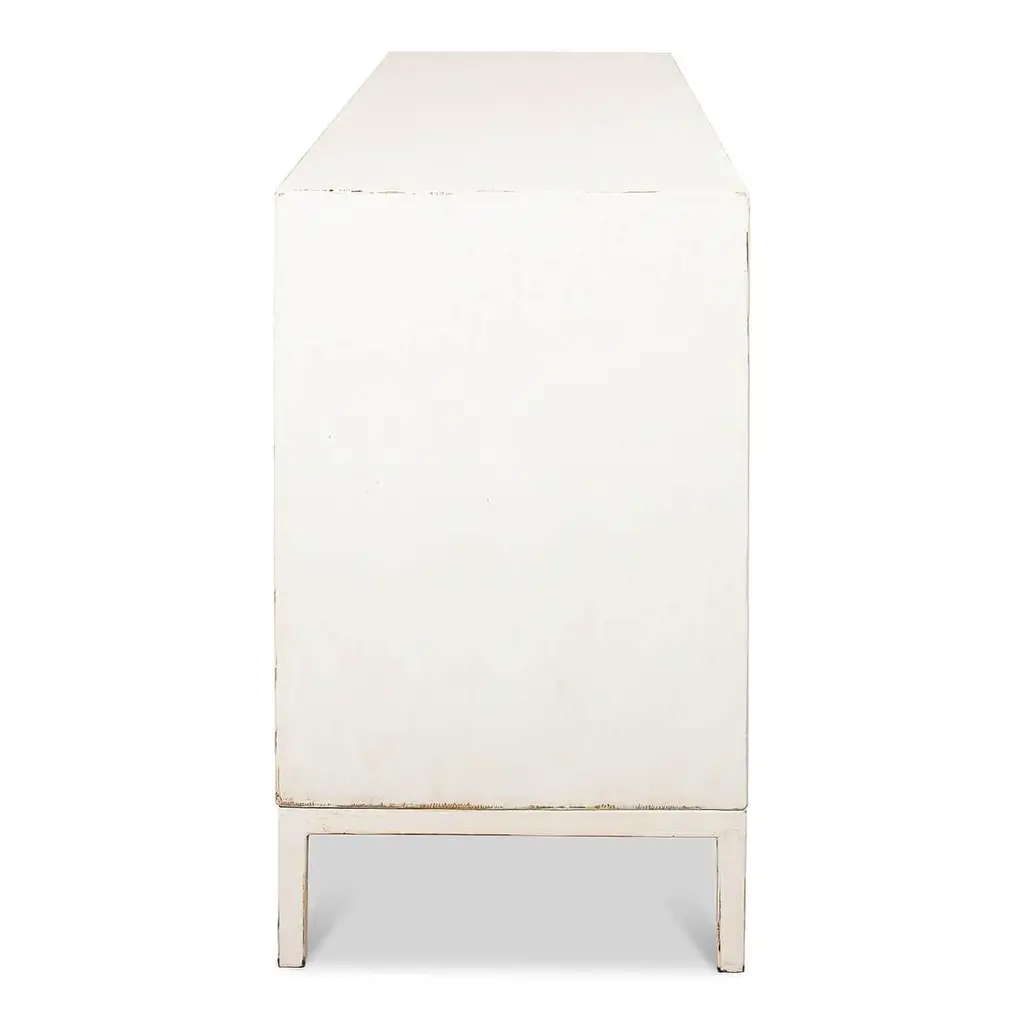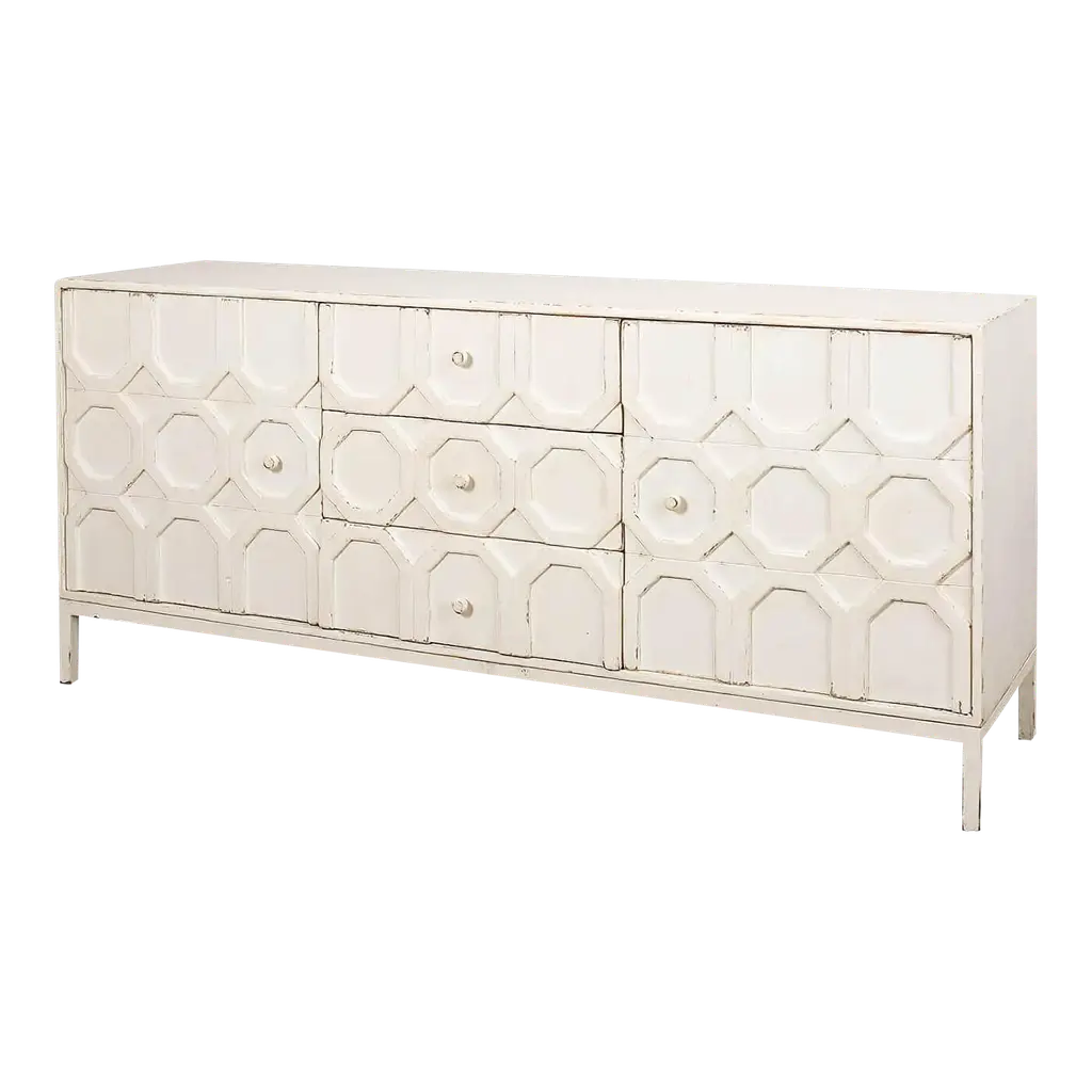 A modern geometric sideboard. This front has a unique applique design with patterns of octagons running down the center. It has two doors and a bank of three drawers in the center. This beautiful piece is crafted in pine and has a whitewash-painted and antiqued finish. Dimensions: 74" W x 20" D x 33" H.