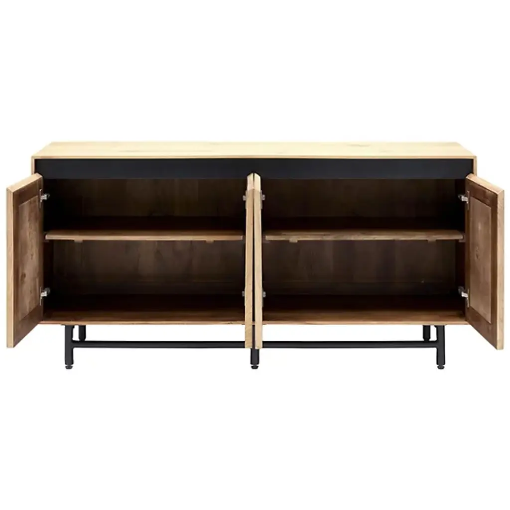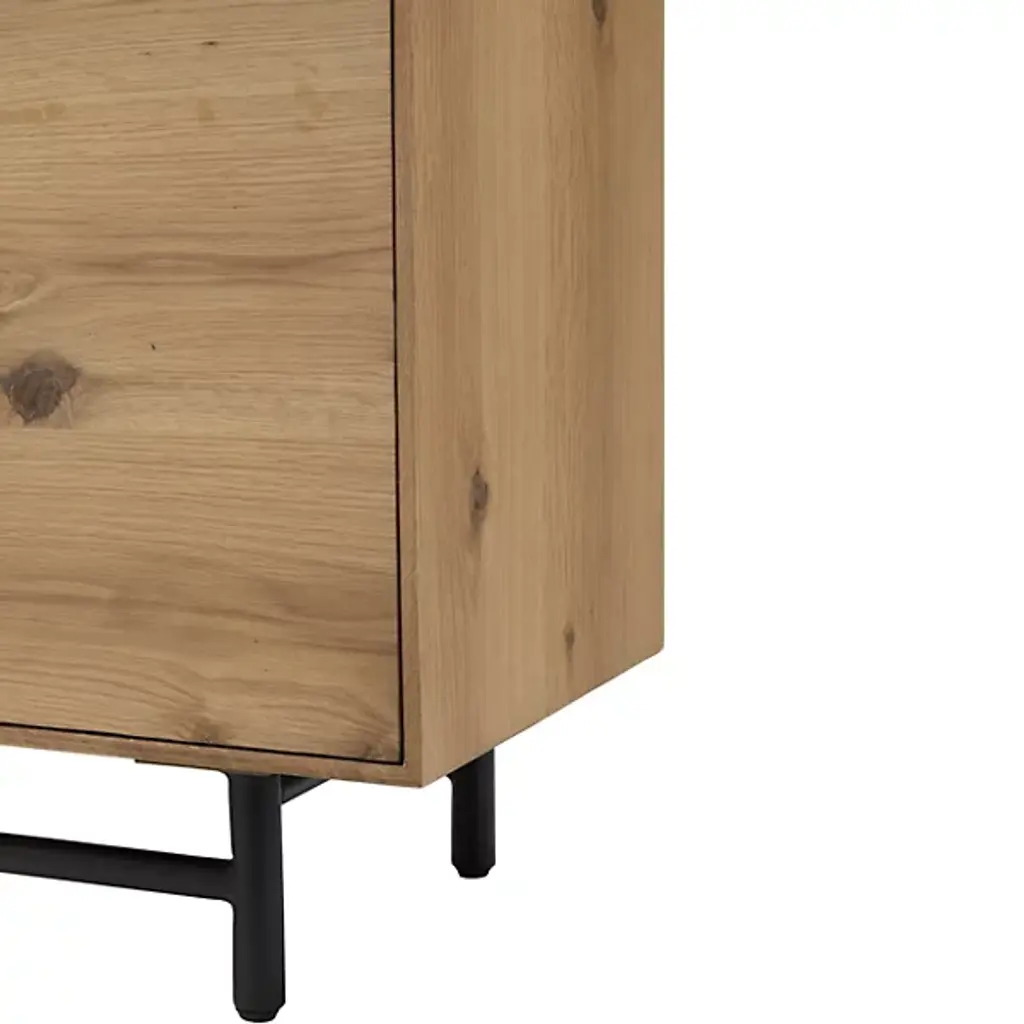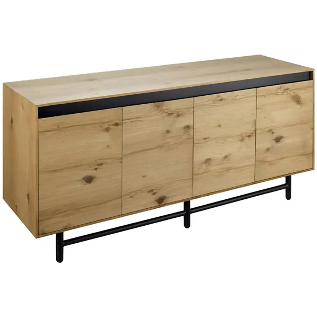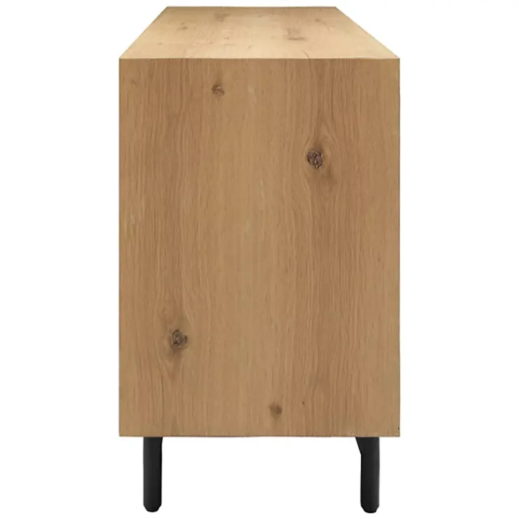 The Molander Sideboard from Surya celebrates the elegant intersection of Scandinavian minimalism and contemporary design. Masterfully crafted in India, this sophisticated storage solution features a striking oak veneer top suspended above a sleek powder-coated steel base. Ingeniously engineered with a strategic gap that allows four doors to open effortlessly, the piece puts the organic beauty of the natural woodgrain on full display. The black-painted legs ground the design with architectural precision, transforming storage into a sculptural statement that elevates any interior.
