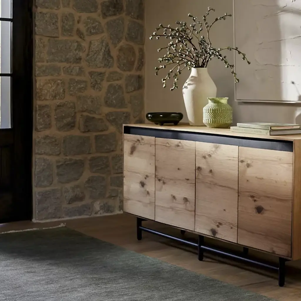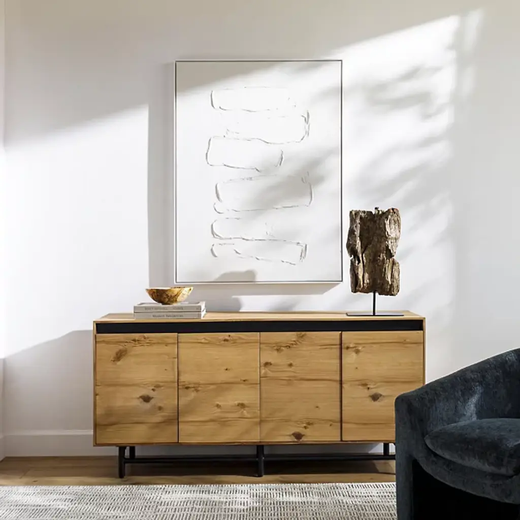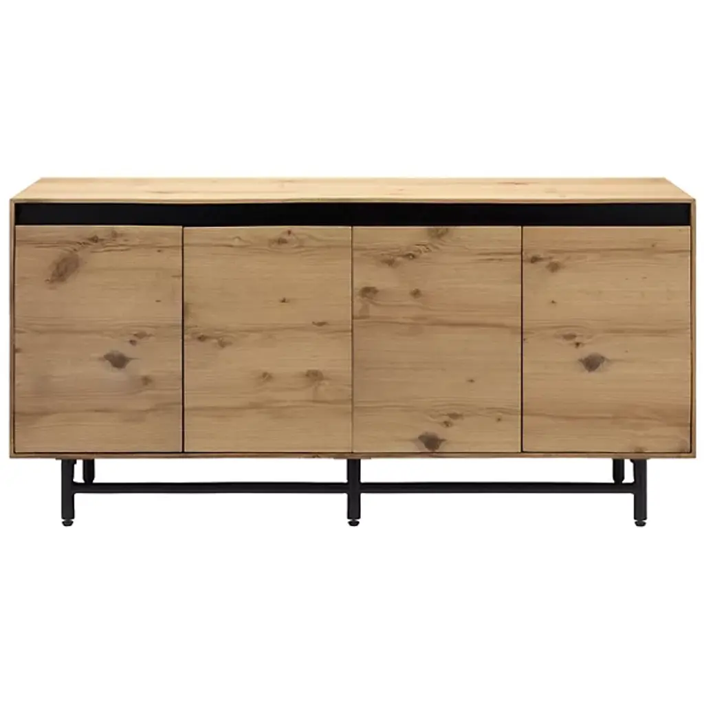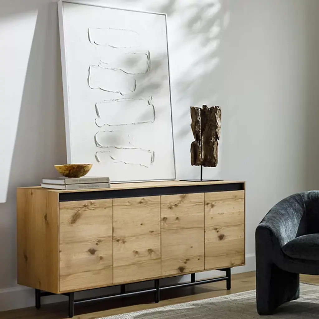 The Molander Sideboard from Surya celebrates the elegant intersection of Scandinavian minimalism and contemporary design. Masterfully crafted in India, this sophisticated storage solution features a striking oak veneer top suspended above a sleek powder-coated steel base. Ingeniously engineered with a strategic gap that allows four doors to open effortlessly, the piece puts the organic beauty of the natural woodgrain on full display. The black-painted legs ground the design with architectural precision, transforming storage into a sculptural statement that elevates any interior.