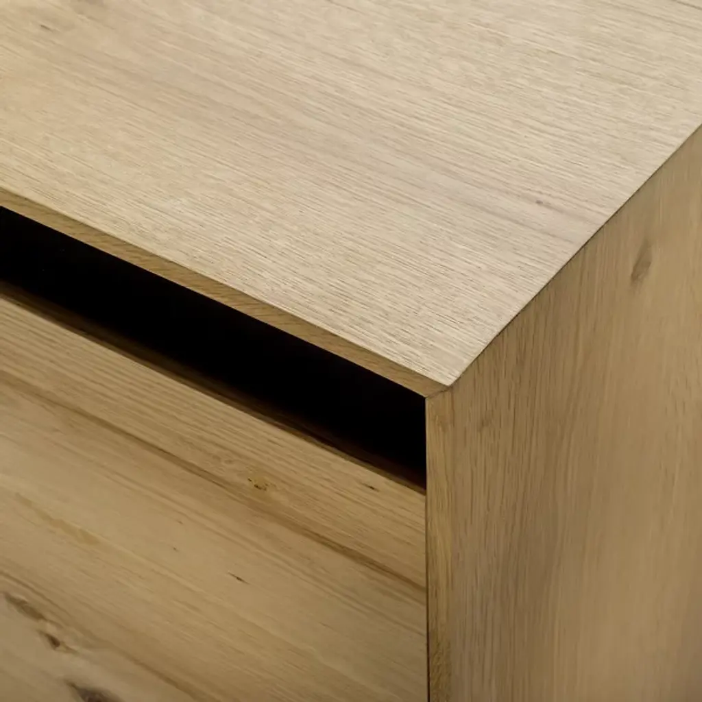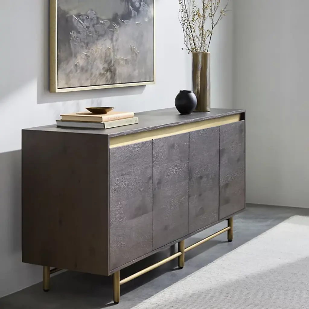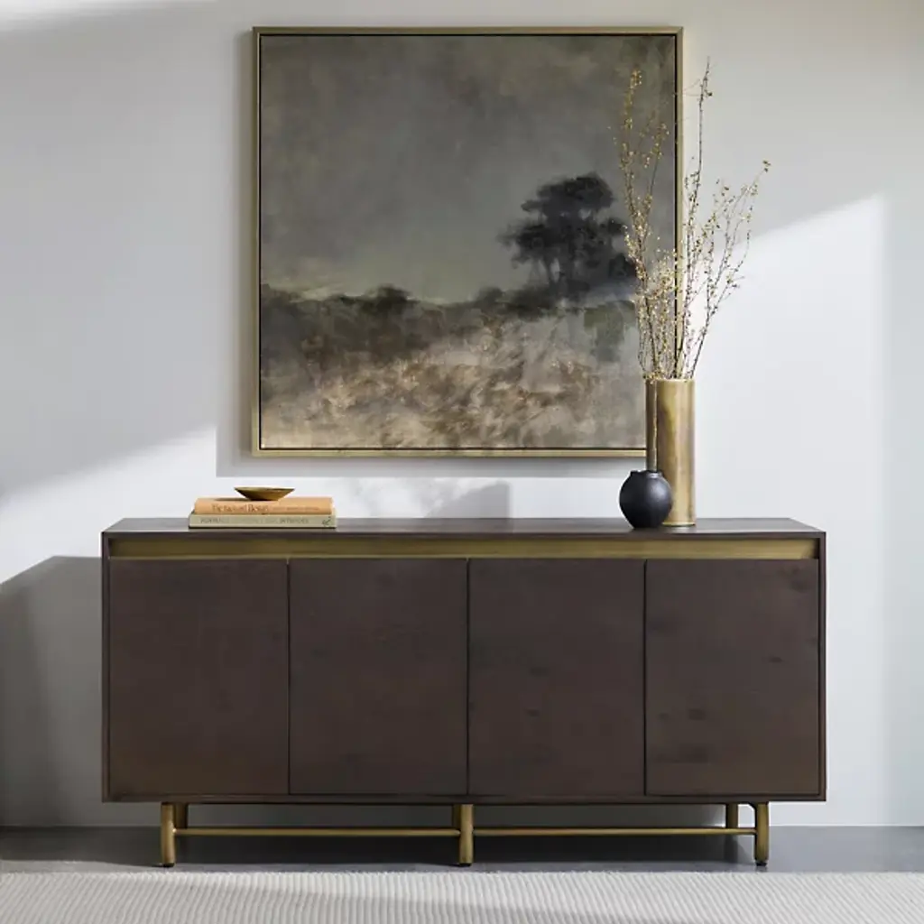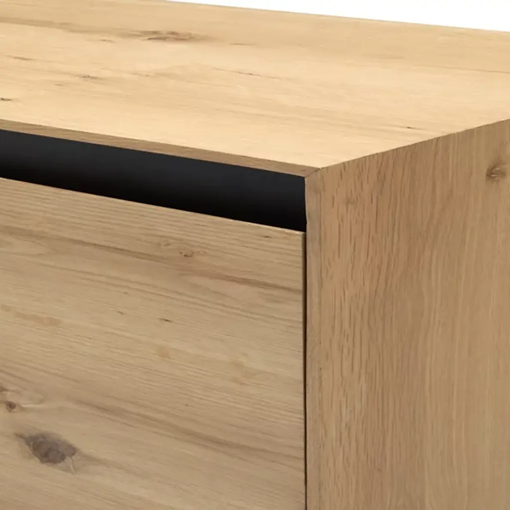 The Molander Sideboard from Surya celebrates the elegant intersection of Scandinavian minimalism and contemporary design. Masterfully crafted in India, this sophisticated storage solution features a striking oak veneer top suspended above a sleek powder-coated steel base. Ingeniously engineered with a strategic gap that allows four doors to open effortlessly, the piece puts the organic beauty of the natural woodgrain on full display. The black-painted legs ground the design with architectural precision, transforming storage into a sculptural statement that elevates any interior.
