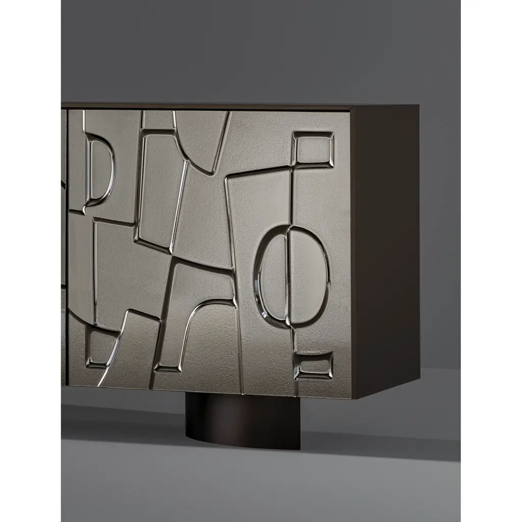 Featuring an unusual texture, the Image unique sideboard immediately grabs the attention thanks to its molded glass doors which resemble an idealized bas-relief while the front of the sideboard presents an abstract geometric pattern. As a piece of furniture, it demonstrates the combination of research into decorative qualities with volumetric purity, thereby facilitating its insertion into a wide range of spatial contexts while as a stylistic choice, it is enhanced through its finishes and the choice between bronze or lead colors.