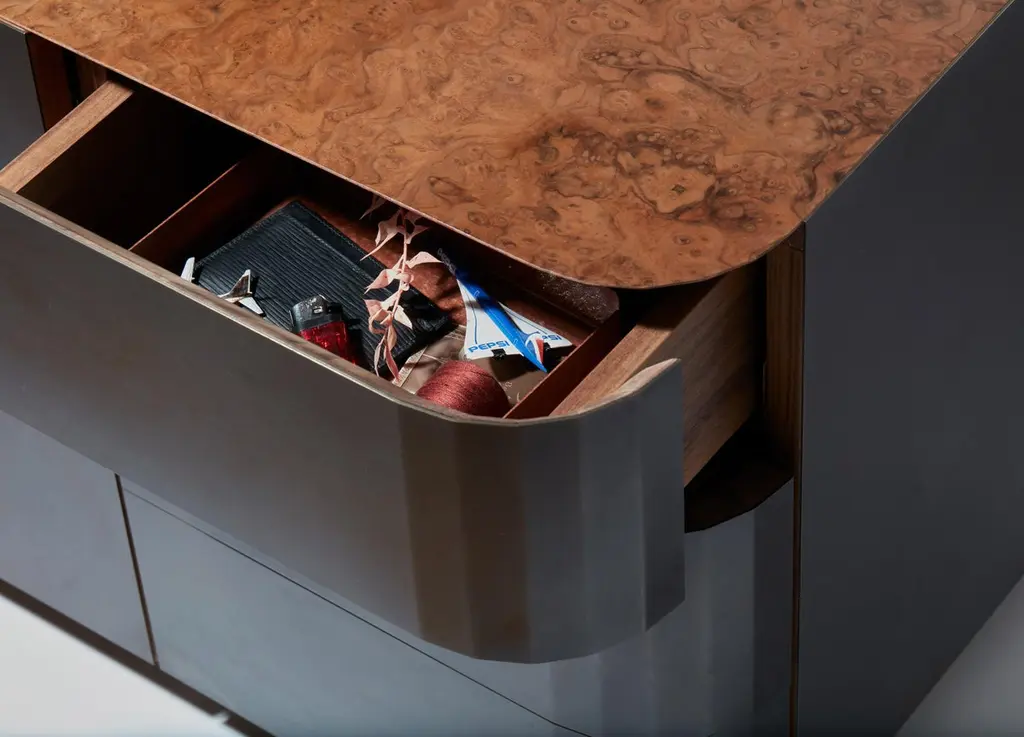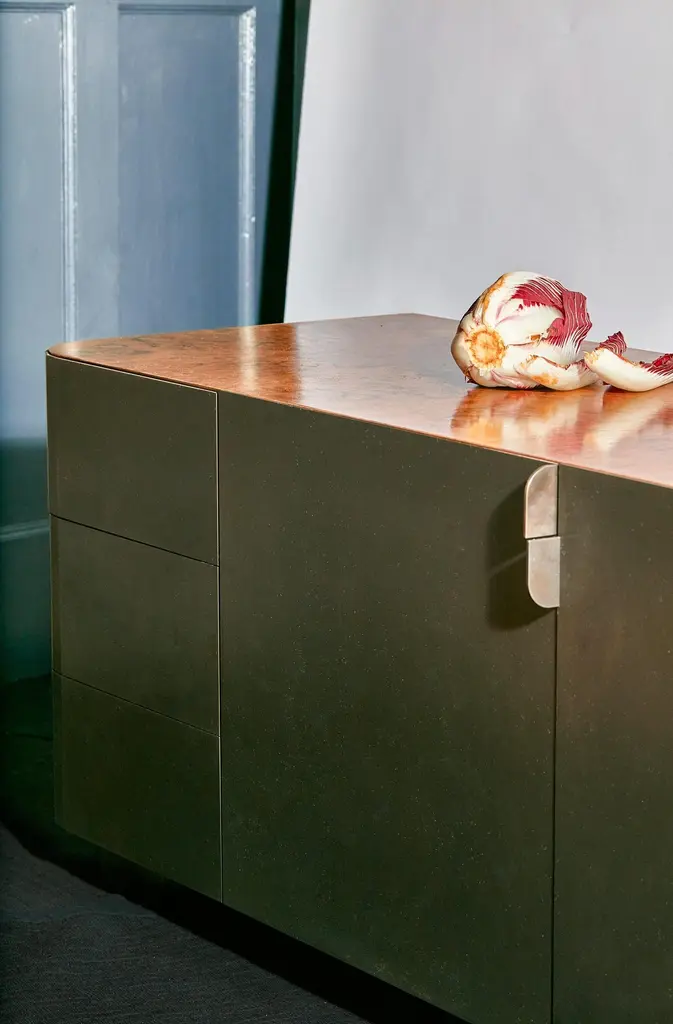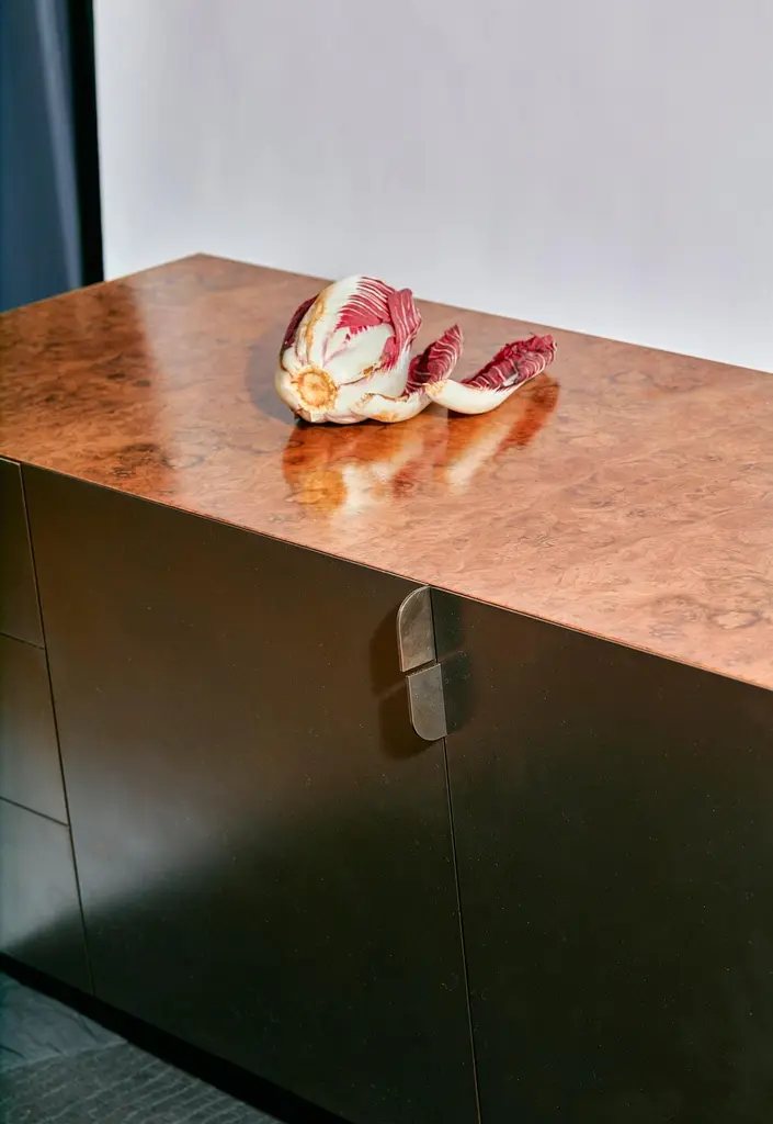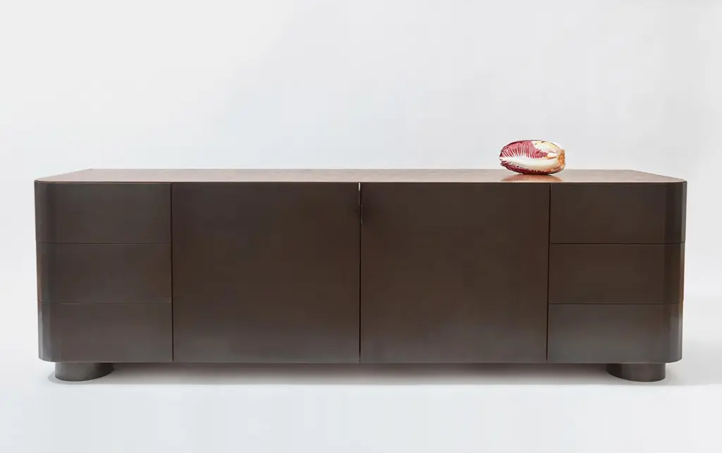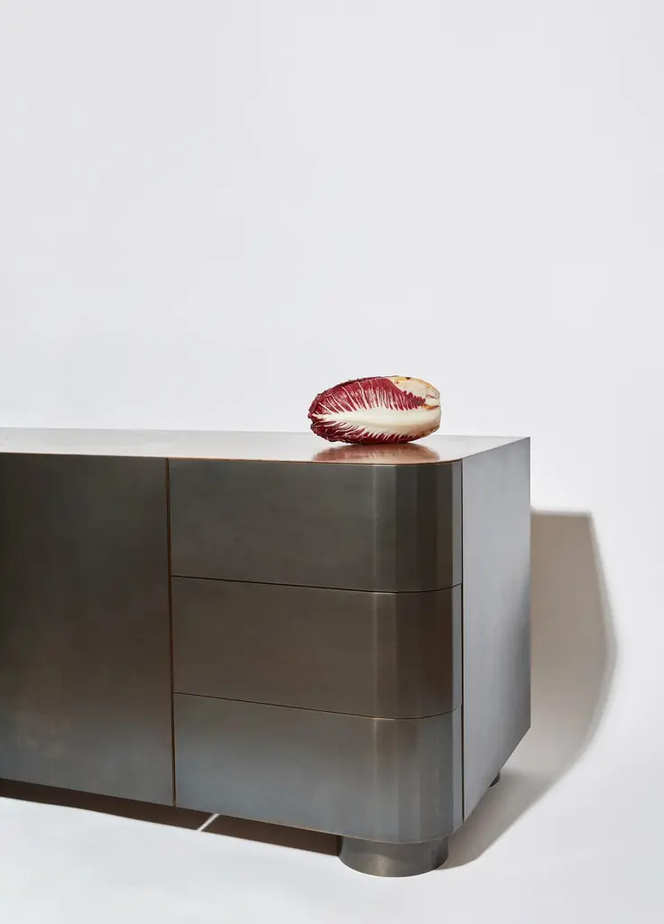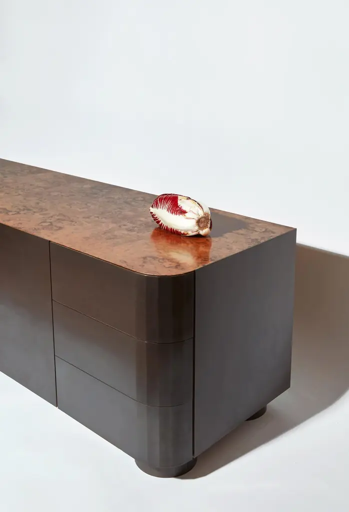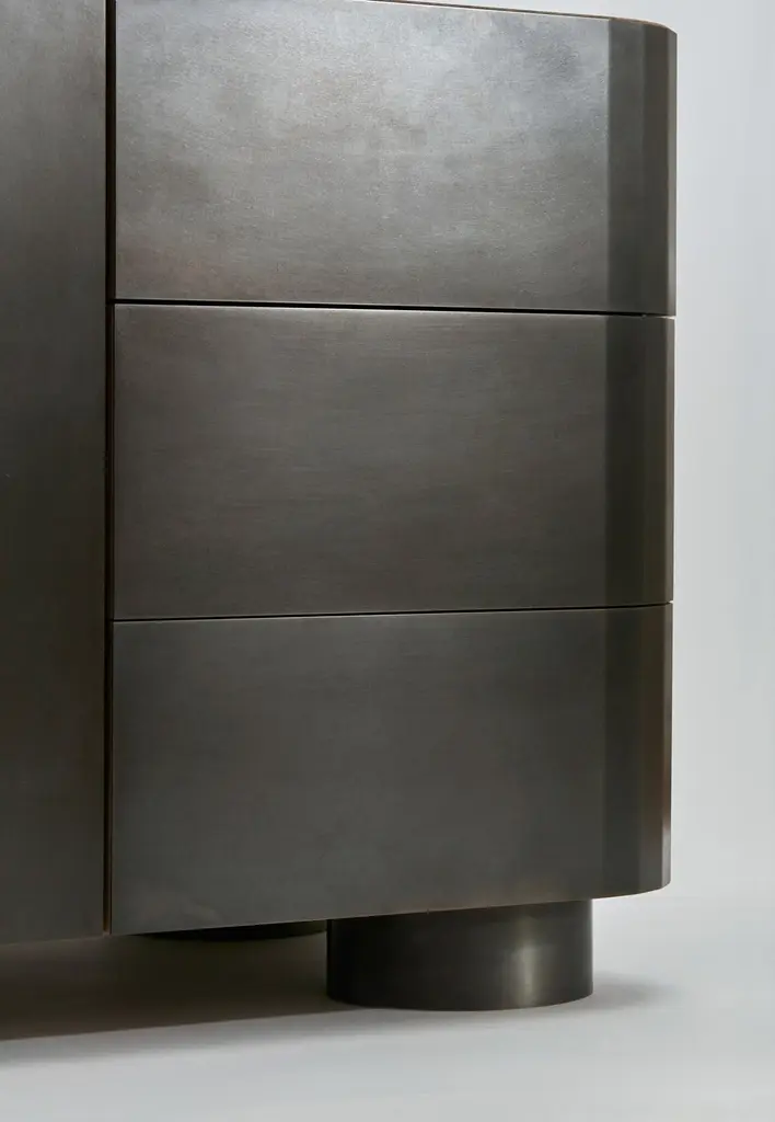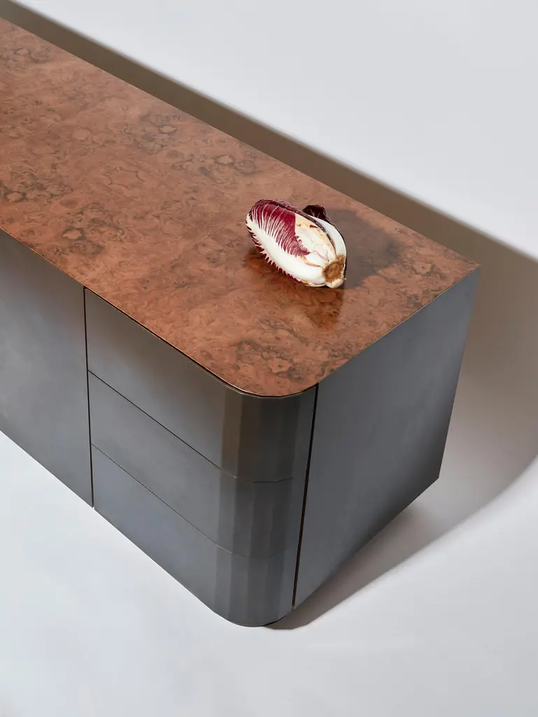 The Monolithic Sideboard is made of a walnut wood structure and is cladded in patinated brass sheet folded and facetted around the corners. The top surface of the sideboard is a lacquered burr walnut veneer. The stumpy feet and the push drawers add to the minimalist design of the piece - only the lines on the surface tell the user where the seemingly solid block opens.Walnut wood, burr walnut veneer, patinated brass sheetThe measurements are 50cm x 170cm x 50cm (W x L x H), feet height 6cm, but are fully customisable. The sideboard hast three push drawers on each side and two central doors.Custom metals and patinations, other wood options and custom sizes are available.Please feel free to enquire.