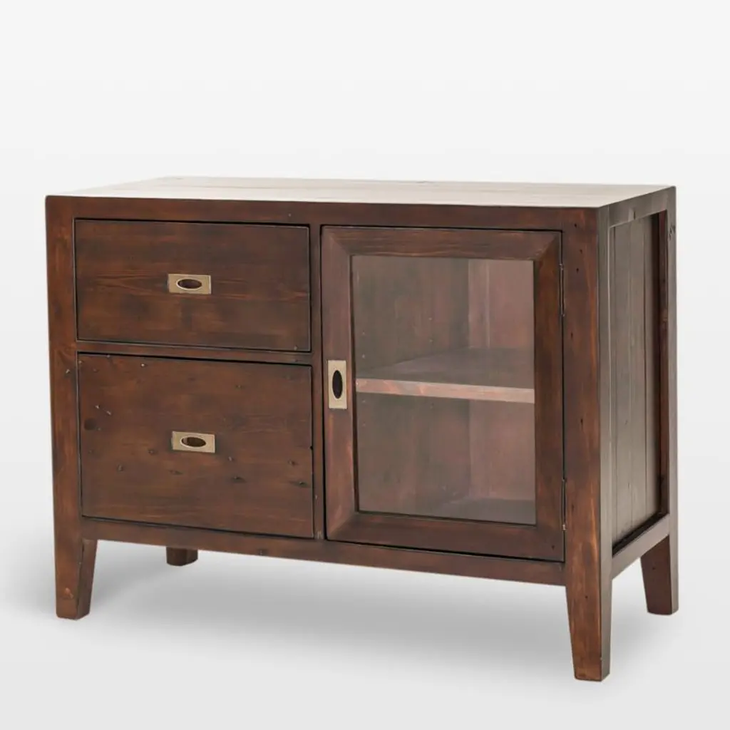 Made of pinewood reclaimed from old pallets, this credenza is expertly refinished joining other statement-making pieces in the Morris storage collection. Full of Morris's rustic refinement, the credenza has the same matte chocolate brown finish to bring out the wood's natural characteristics and metal inset pulls witth a rich antiqued brass finish.
