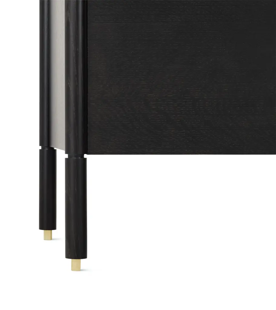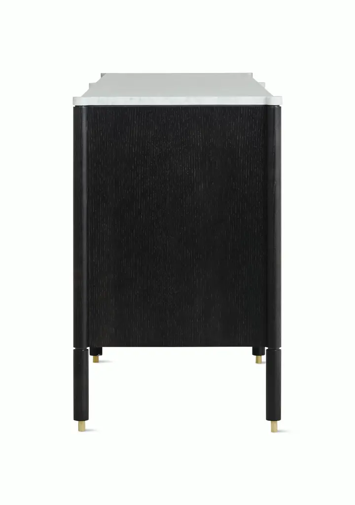 The Morrison Credenza (2012) has a solid marble top, brass hardware, and elegantly turned legs. Available in three wood finishes, this home storage cabinet features four soft-close doors, four adjustable shelves, and two cord escapes to accommodate electronic devices.