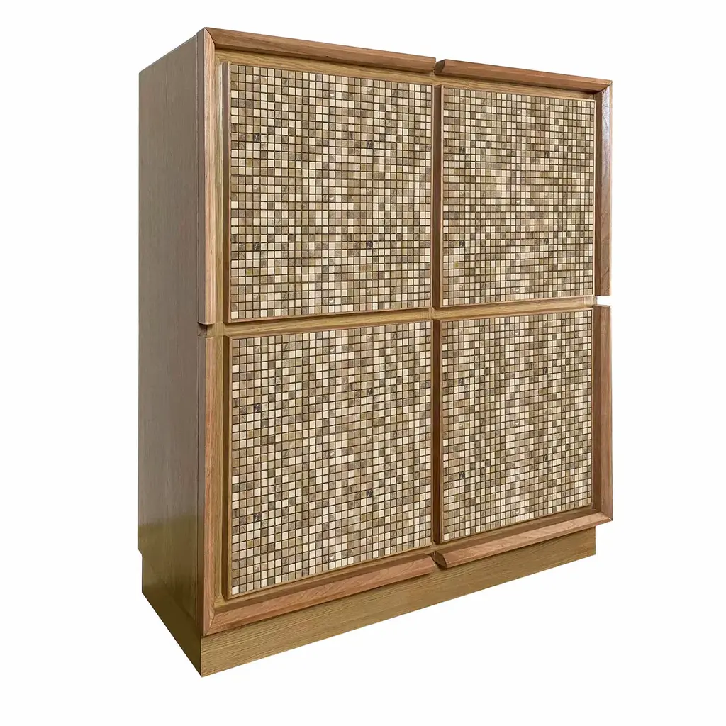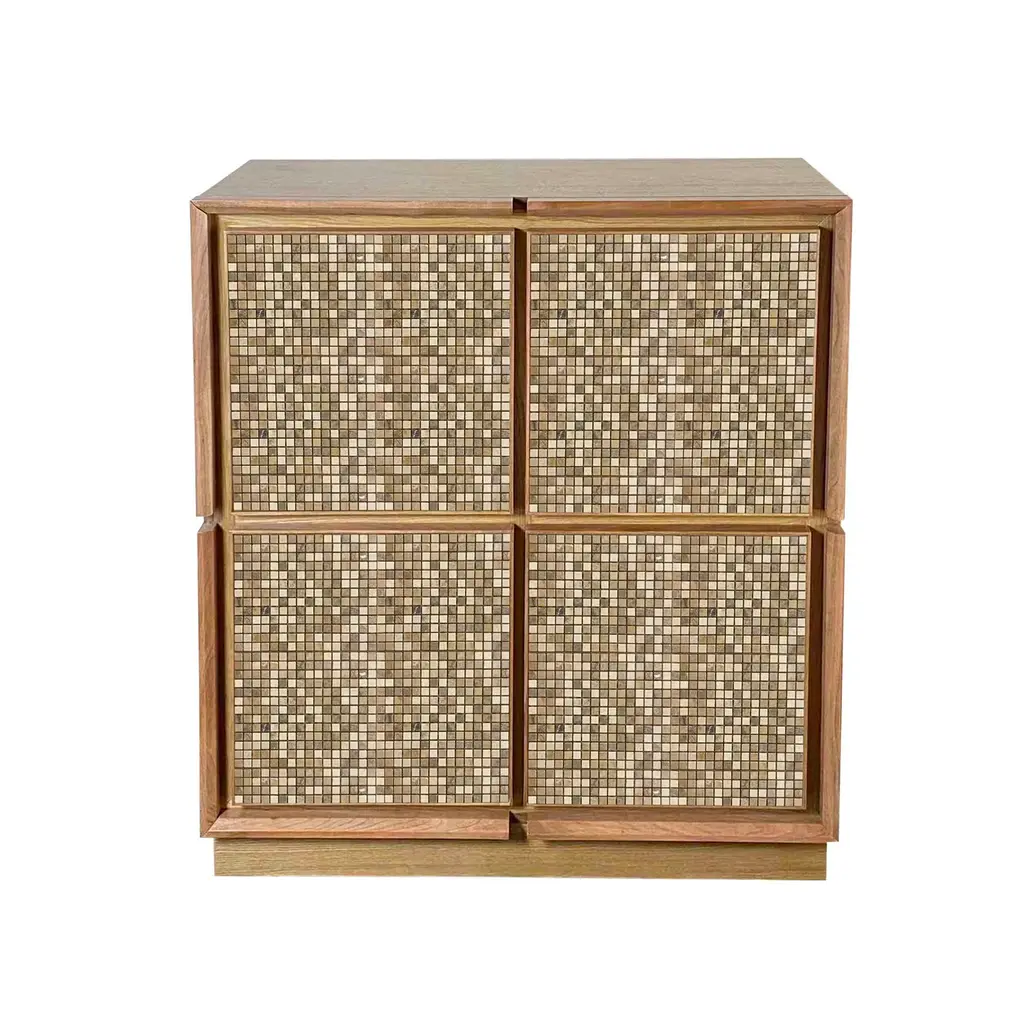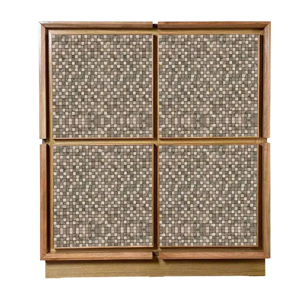 The number four of an exclusive series of designs created by Mascia Meccani in 2022 as part of the Mosaico Collection, this sideboard is a sculptural work of art to furnish a contemporary interior with unprecedented sophistication. Handmade of durmast wood finished in cherry and walnut, it features four doors enriched with natural stone beige mosaic and is equipped with shelves. Please consult the Artemest catalog for other available designs.