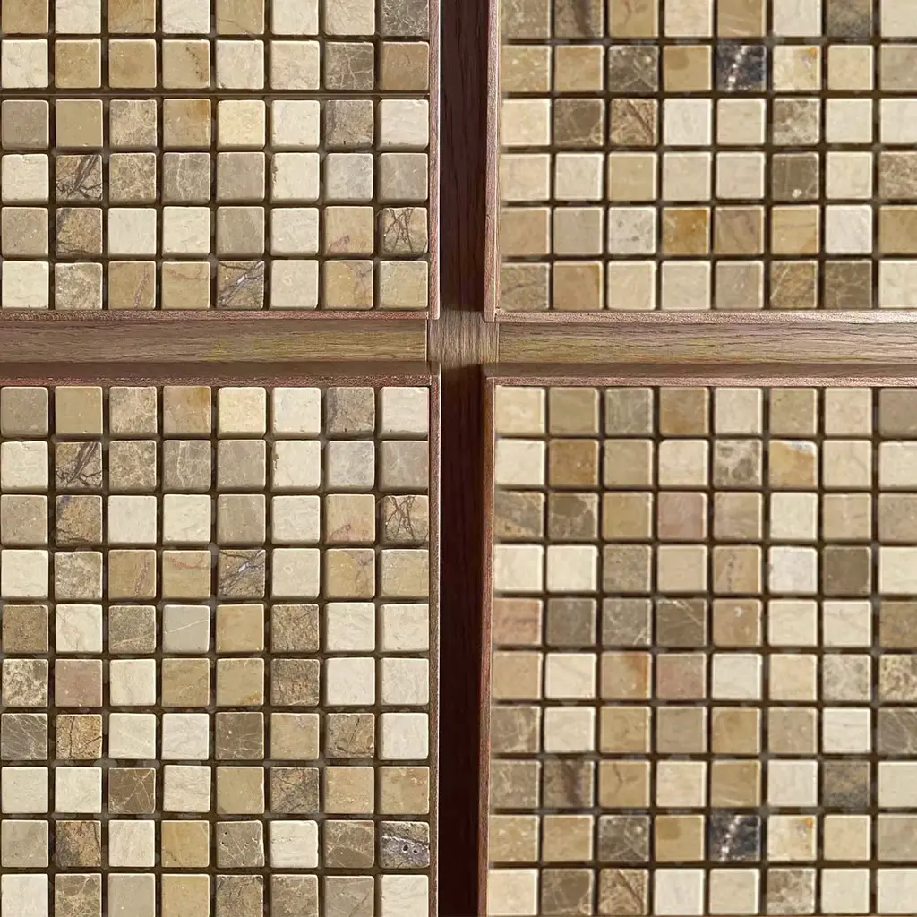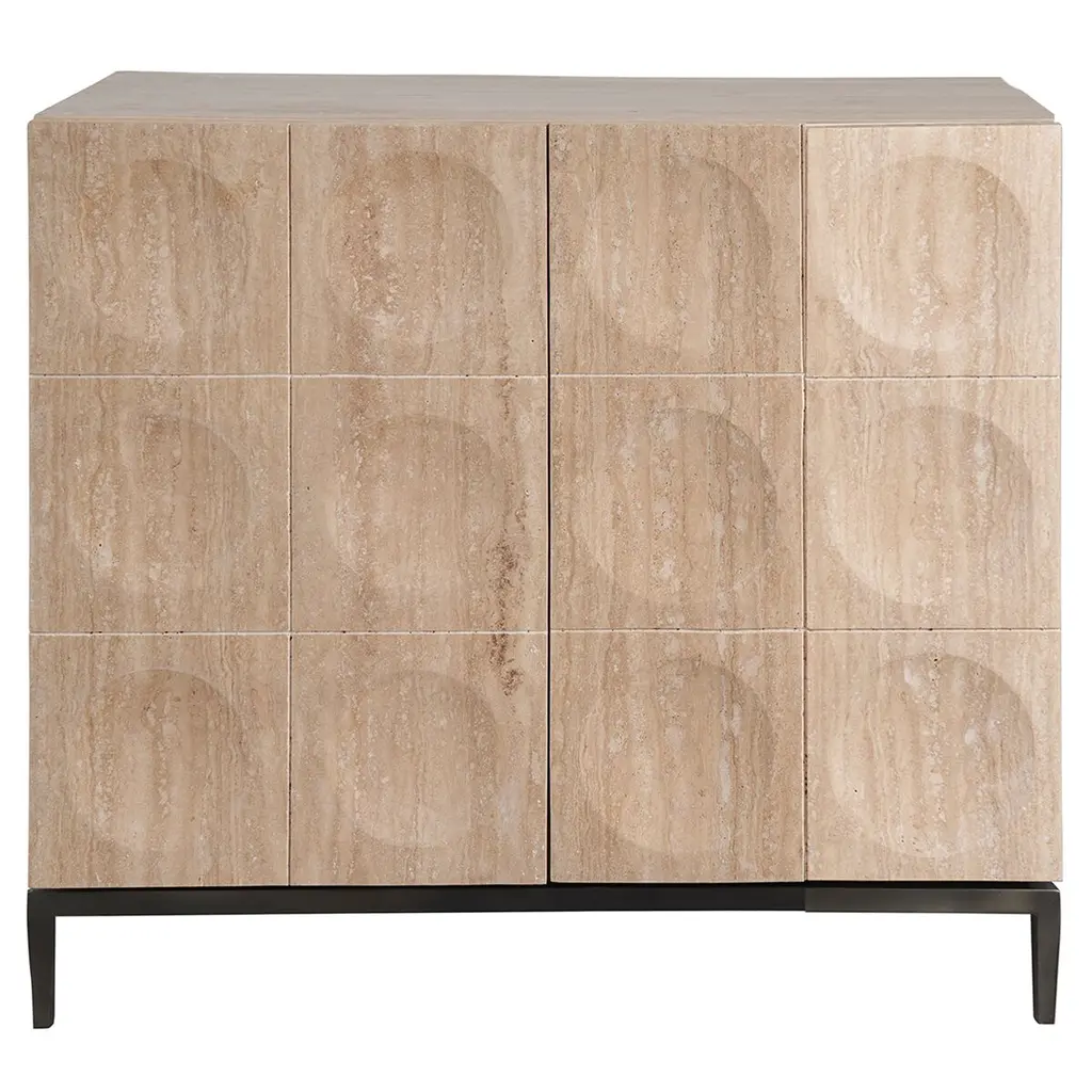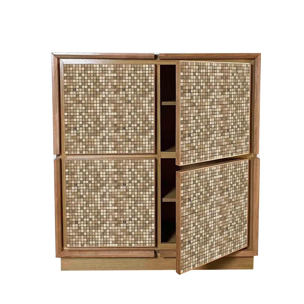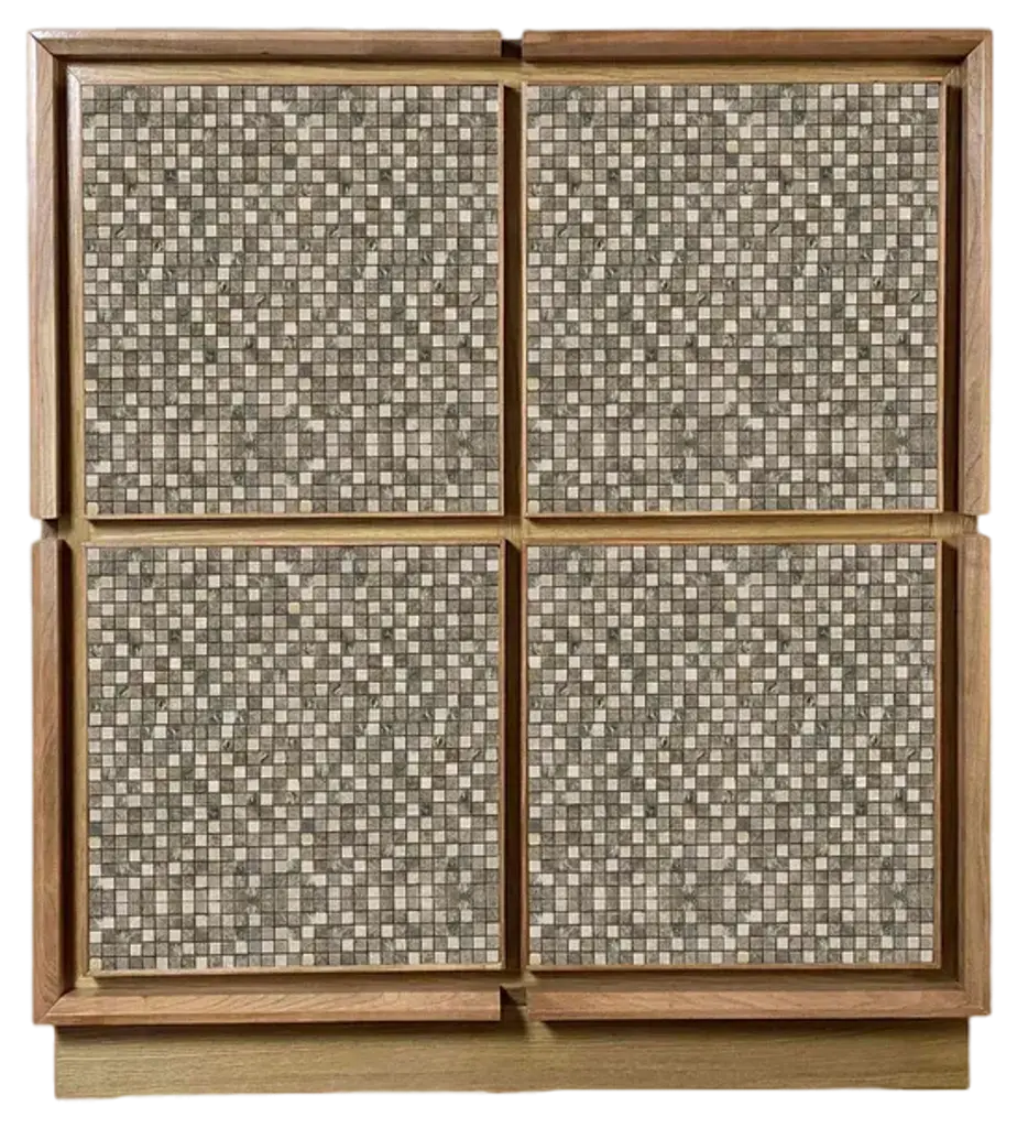The number four of an exclusive series of designs created by Mascia Meccani in 2022 as part of the Mosaico Collection, this sideboard is a sculptural work of art to furnish a contemporary interior with unprecedented sophistication. Handmade of durmast wood finished in cherry and walnut, it features four doors enriched with natural stone beige mosaic and is equipped with shelves. Please consult the Artemest catalog for other available designs.