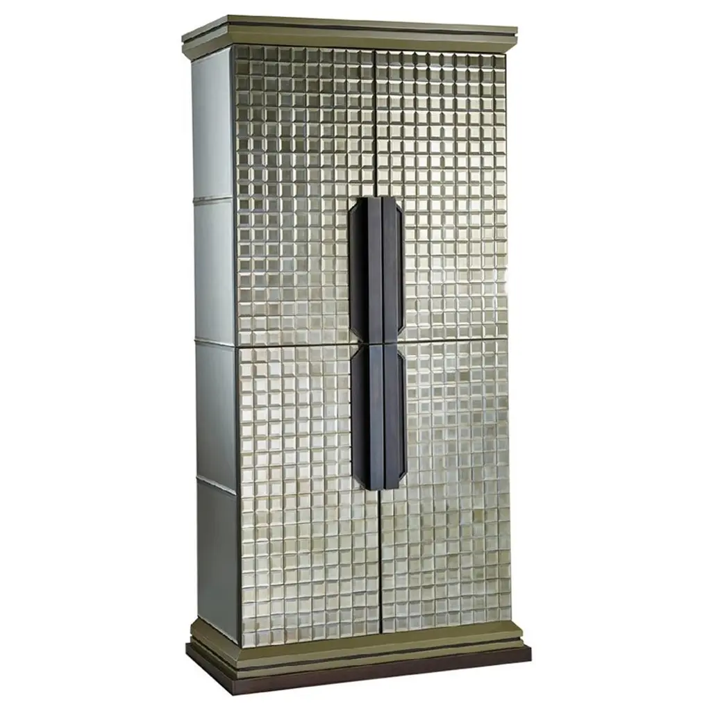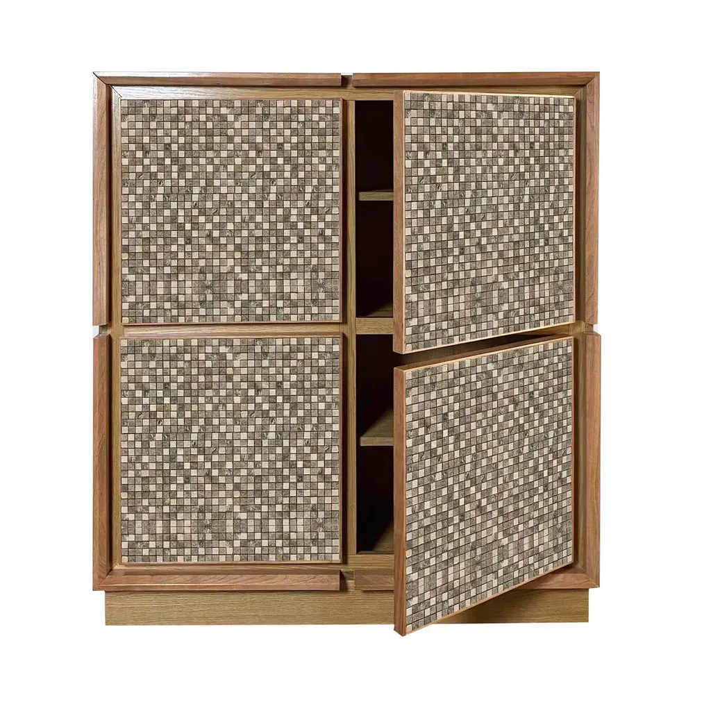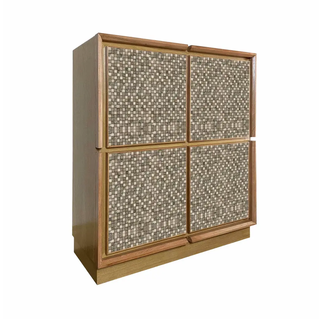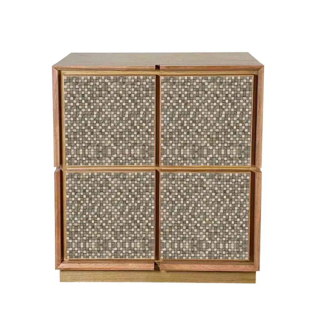 An exclusive design by Mascia Meccani created in 2022 as part of the Mosaico Collection, this sideboard displays a singular sculptural flair. Handmade of durmast wood finished in cherry and walnut, it features four doors enriched with natural beige stone and gray glass mosaic and is equipped with shelves. Please consult the Artemest catalog for other available designs.