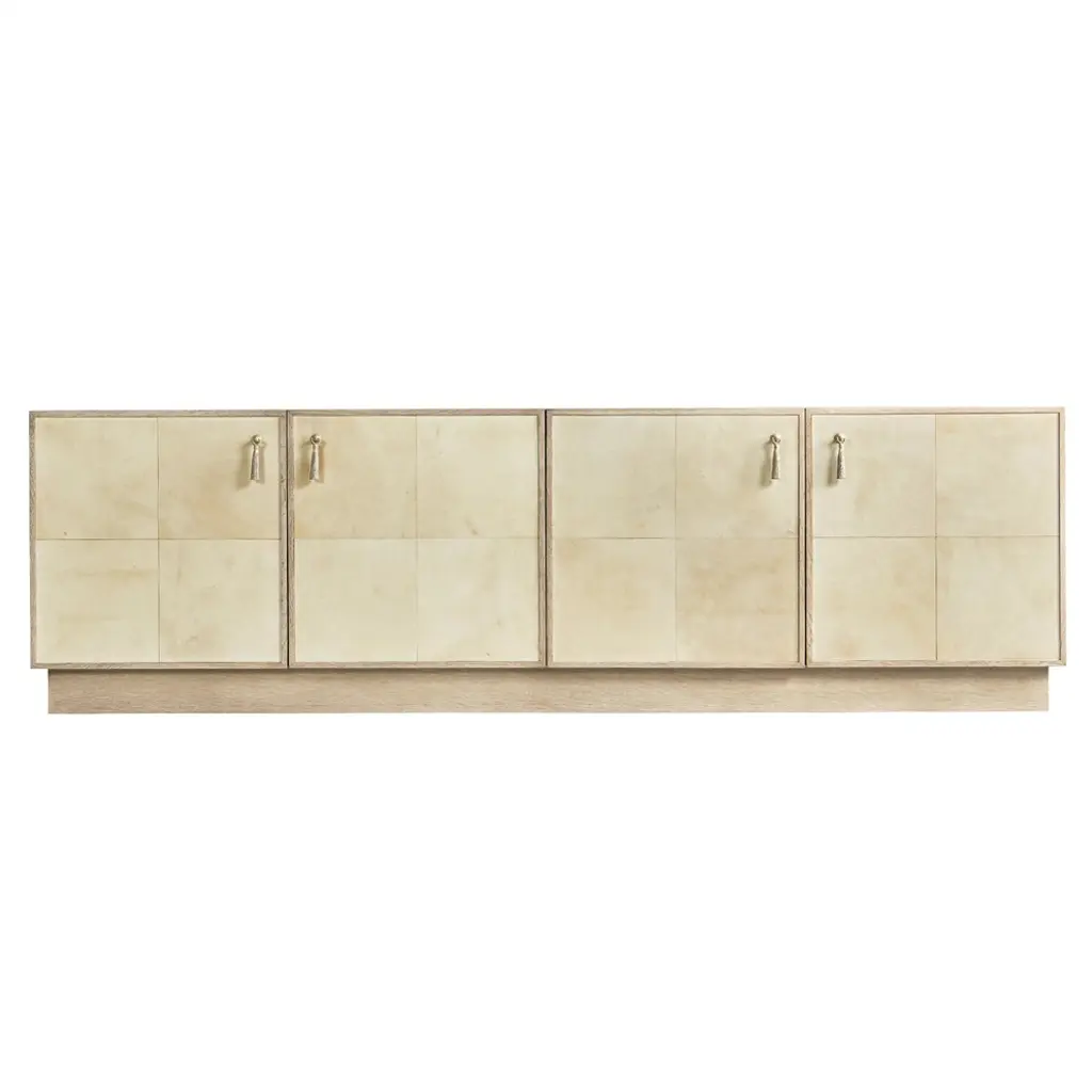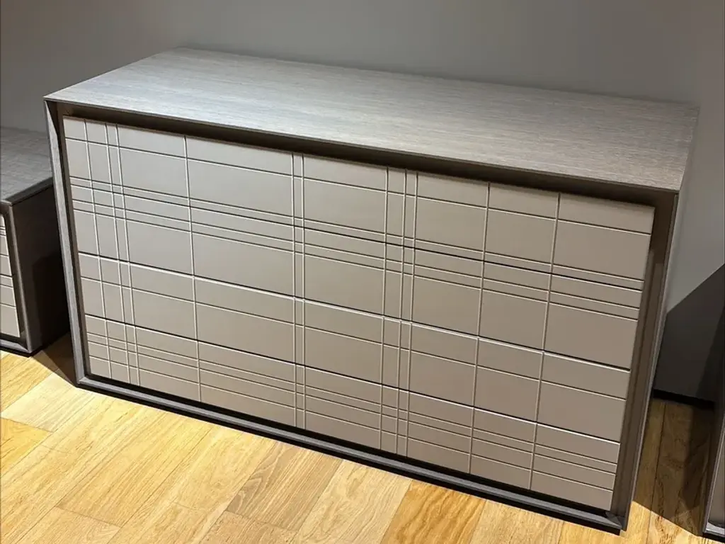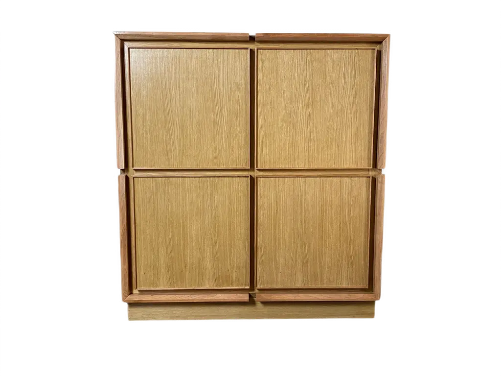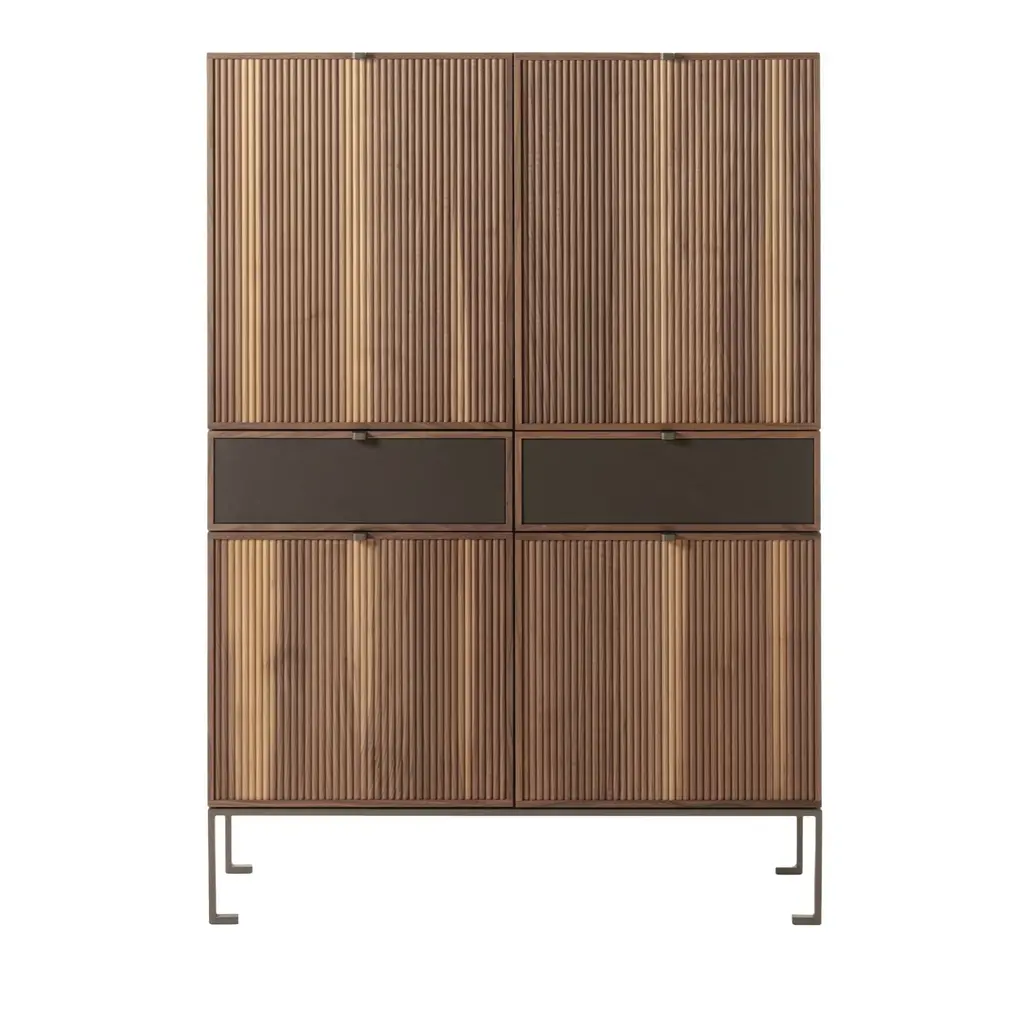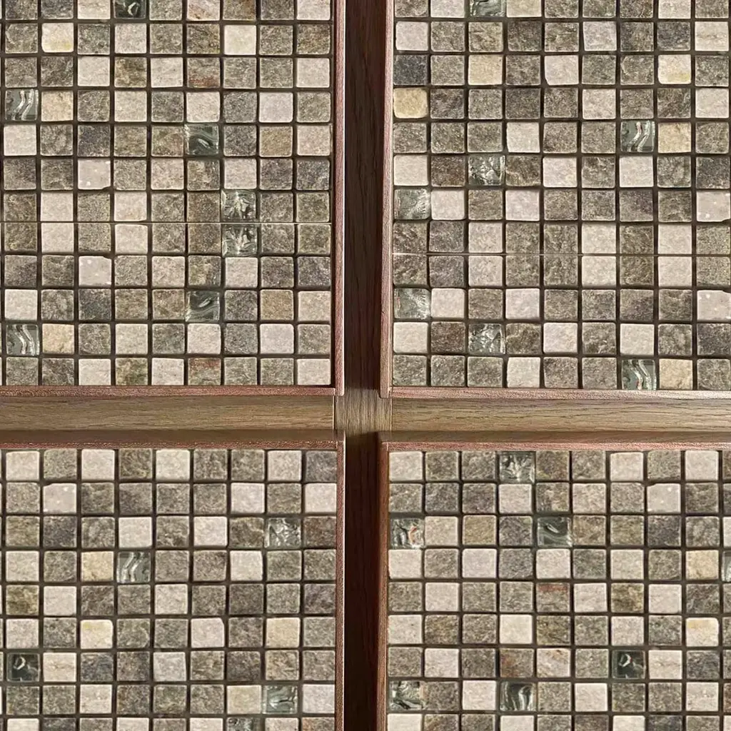 An exclusive design by Mascia Meccani created in 2022 as part of the Mosaico Collection, this sideboard displays a singular sculptural flair. Handmade of durmast wood finished in cherry and walnut, it features four doors enriched with natural beige stone and gray glass mosaic and is equipped with shelves. Please consult the Artemest catalog for other available designs.