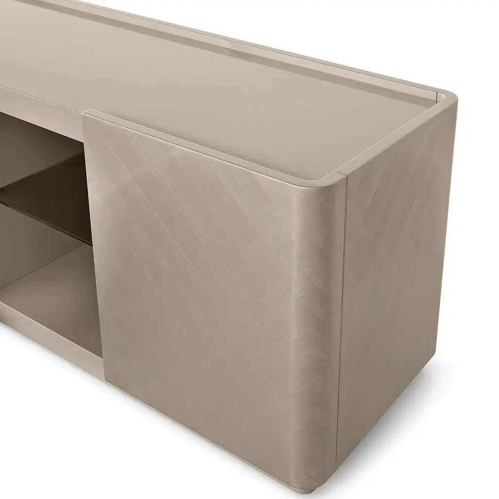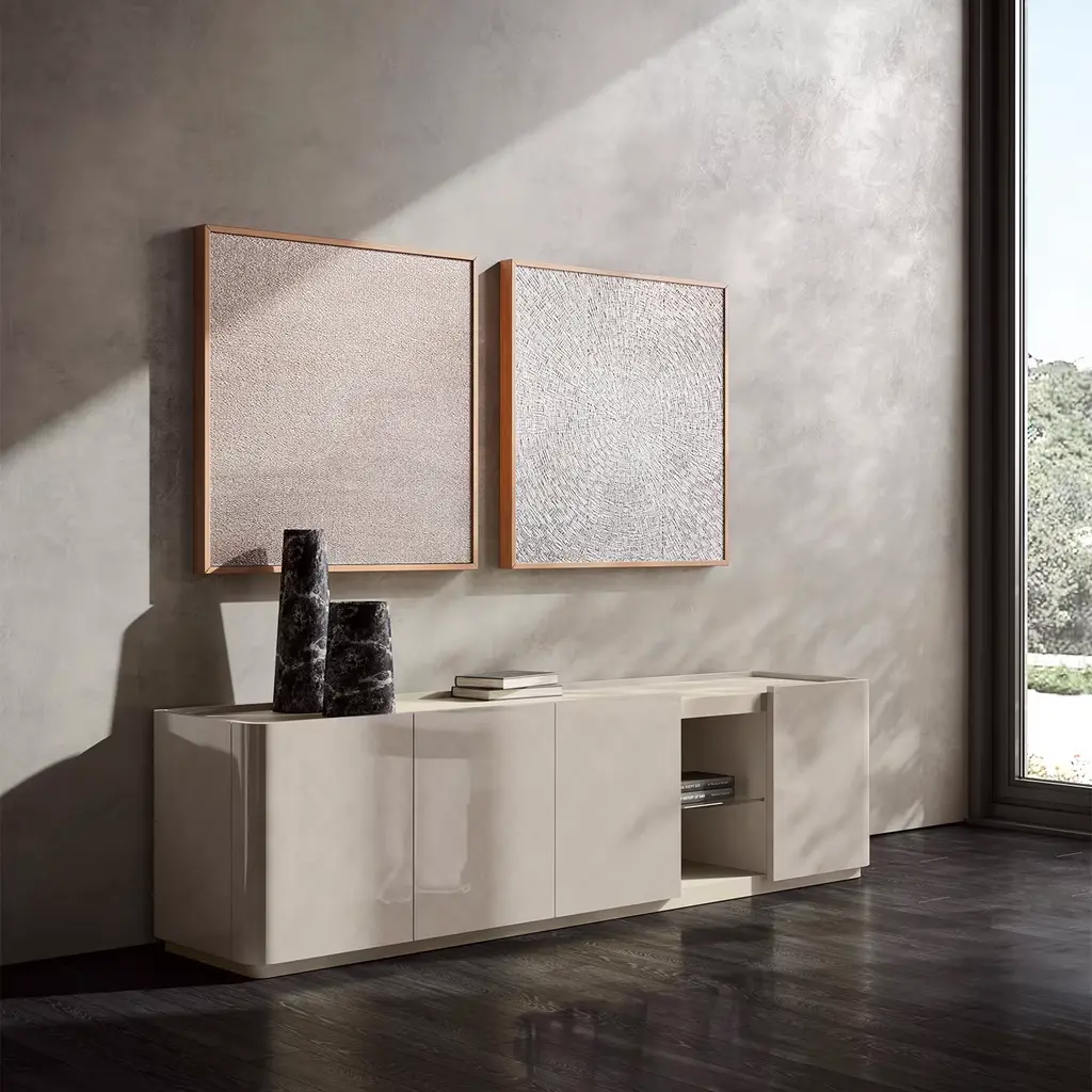 Defined by clean geometric lines, this sideboard will make for a timeless complement to a modern interior, enriching it with comfort and versatility. It features a nickel polyester-lacquered structure finished with a matte texture, enhanced with a "Palladio brushed" crossed motif, visible through the lightened MDF layers, and four doors with magnetic and soft closing opening up to bronze glass shelves and an inner drawer. Please contact the Concierge for more details and customization options.