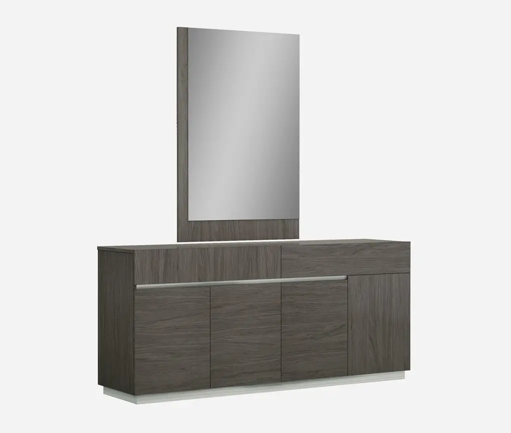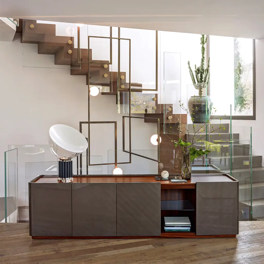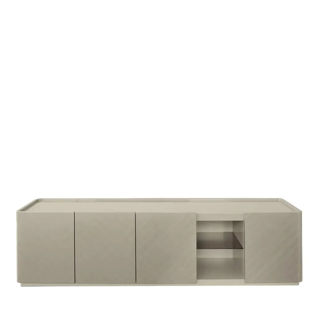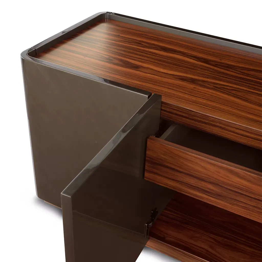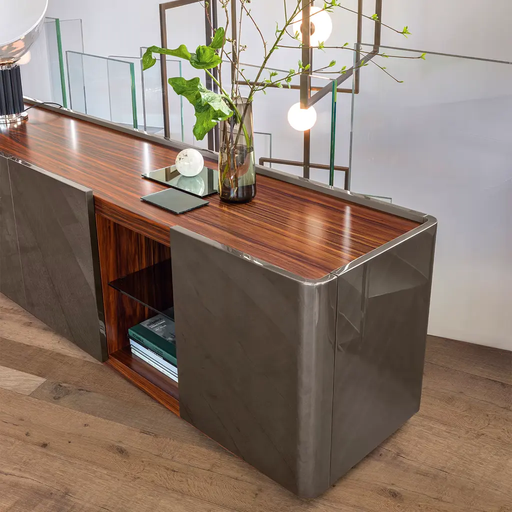 Boasting a clean geometric profile, this sideboard is a timeless complement to a modern interior. It features a Palissandro Santos veneered structure finished with a matte polyester texture, enhanced with a brushed Biotite crossed motif, visible through the lightened MDF layers, and four doors with magnetic and soft closing opening up to bronze glass shelves and an inner drawer. Please contact the Concierge for more details and customization options.