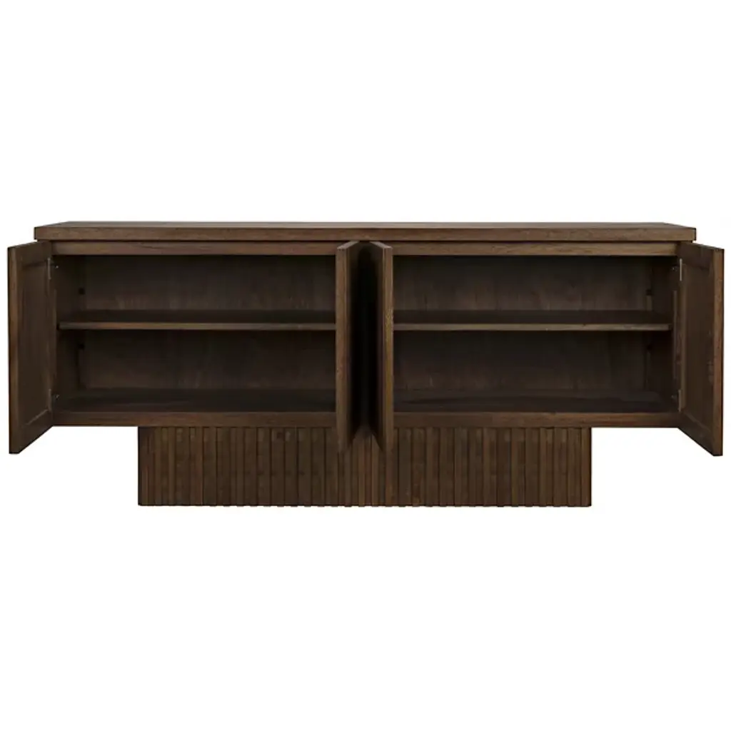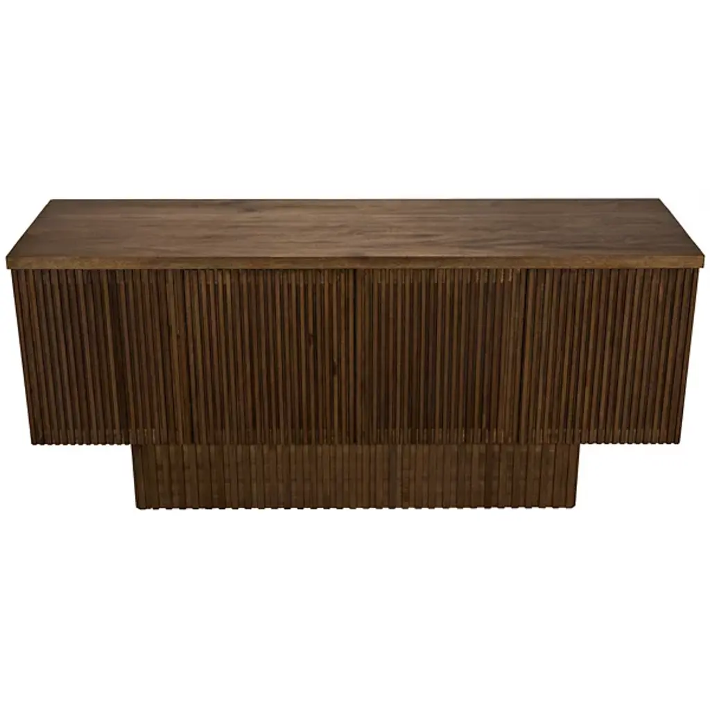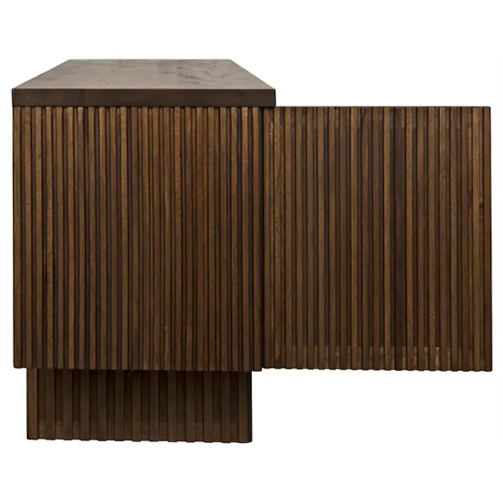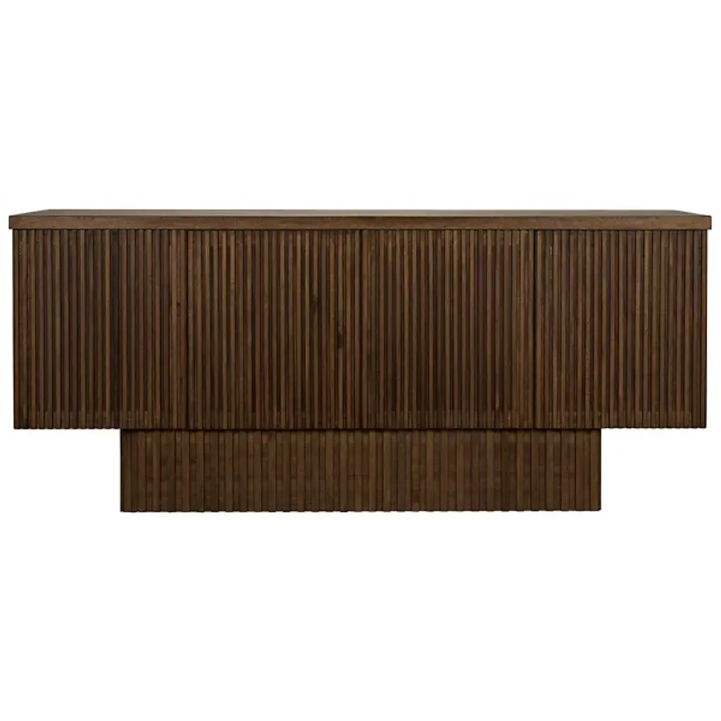 The Mr. Smith Sideboard from Noir merges contemporary aesthetics with traditional craftsmanship through its linear surface treatment. Two different wood grain patterns create visual rhythm across the walnut veneer facade, each section contributing to the overall geometric composition. The rich hand-applied finish deepens the wood's natural coloration while concealed hardware maintains the uninterrupted surface flow. Interior storage compartments provide practical organization for dining essentials, media equipment, or household items, making this sideboard functional beyond its role as a design statement.