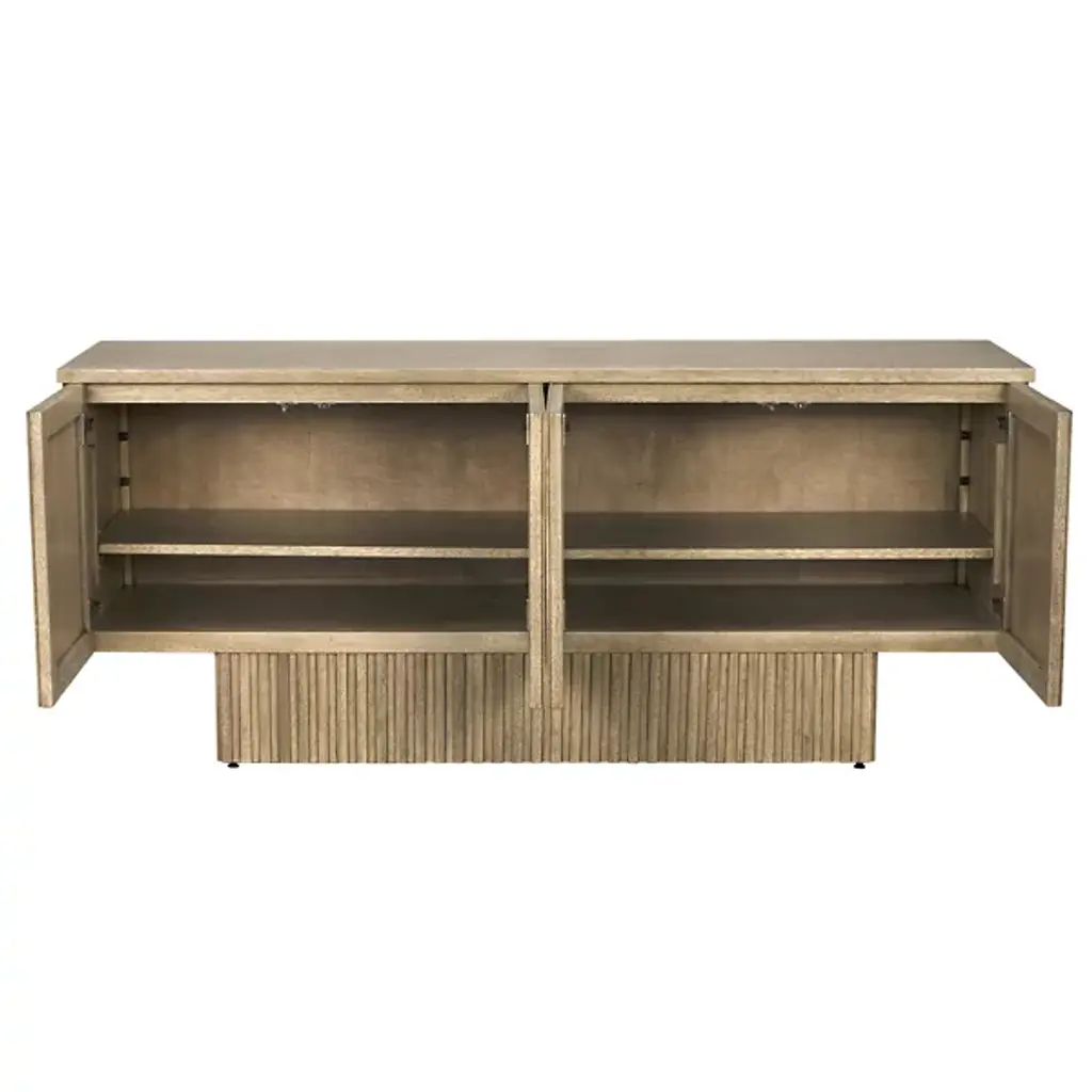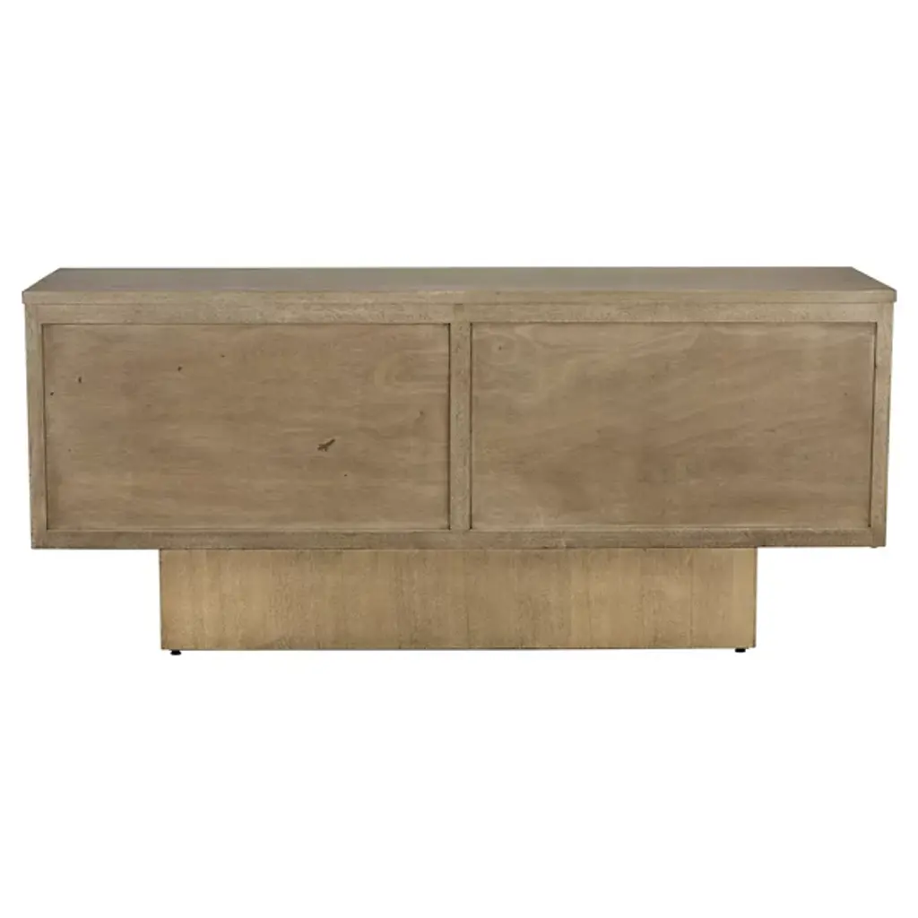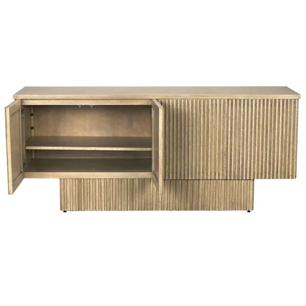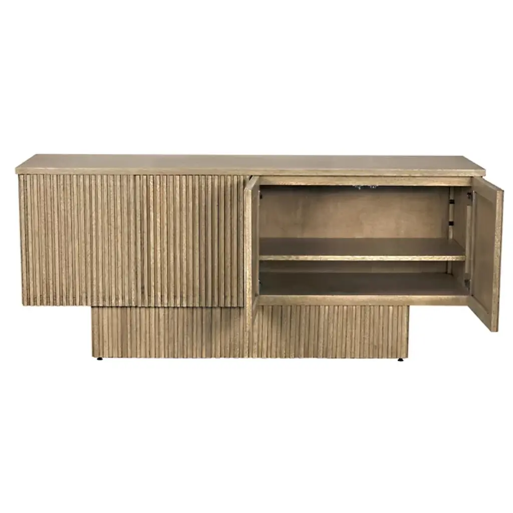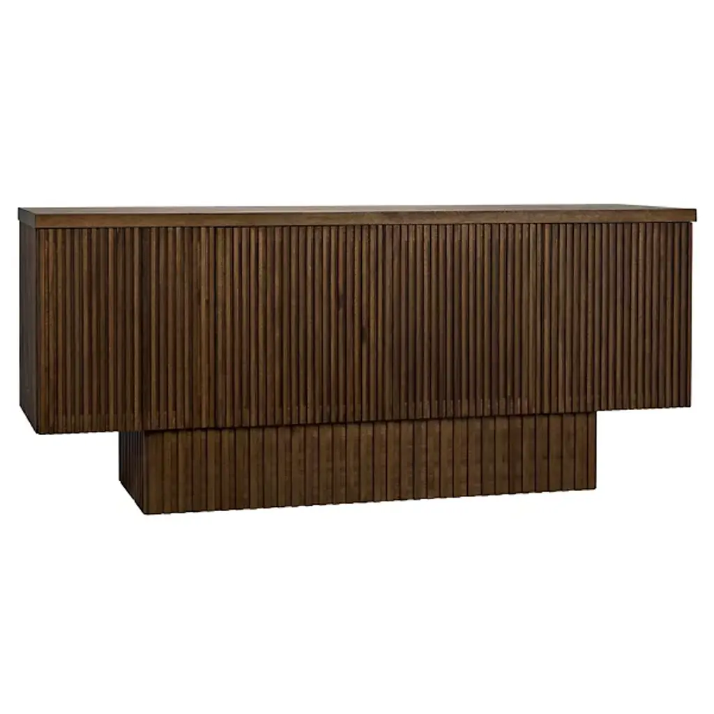 The Mr. Smith Sideboard from Noir merges contemporary aesthetics with traditional craftsmanship through its linear surface treatment. Two different wood grain patterns create visual rhythm across the walnut veneer facade, each section contributing to the overall geometric composition. The rich hand-applied finish deepens the wood's natural coloration while concealed hardware maintains the uninterrupted surface flow. Interior storage compartments provide practical organization for dining essentials, media equipment, or household items, making this sideboard functional beyond its role as a design statement.