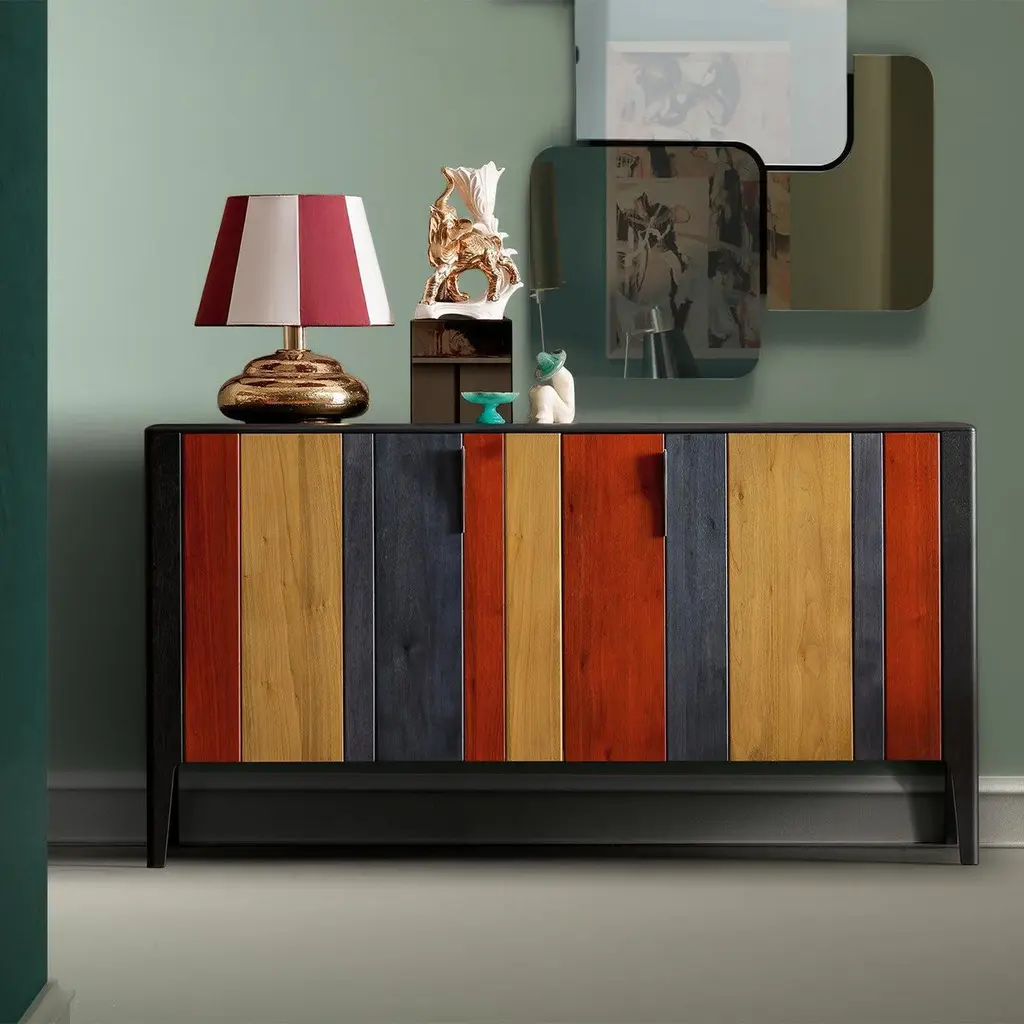 Brighten up an entryway, living room or dining area with the unabashedly colorful Domino Credenza, featuring two Canaletto walnut doors in rich yellow, red and anthracite finishes. The credenza comes complete with inner glass shelves, making it the perfect place to store your best dishes or favorite books.