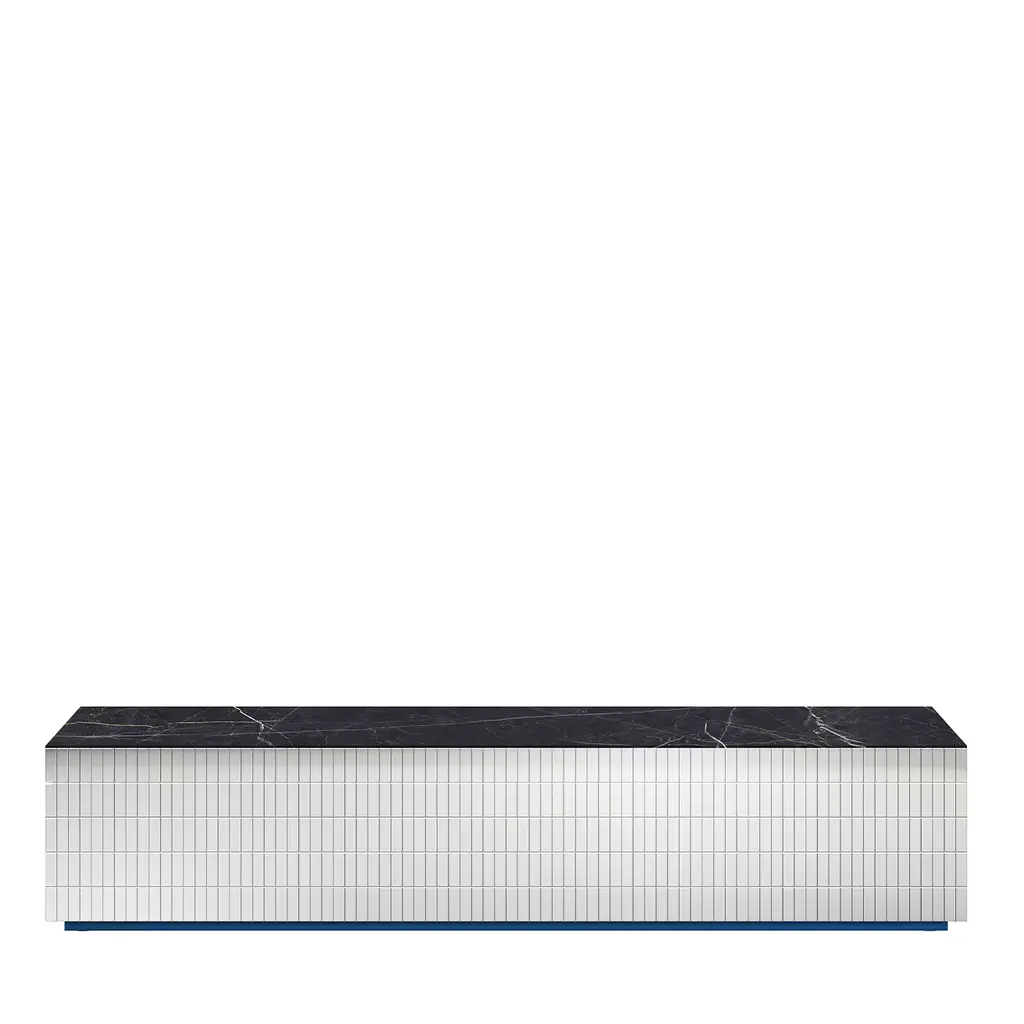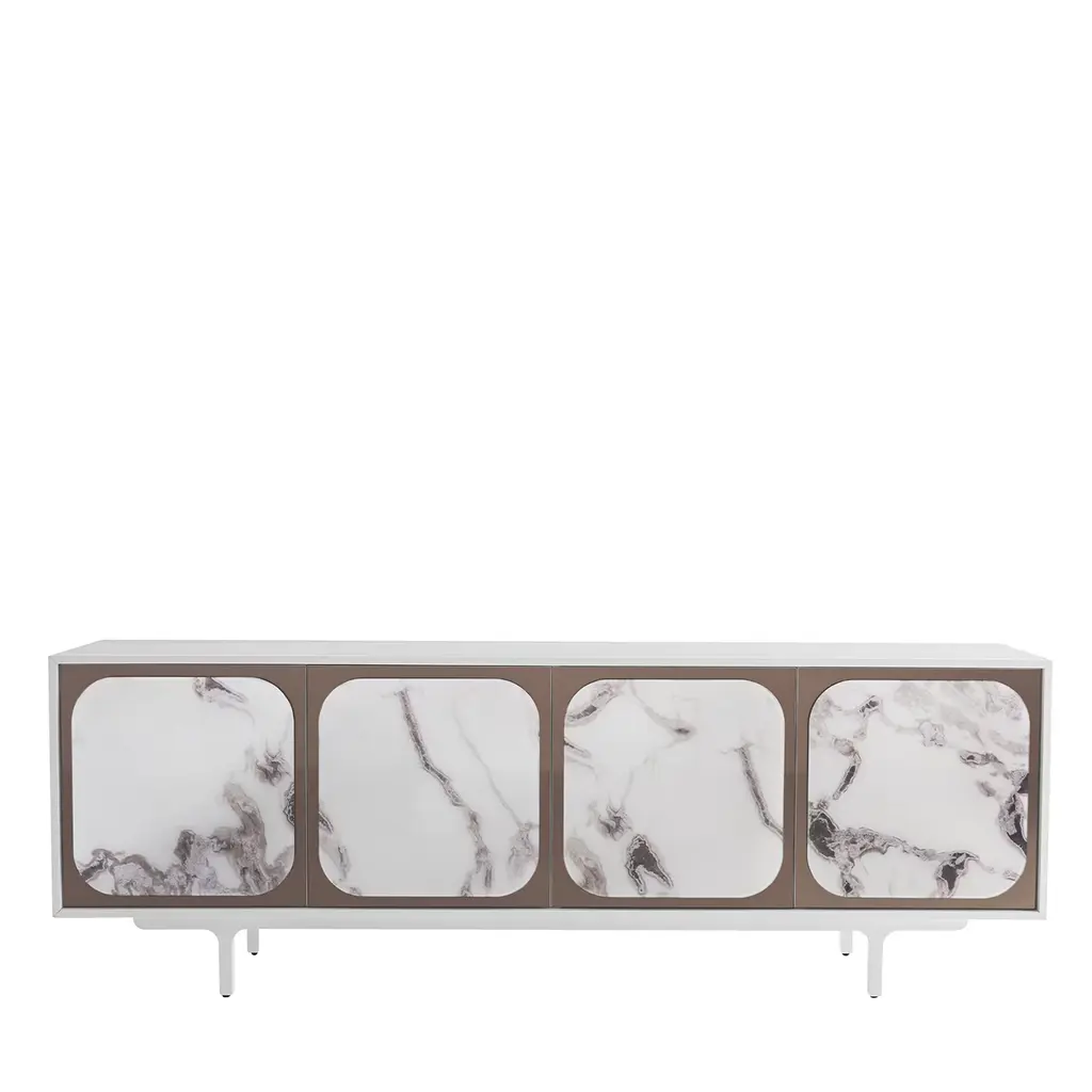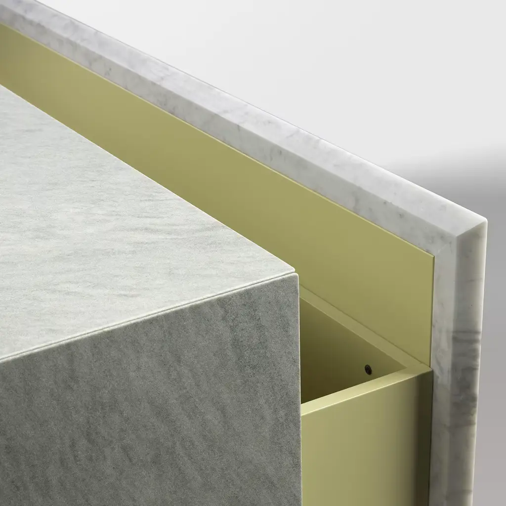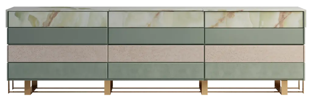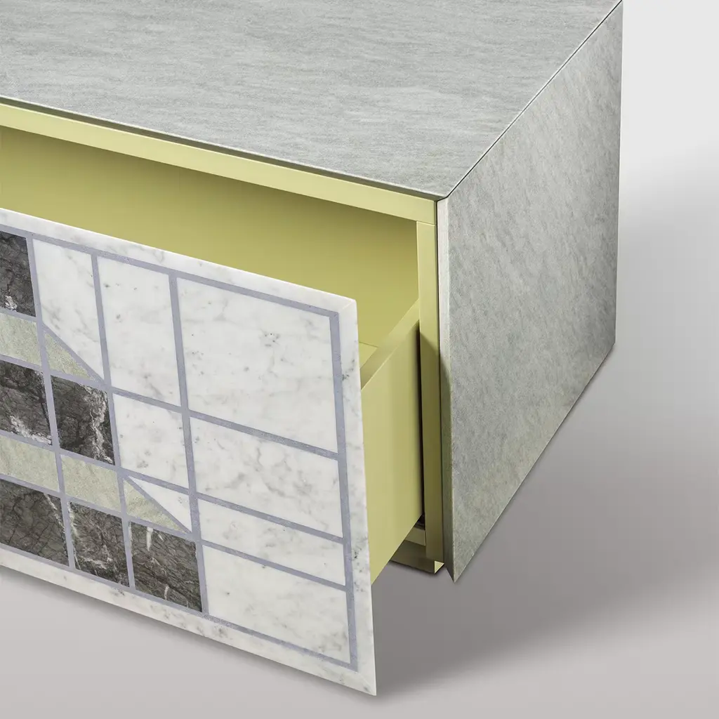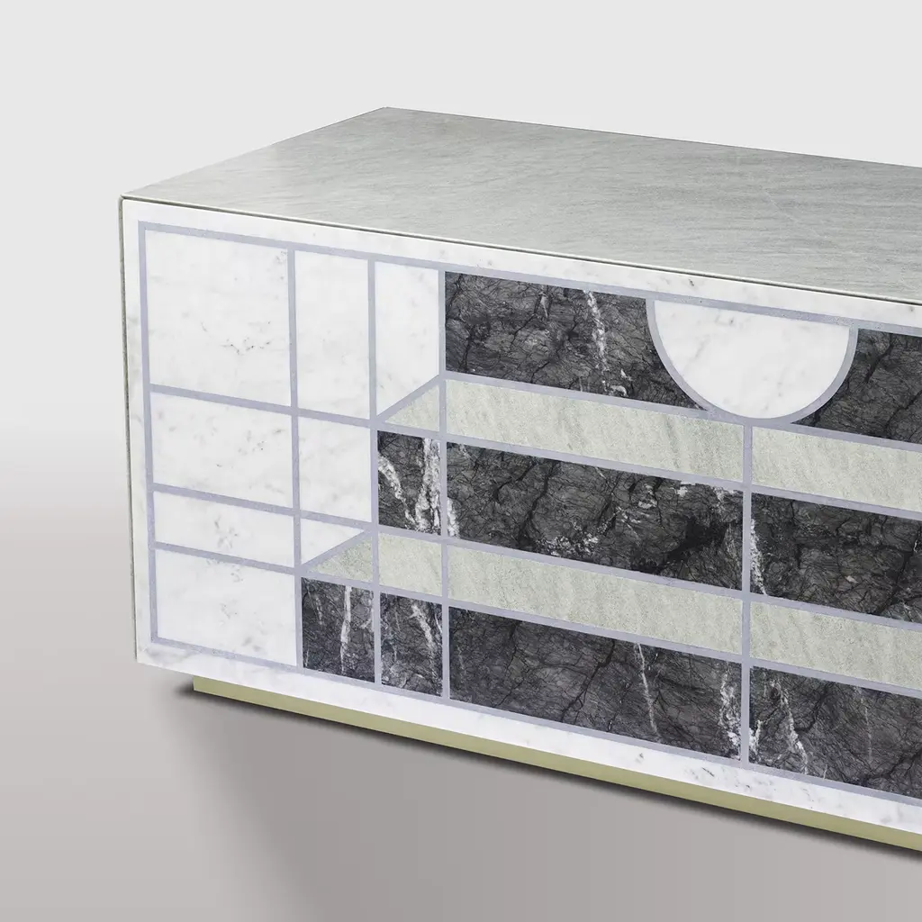 Sideboard with matt lacquered wood internal structure covered in Cipollino green marble, 5 mm lightened marble front with Myth graphics designed by Mae Engelgeer. The lightened front is composed of the following marbles: Bianco Carrara, Grigio Carnico, Verde Cipollino, and Avio-colored cement.