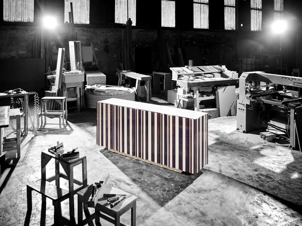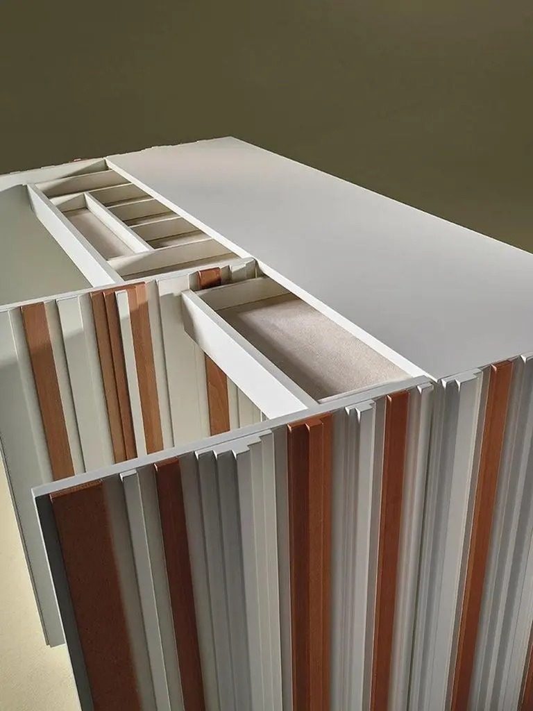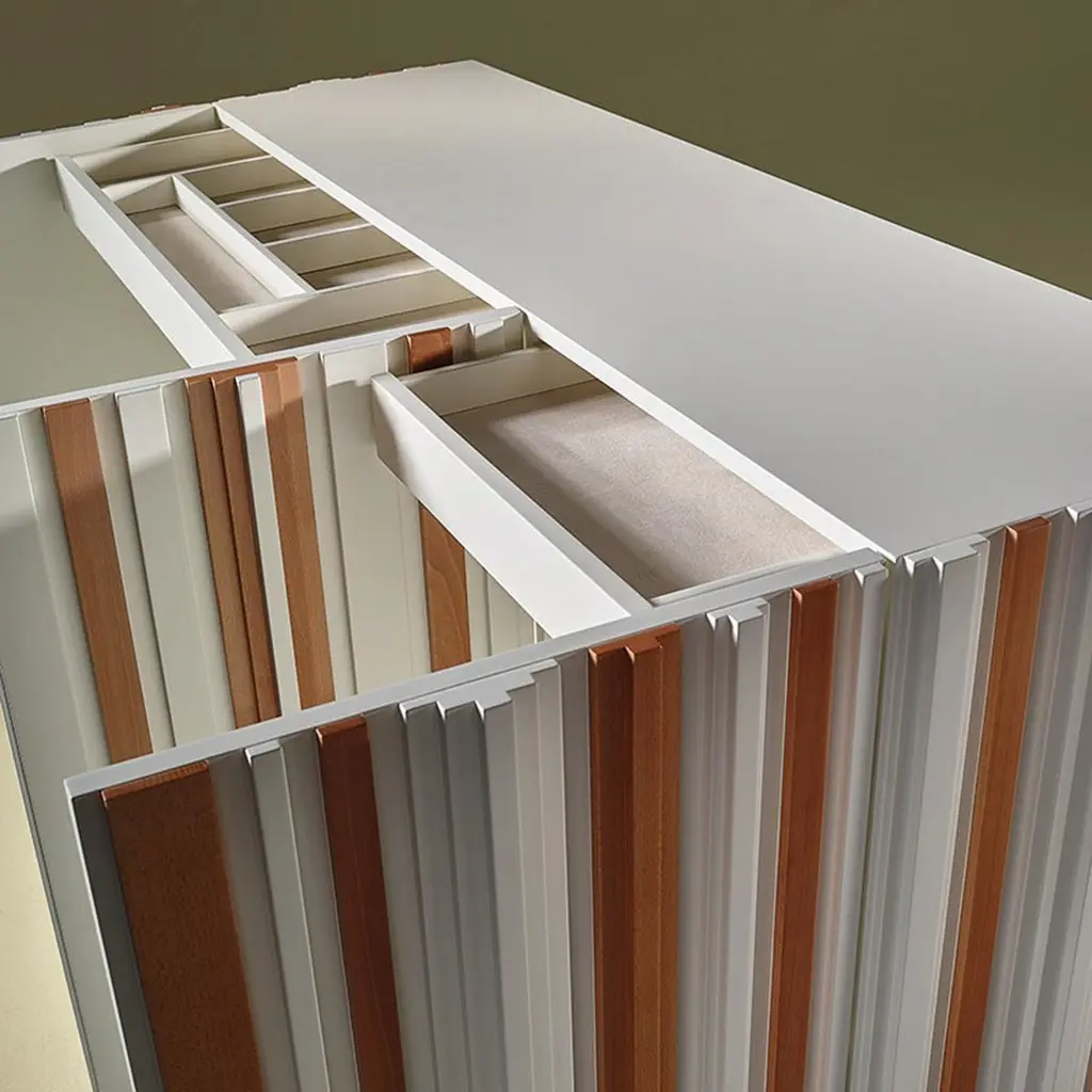 Sideboard with four doors, two-drawers lined inside (Lelievre Fabrics in images), two interior shelves and interior lighting in sycamore and lacquered or just wood.Bespoke / CustomizableIdentical shapes with different sizes and finishings.All RAL colors available. (Mate / Half Gloss / Gloss)