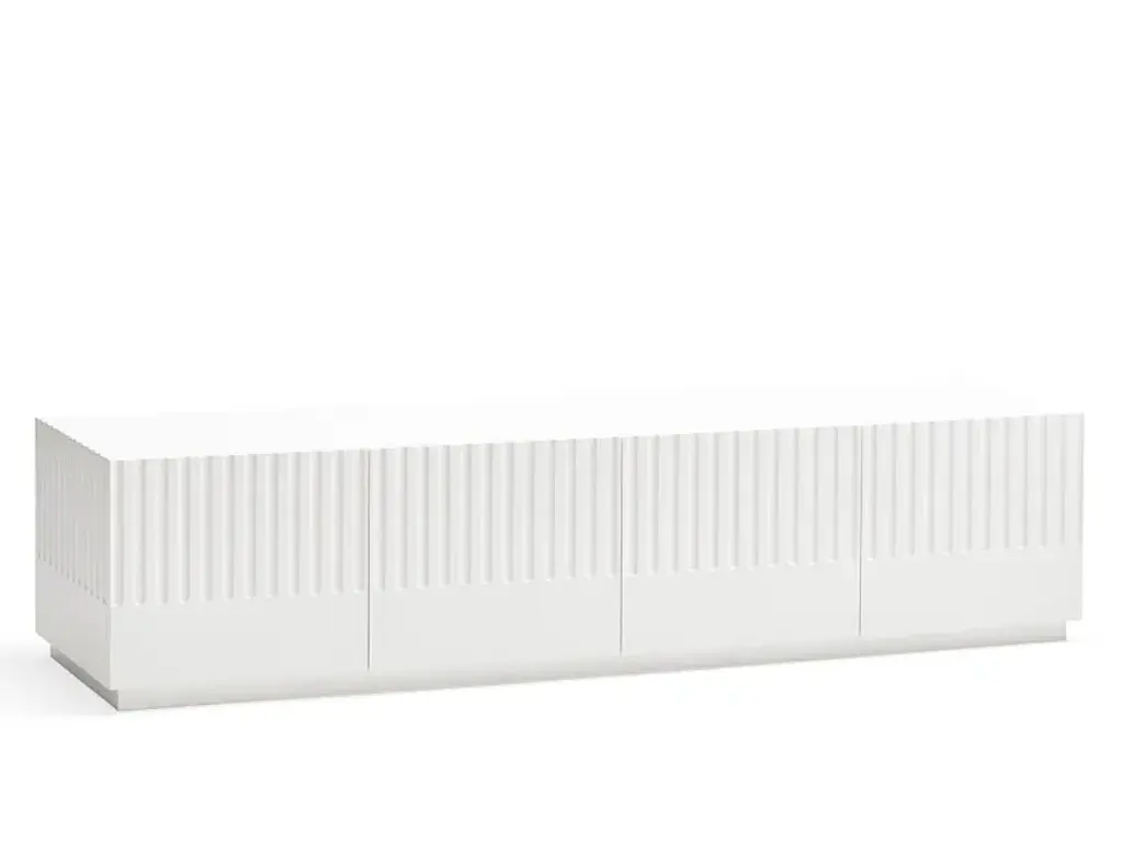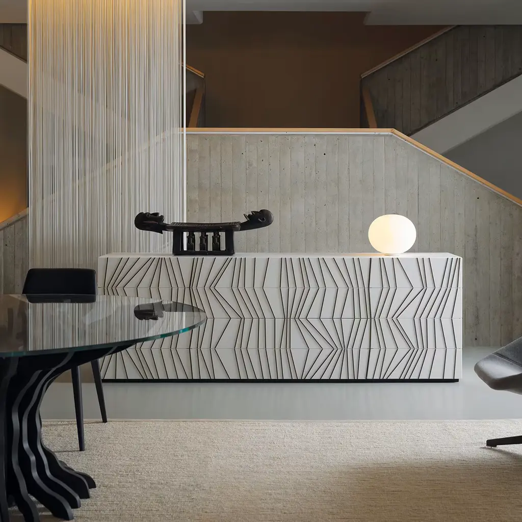 This captivating sideboard is a sophisticated piece of decor that will make a statement in any contemporary interior. Handcrafted of ash wood, it features a matte white lacquered finish enriched with embossed geometric lines. The frame is composed of four sections: two side doors and two sets of drawers in the middle, equipped with a push-pull opening mechanism. An additional drawer is hidden inside right below the top for added storage.