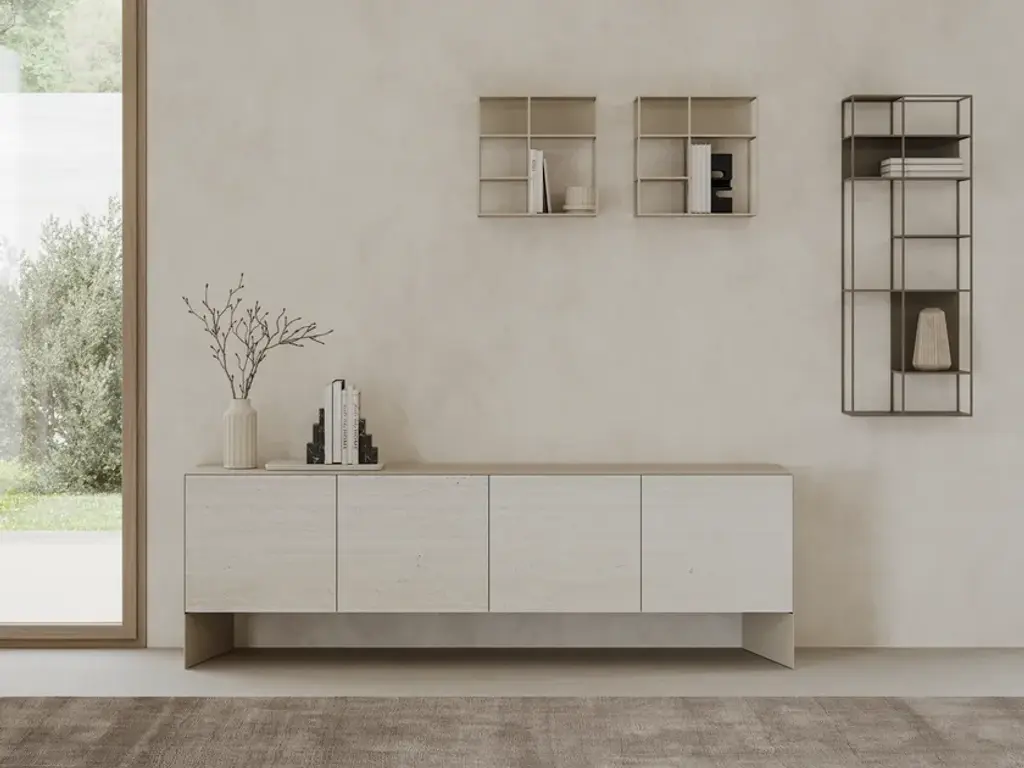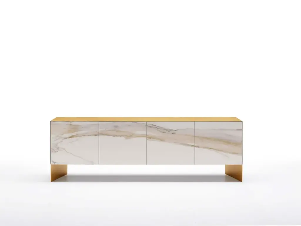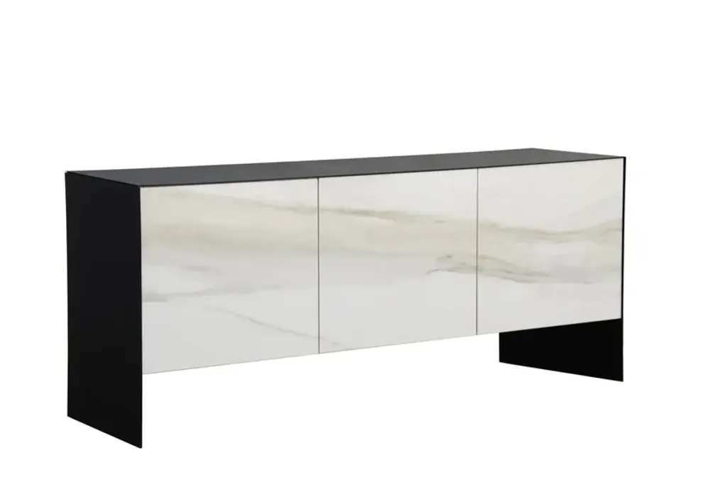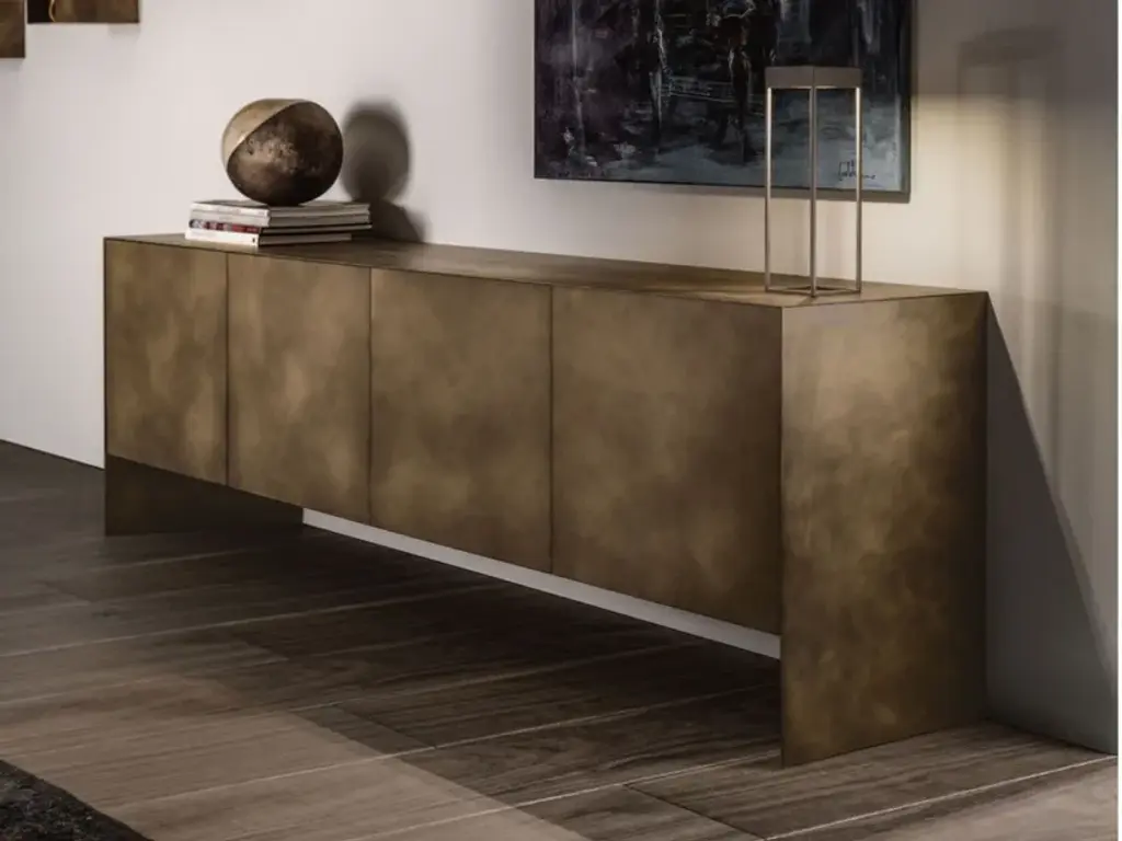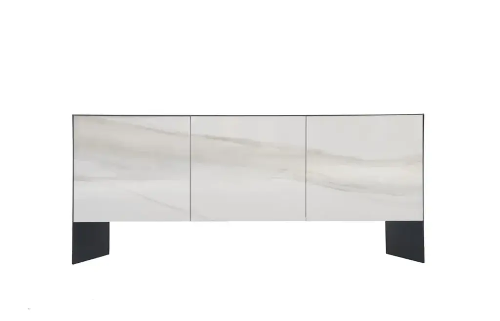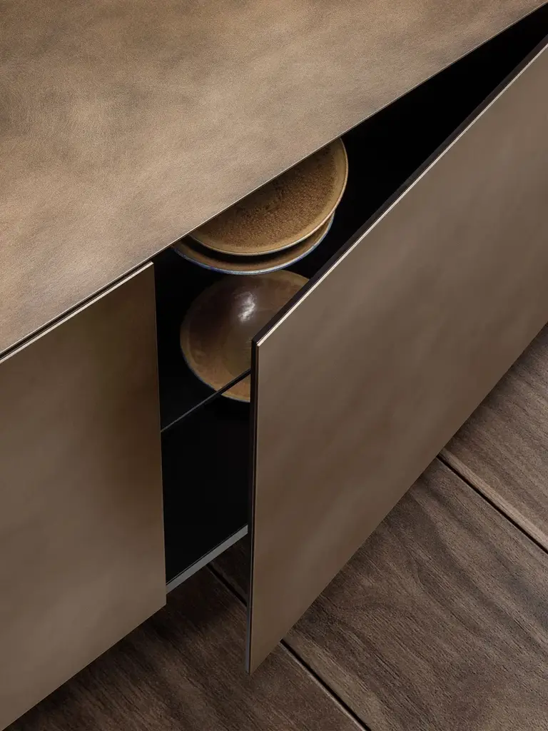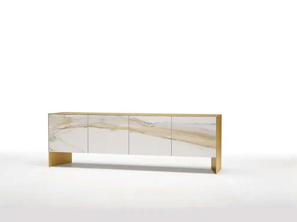 Nemesi is a sideboard with three or four doors characterized by a thin but sturdy structure in painted metal that covers the top and sides of the cabinet giving it a light and essential design. The Nemesi sideboard is available in the version completely covered in metal (cover and doors), or alternatively with ceramic or wooden doors. Doors opening with push pull system and three internal compartments with elegant glass shelf.