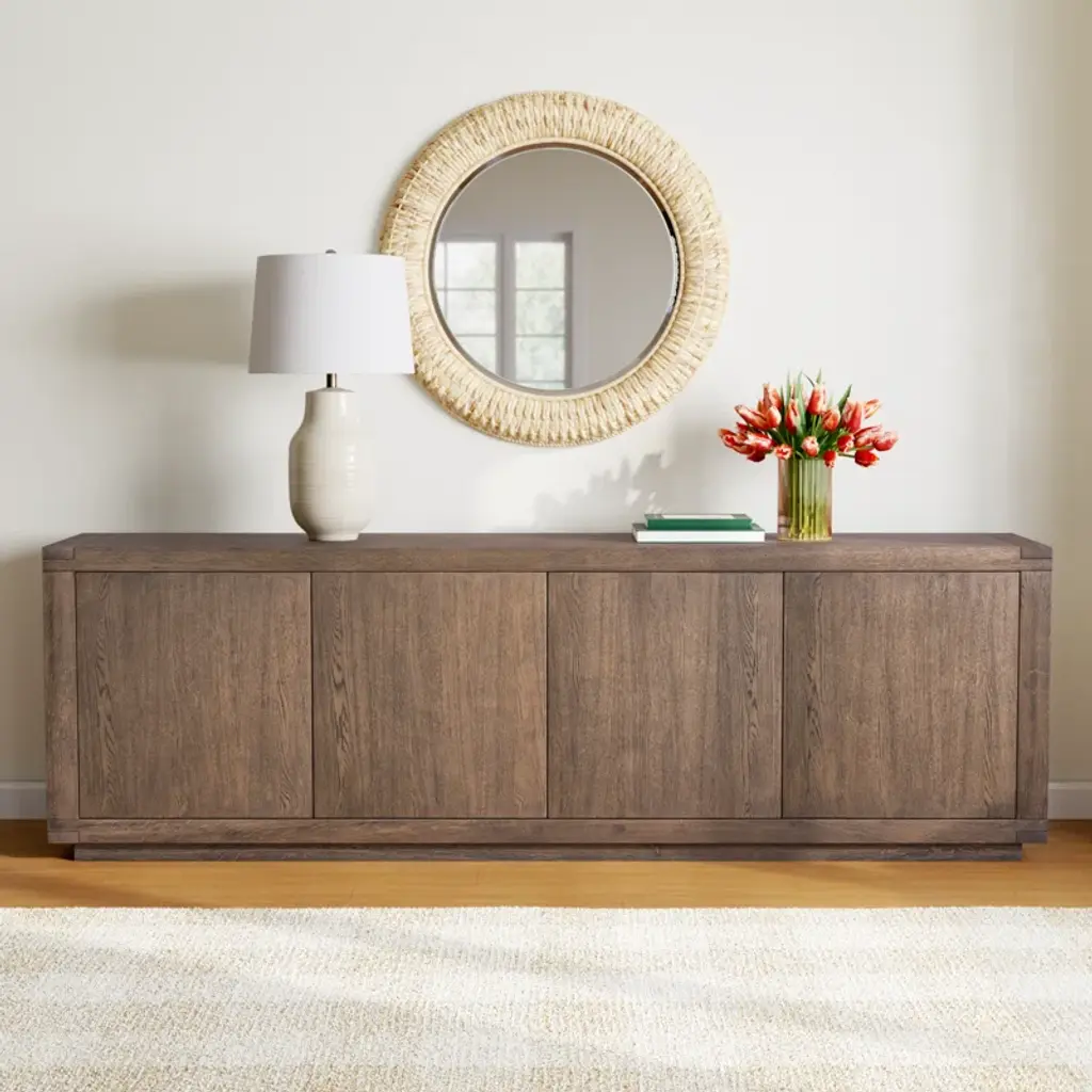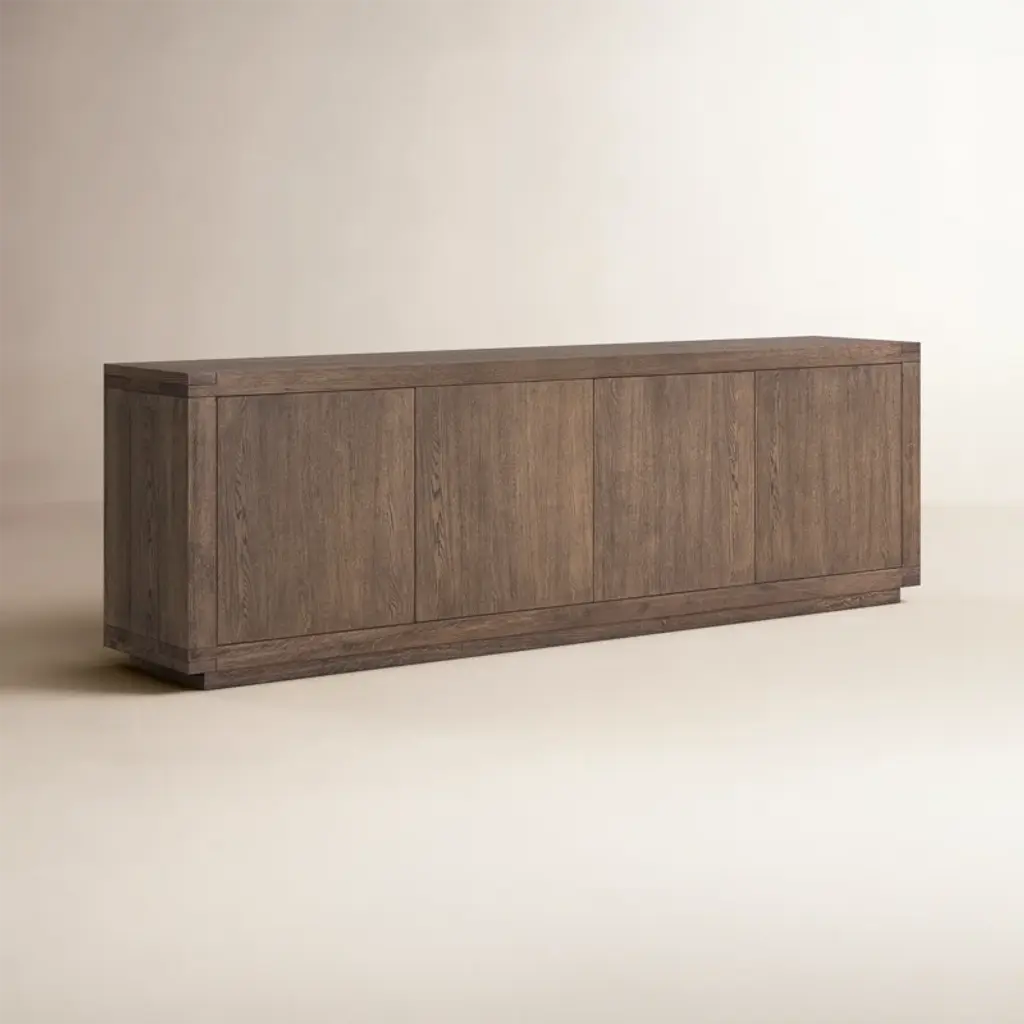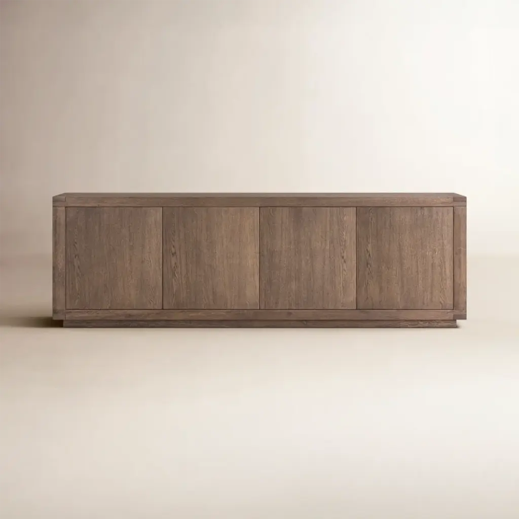 This solid wood sideboard brings a stylish, rustic look to your dining room or living space with its clean lines and natural wood grain variation. Crafted from oak, it features a plinth base and a finished back for versatile placement in any room. This sideboard offers ample storage with four doors and two adjustable interior shelves, offering space for everything from books and board games to dishes and media items. The cable management system keeps your cords organized, while the tip-over restraint device adds an extra layer of safety. Make a statement in your home with this functional piece.