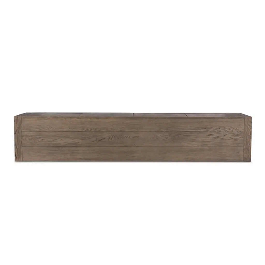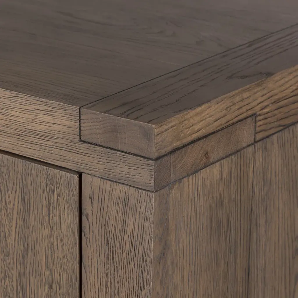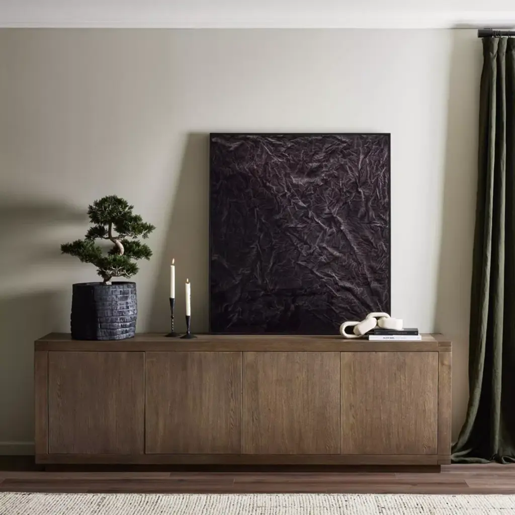 This solid wood sideboard brings a stylish, rustic look to your dining room or living space with its clean lines and natural wood grain variation. Crafted from oak, it features a plinth base and a finished back for versatile placement in any room. This sideboard offers ample storage with four doors and two adjustable interior shelves, offering space for everything from books and board games to dishes and media items. The cable management system keeps your cords organized, while the tip-over restraint device adds an extra layer of safety. Make a statement in your home with this functional piece.