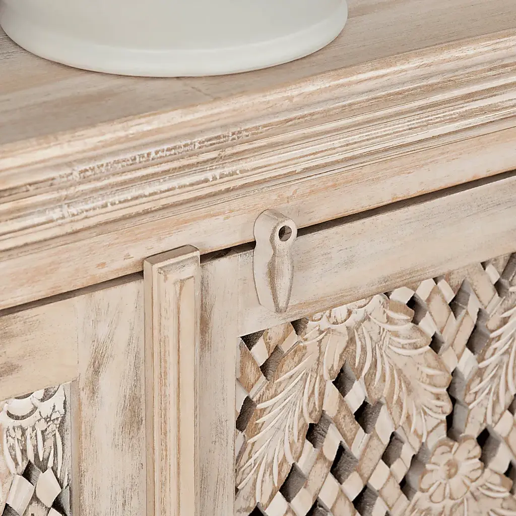 The Nemomaster natural sideboard, made from durable mango wood, features a charming whitewash finish that enhances its intricate hand-carved floral lattice doors. Behind the four doors, you'll find two removable interior shelves, offering flexible storage solutions. Thoughtfully designed with cord management holes and sturdy floor levelers, it's as practical as it is stylish. Matte black drop ring handles add a bold accent, making this sideboard a functional yet eye-catching piece for your space.