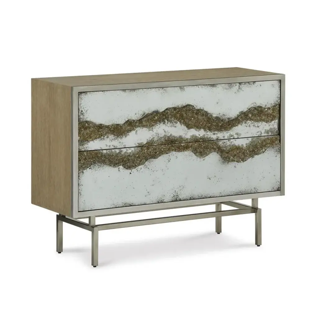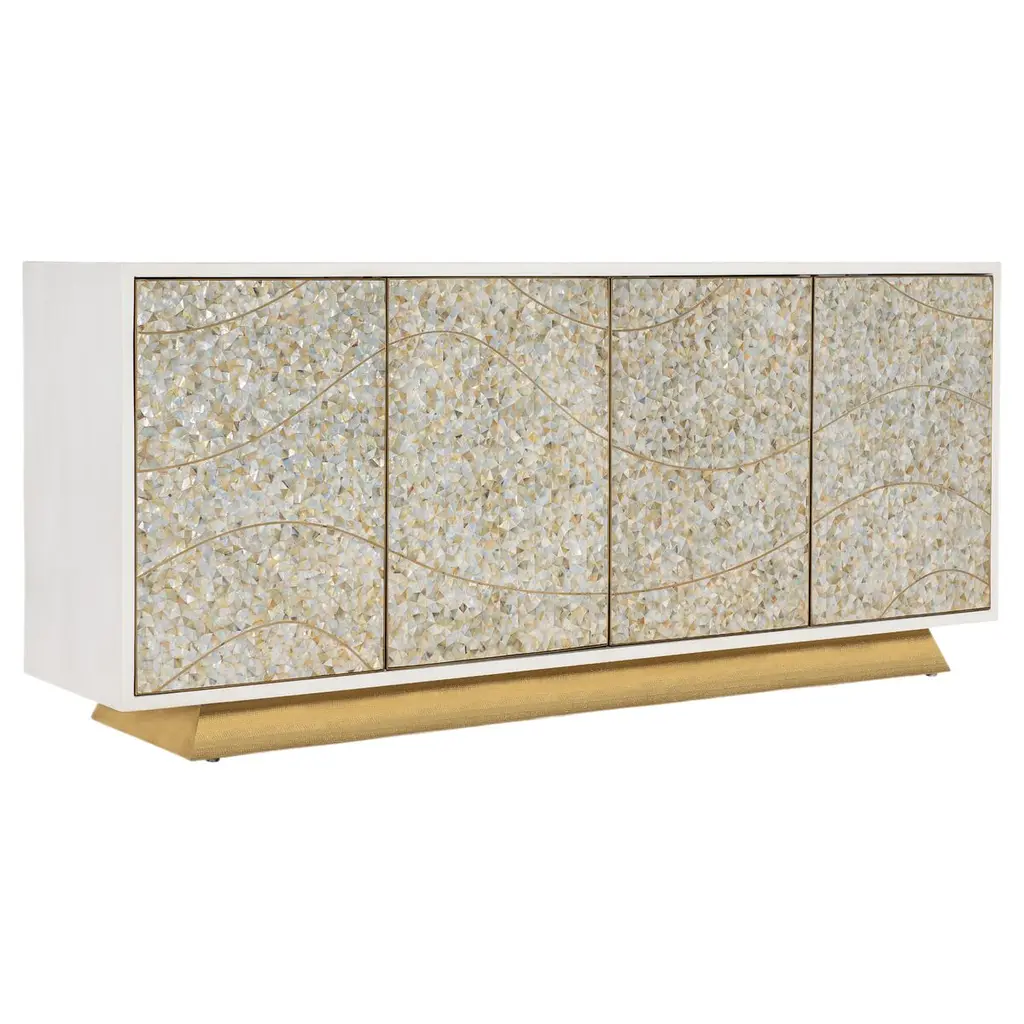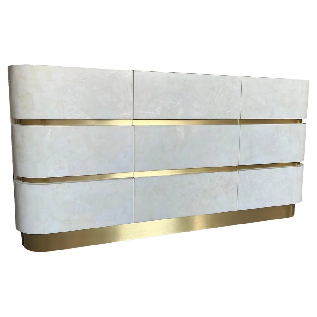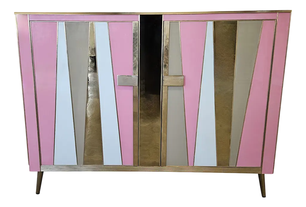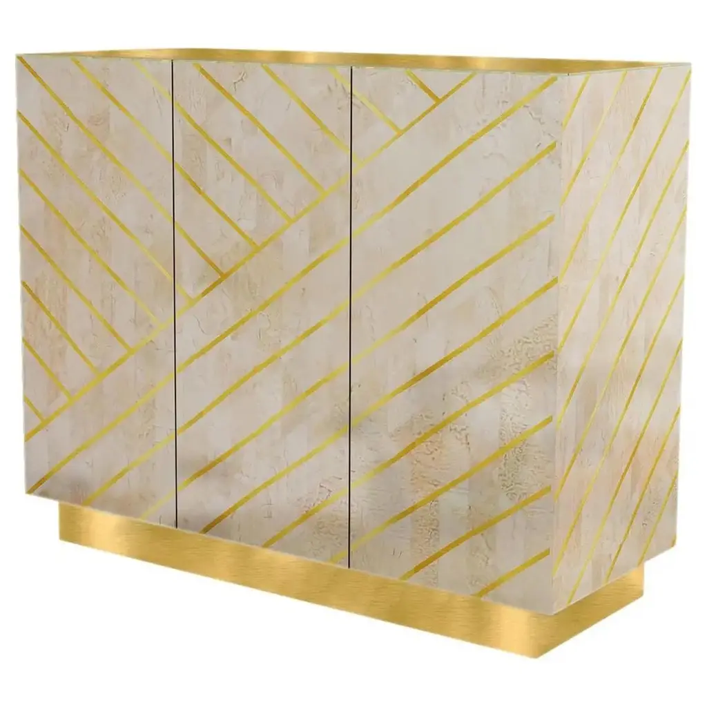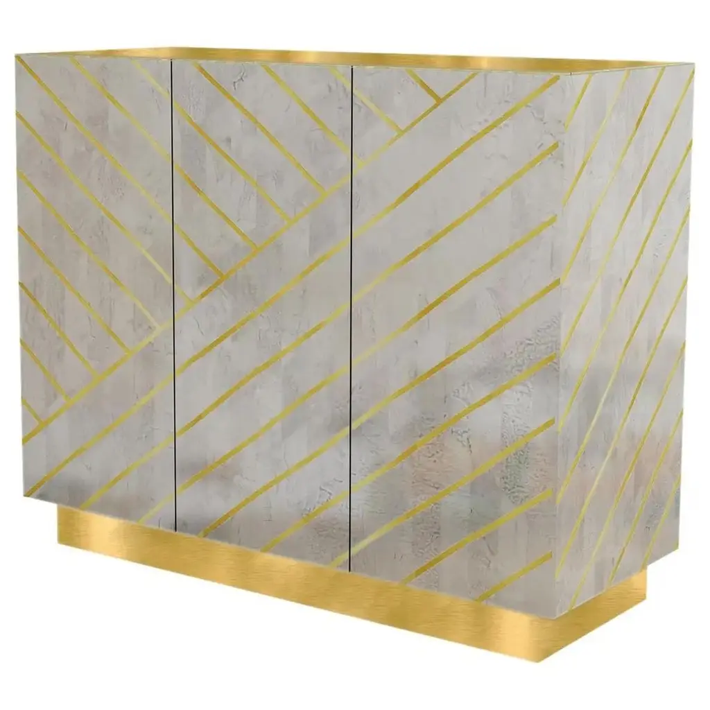 Nesso Small Sideboard with Brass Inlay by Matteo Cibic is a beautiful cabinet in pearly resin with geometric brass inlay and a luxurious brass top. It comes in three colors, beige, gray and mint. Custom sizes, colours and finishes are available on request.Awarded designer Matteo Cibic's playful style has helped magnify the confluence between Indian and Western references, bridging elements of Renaissance architecture, Art Deco and pop art, cohesively into the Nesso collection. This Italian trans-media designer likes to experiment with material and design, but always respects the integrity of the final piece The Nesso collection seems naturally drawn to drama, creating gallant spaces, wherever placed. The theatrical shapes and wildly expressive decor define the designer's brilliance. The furniture in this collection traces its roots to traditional Italian Boulle inlay work and the lineage of the brass workers of India, creating a unique yet authentic synchronicity of the two cultures. Each strip is individually placed on to the furniture, delightfully combining resin and brass. This very skillful technique, one may say, is an invention on its own. The entire collection is delicately finished with mother of pearl. The Scarlet Splendour duo and Cibic have taken India's traditional brass work to refreshing heights of luxury. Each product is meticulously handmade in India.Care: Wipe with a soft, dry cloth. Use a brass cleaner if required.Please note: Each piece in the Nesso collection exalts the handmade, the painstakingly crafted, the authentic. A piece may have slight variations and tiny imperfections but these are the marks of an artisan, a testament to the individuality of each work of art. It is our belief that these variations infuse our objects d'art which desire and we assert our right to make the necessary qualitative changes. Prices do not include VAT. VAT may be applied depending on the ship-to location.