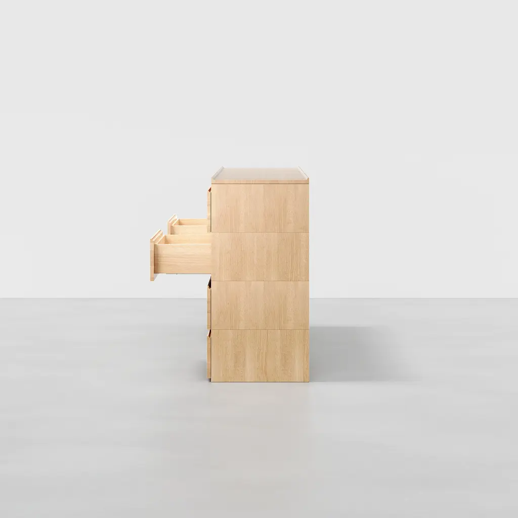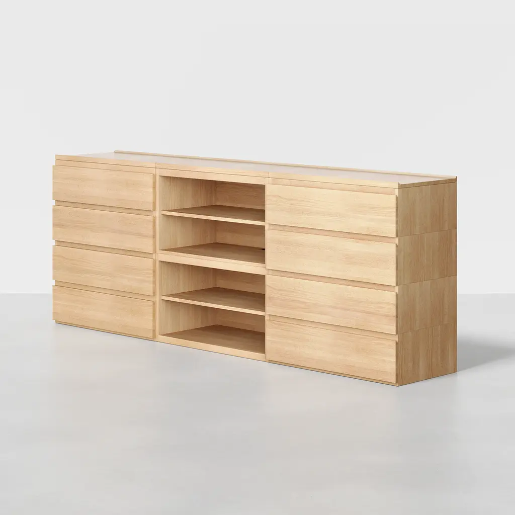 A highly functional centerpiece, made from solid, upcycled wood. The Nest Credenza anchors any room and provides space to display and stow. Versatile low-profile design can also be purposed as a media console or sideboard. Do not stack higher than 47" max. Compatible with the Nest Dresser, Nest Shelving, Nest Nightstand Open, Nest Shelf, and Nest Drawer.