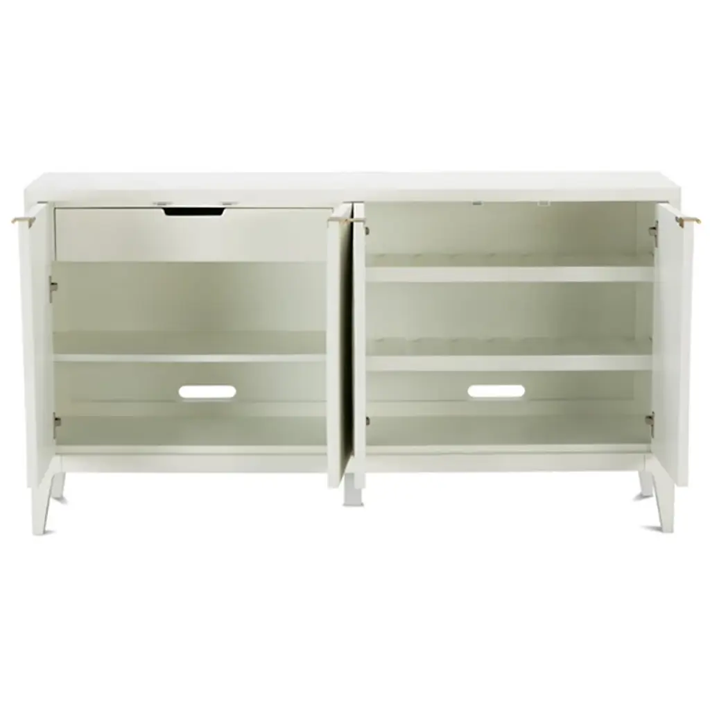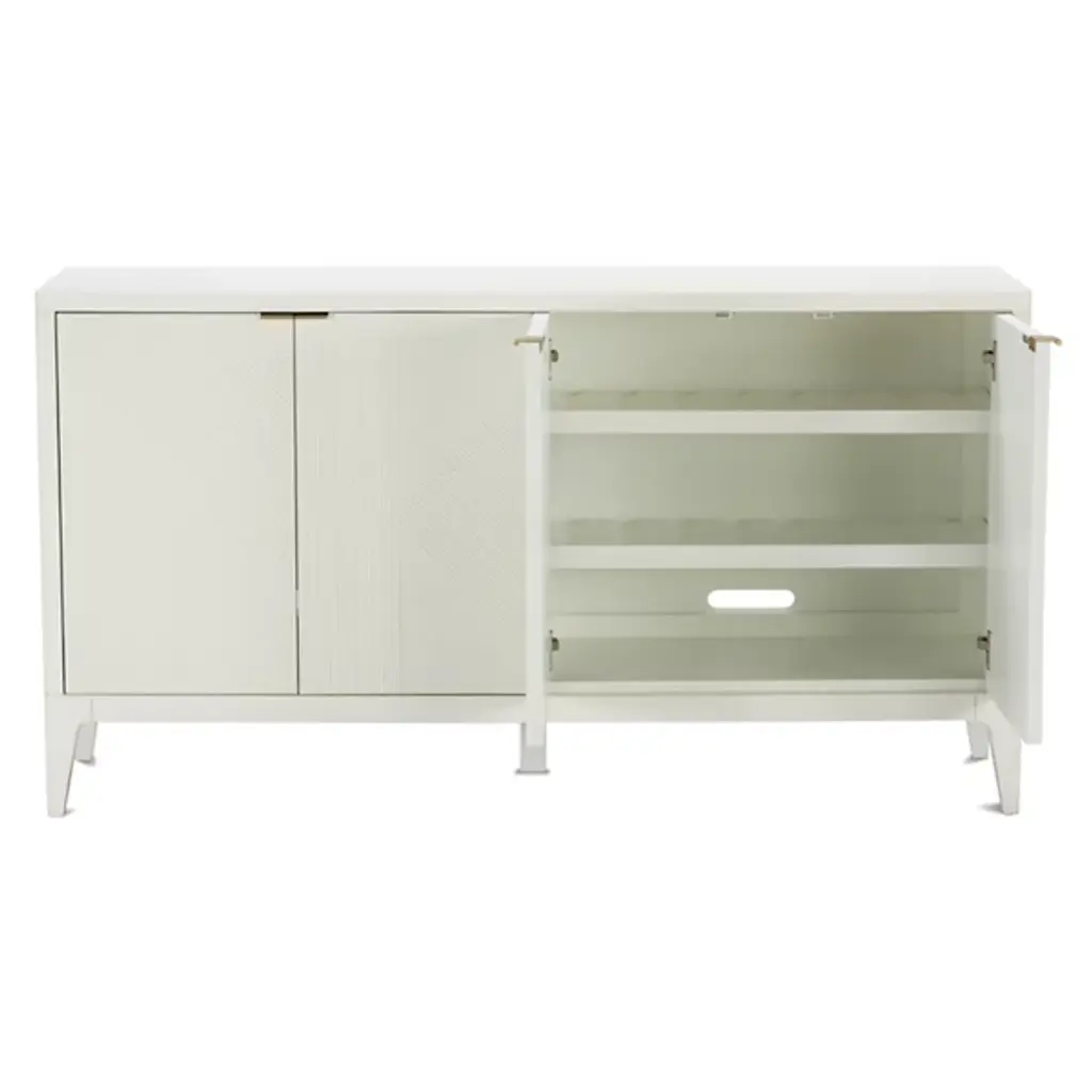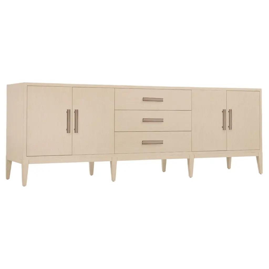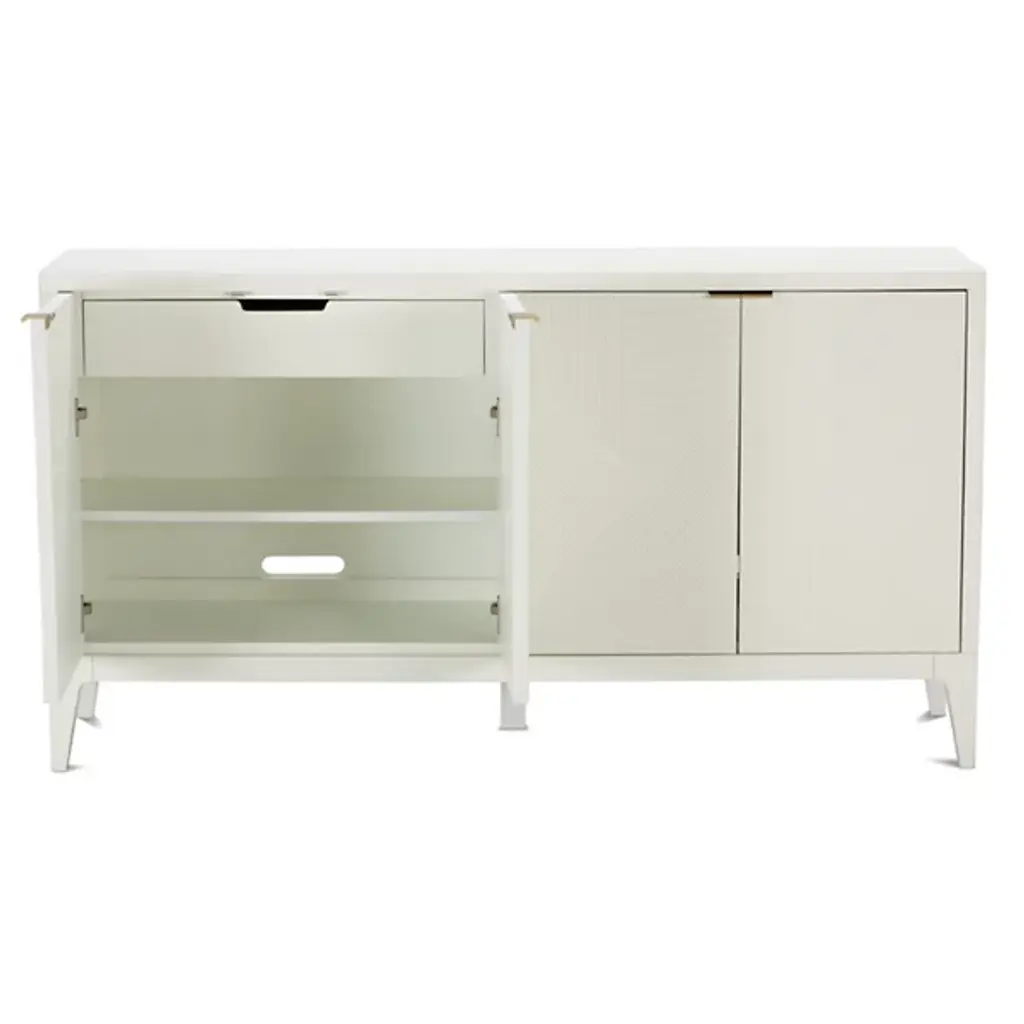 The Nicco Credenza from Rowe Furniture exemplifies contemporary style with its brushed brass tab hardware and refined design. Featuring soft-close hinges and a single interior drawer, it offers both functionality and elegance. Reversible grooved shelves are adjustable and stylish, providing versatile storage options, while floor glides offer stability and easy relocation. The credenza combines modern aesthetics with practical features, making it a sophisticated addition to any room.