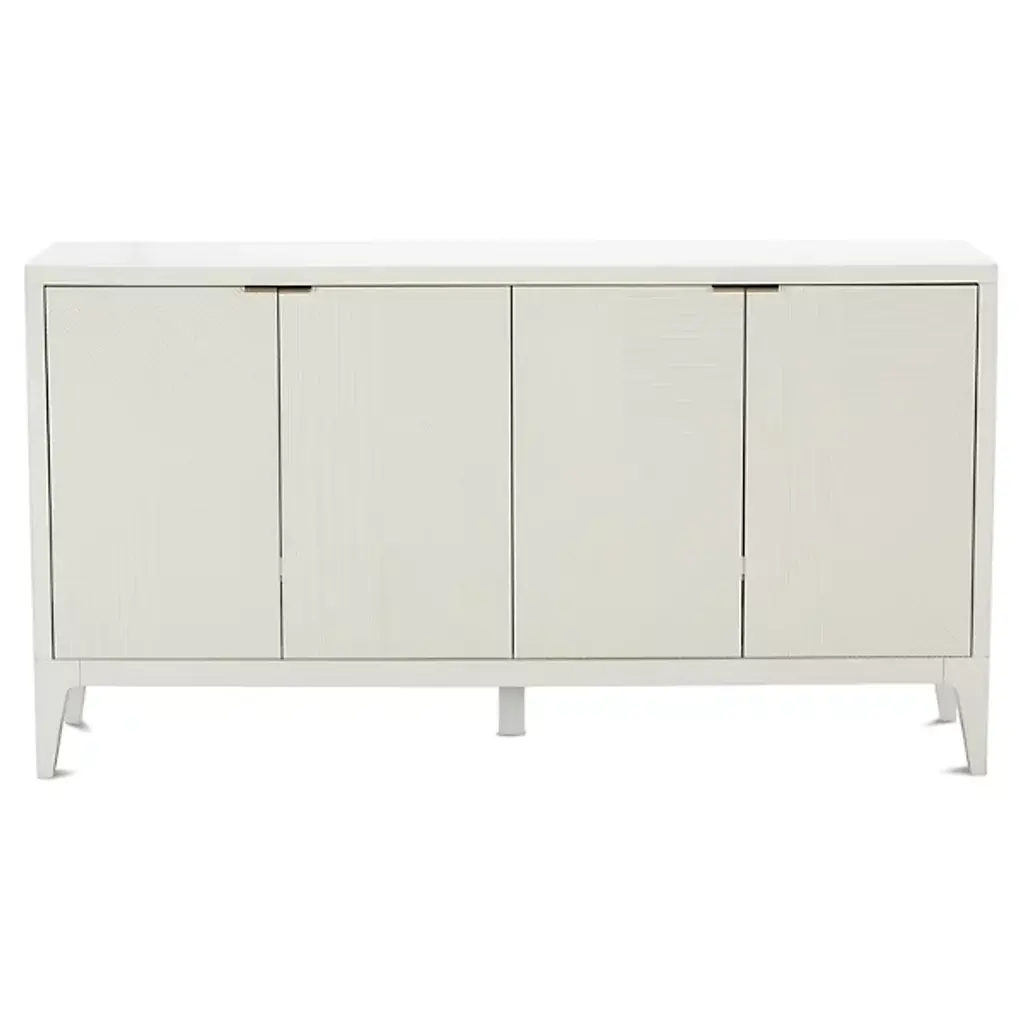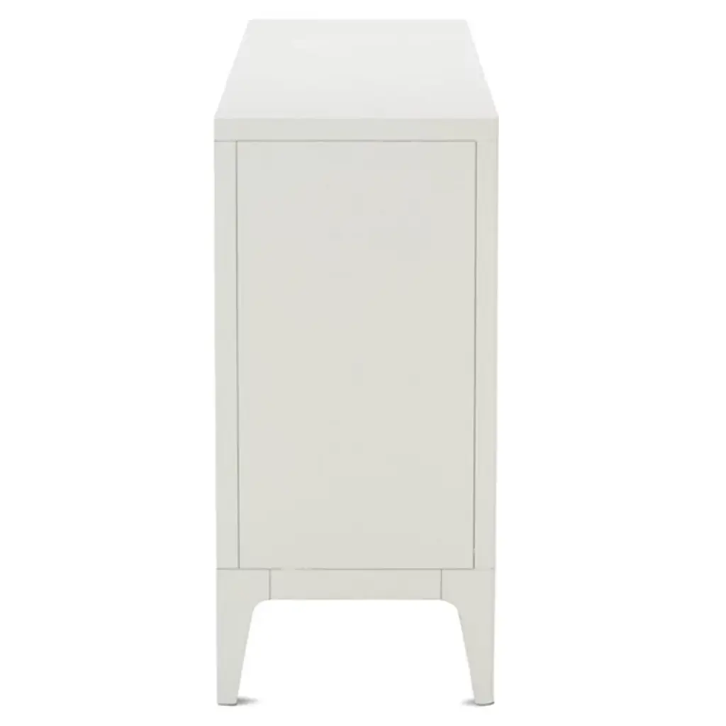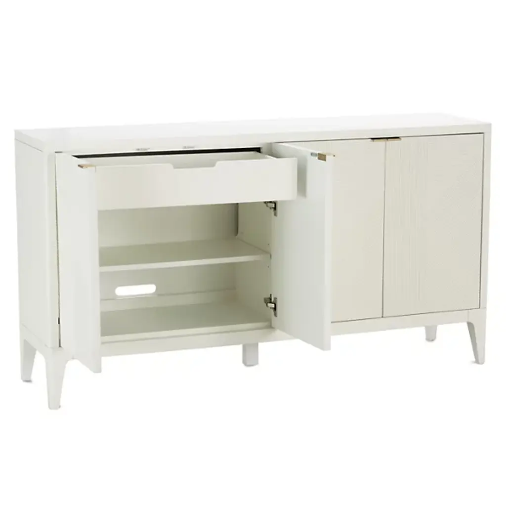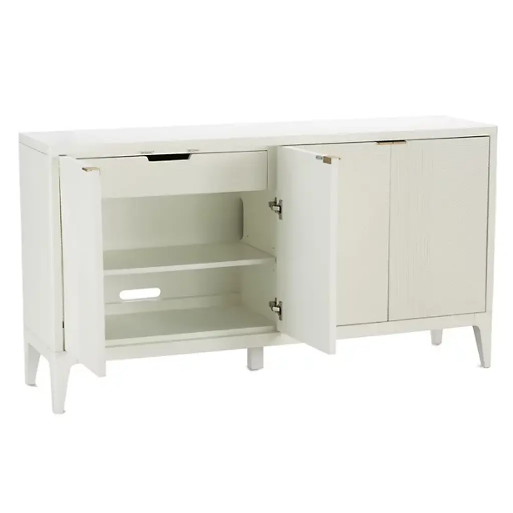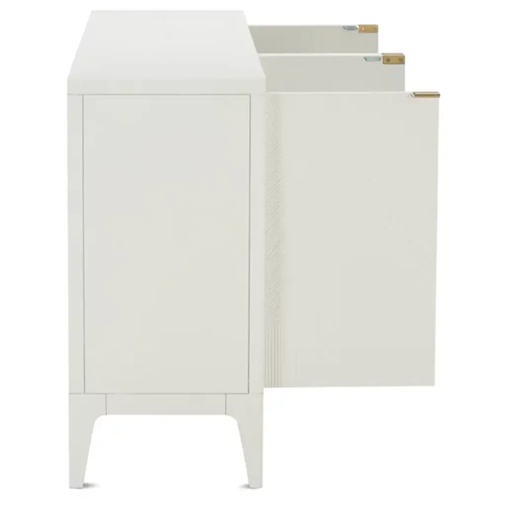 The Nicco Credenza from Rowe Furniture exemplifies contemporary style with its brushed brass tab hardware and refined design. Featuring soft-close hinges and a single interior drawer, it offers both functionality and elegance. Reversible grooved shelves are adjustable and stylish, providing versatile storage options, while floor glides offer stability and easy relocation. The credenza combines modern aesthetics with practical features, making it a sophisticated addition to any room.