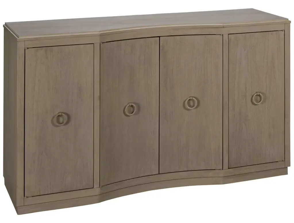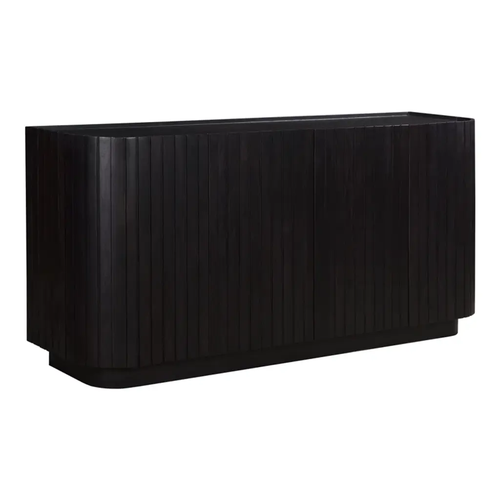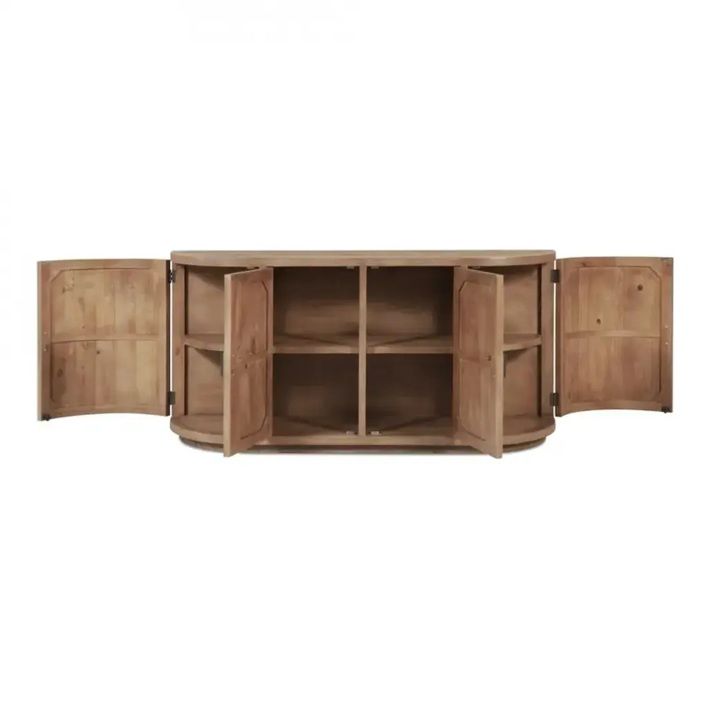 Rustic charm and contemporary design come together through reclaimed pine in the Nicola sideboard. Featuring curved doors that soften its texture, its contemporary recessed base contrasts with the rustic wood, offering a modern silhouette ideal for transitional spaces. The simple handle detail accentuates the curved design, with generous storage inside for essentials. At a comfortable 35" height, it's designed for both functionality and style, fitting seamlessly into the dining area.