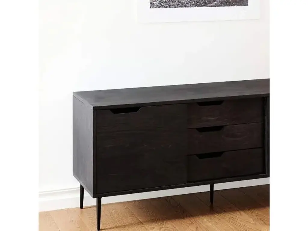 Noble is a sideboard made of oak veneer or birch plywood, with silent sliding doors. Height-adjustable shelves behind the sliding doors. Concealed drawers with soft-close, sliding door on Häfele guides. Sturdy black metal legs with an adjustable height of 17 cm.