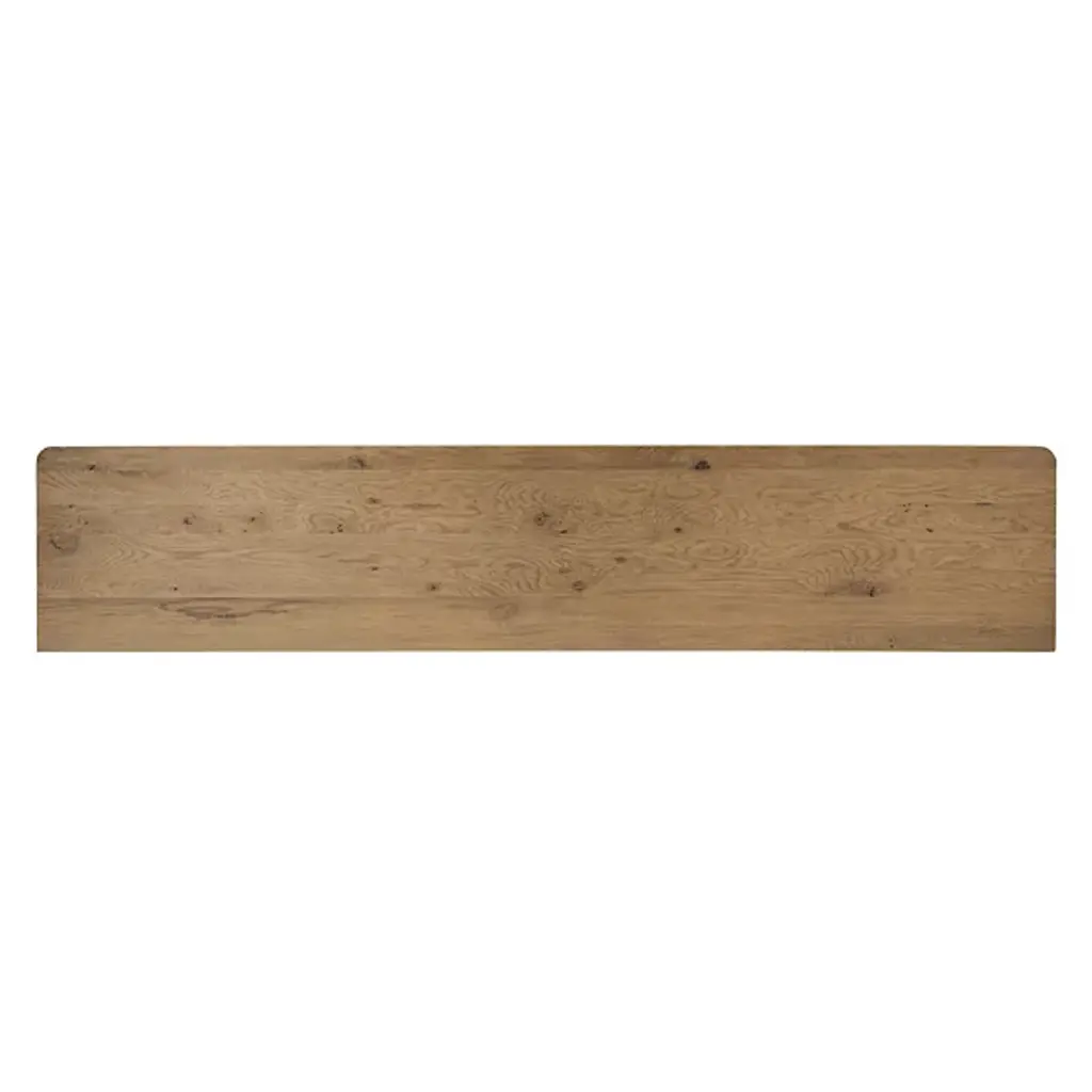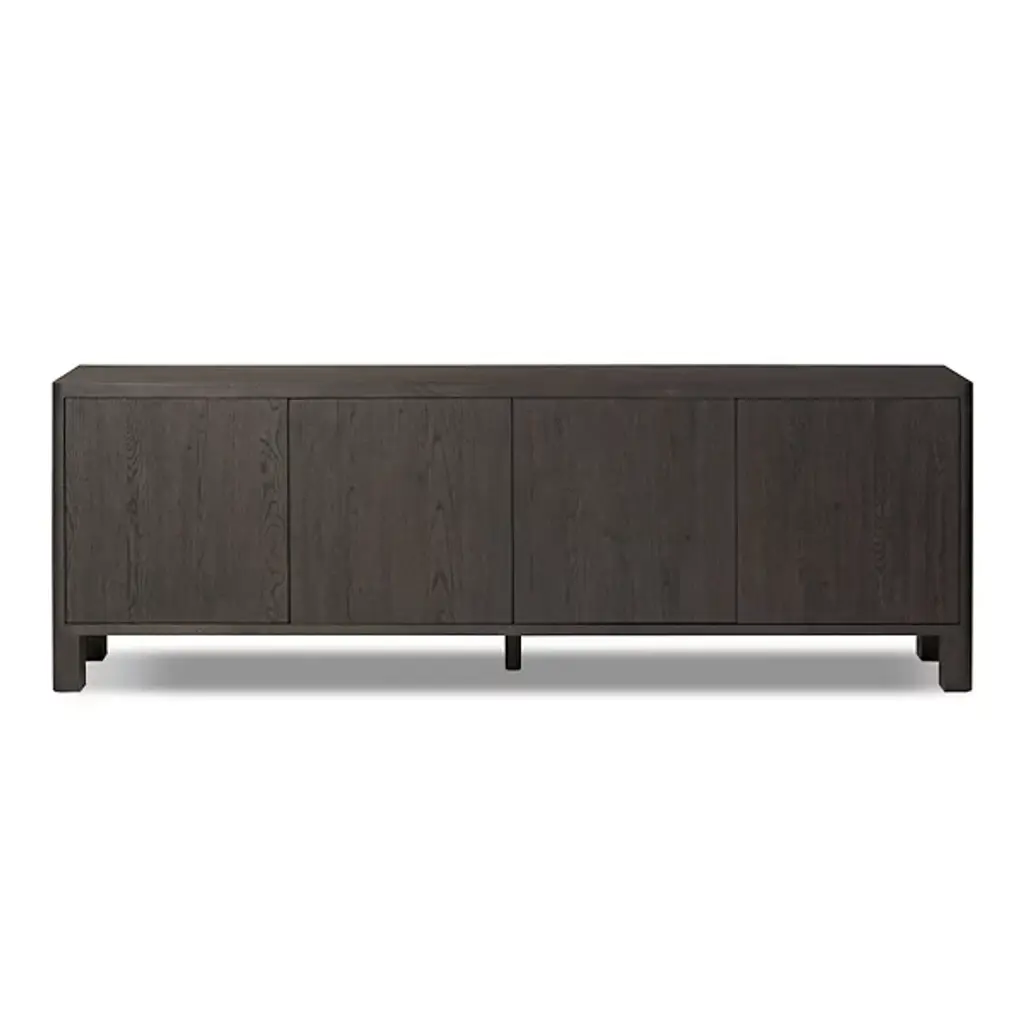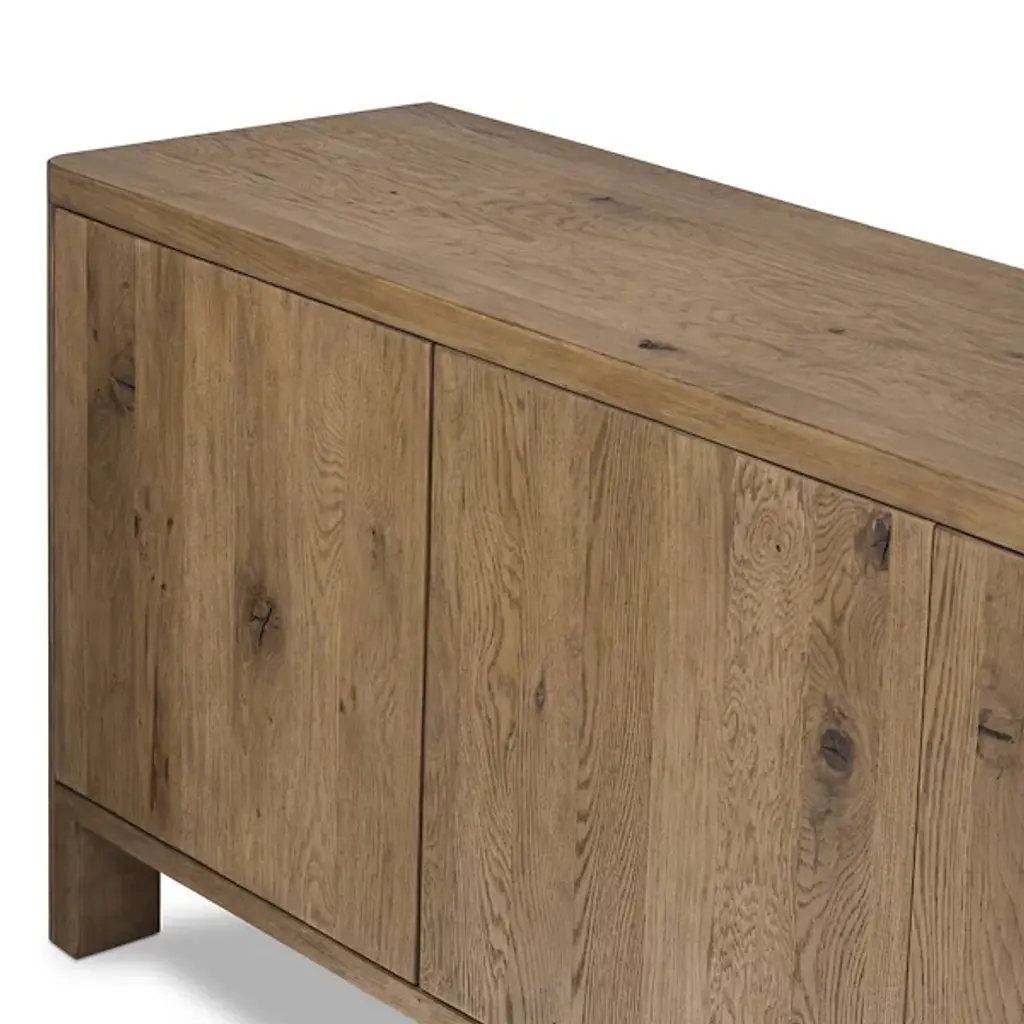 Crafted from resawn oak with a worn, natural finish, the Noeline Sideboard from Four Hands offers generous storage behind four push-latch doors. The design features subtly rounded corners that soften its clean lines, while natural knots and graining enhance its rich, organic appeal. Dual rear cutouts ensure seamless cord management, making this sideboard both stylish and functional, perfect for adding a touch of warmth and practicality to any space.