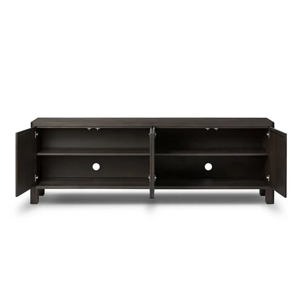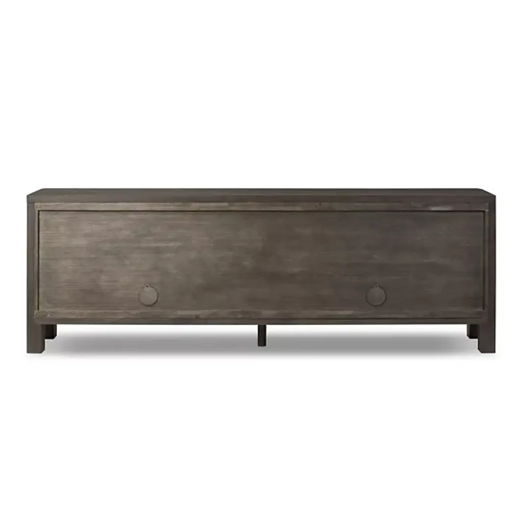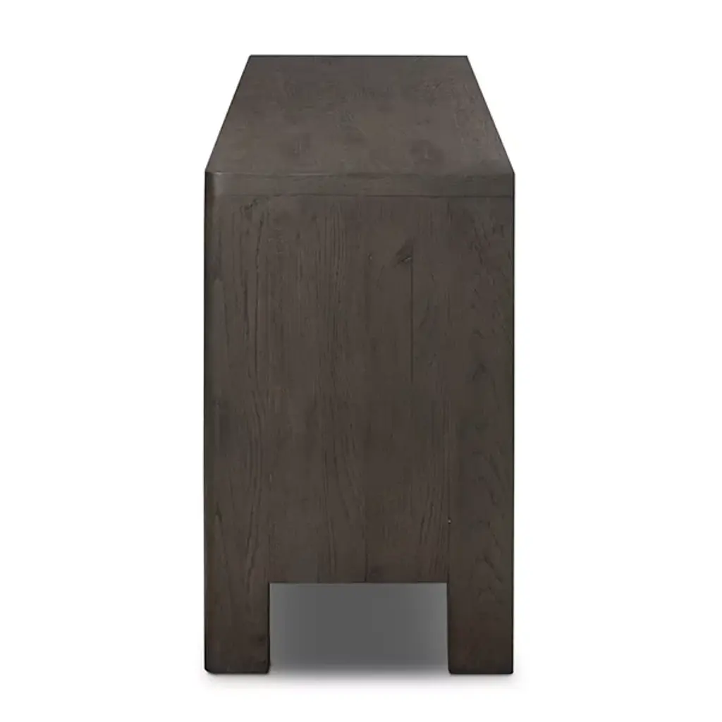 Crafted from resawn oak with a worn, natural finish, the Noeline Sideboard from Four Hands offers generous storage behind four push-latch doors. The design features subtly rounded corners that soften its clean lines, while natural knots and graining enhance its rich, organic appeal. Dual rear cutouts ensure seamless cord management, making this sideboard both stylish and functional, perfect for adding a touch of warmth and practicality to any space.