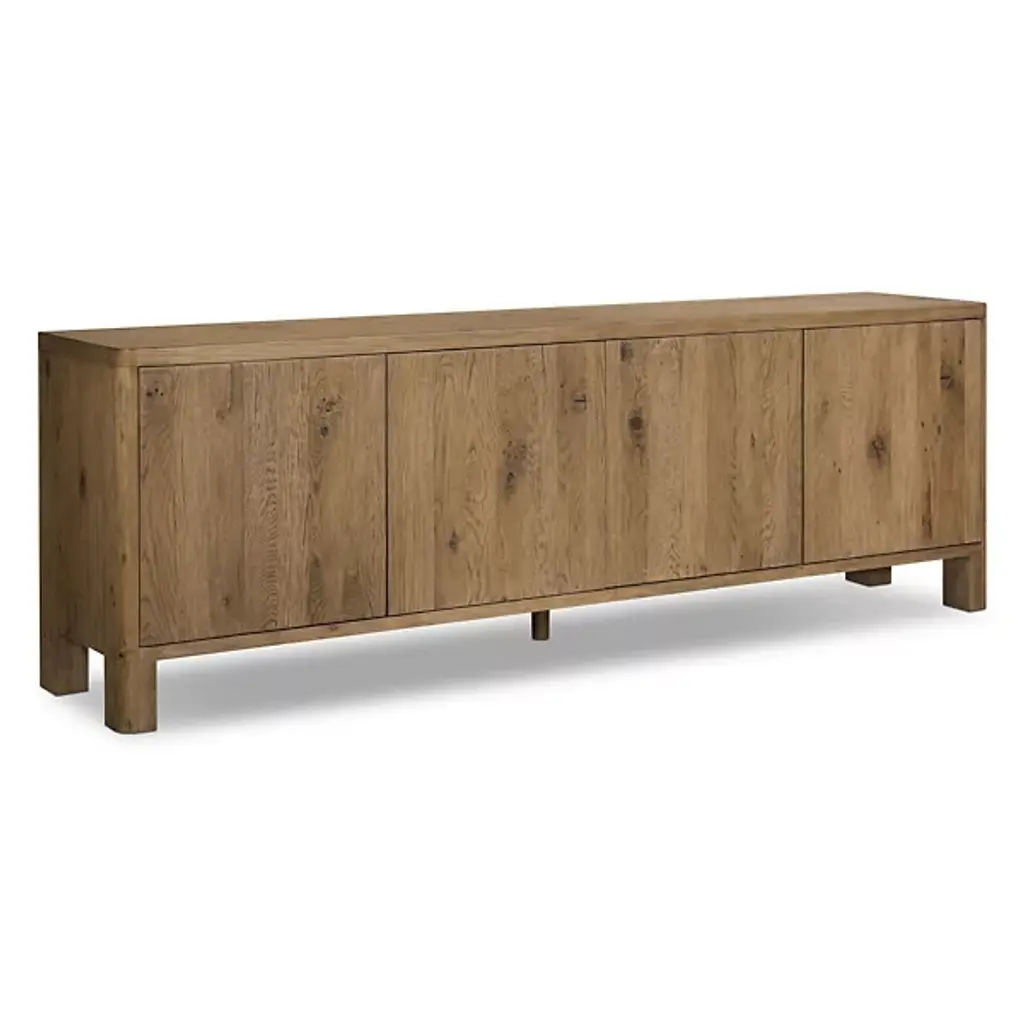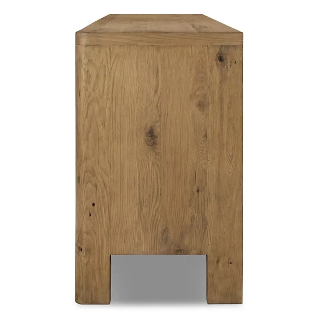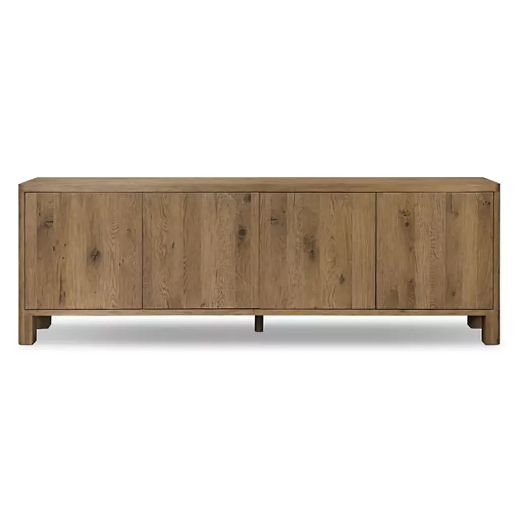 Crafted from resawn oak with a worn, natural finish, the Noeline Sideboard from Four Hands offers generous storage behind four push-latch doors. The design features subtly rounded corners that soften its clean lines, while natural knots and graining enhance its rich, organic appeal. Dual rear cutouts ensure seamless cord management, making this sideboard both stylish and functional, perfect for adding a touch of warmth and practicality to any space.