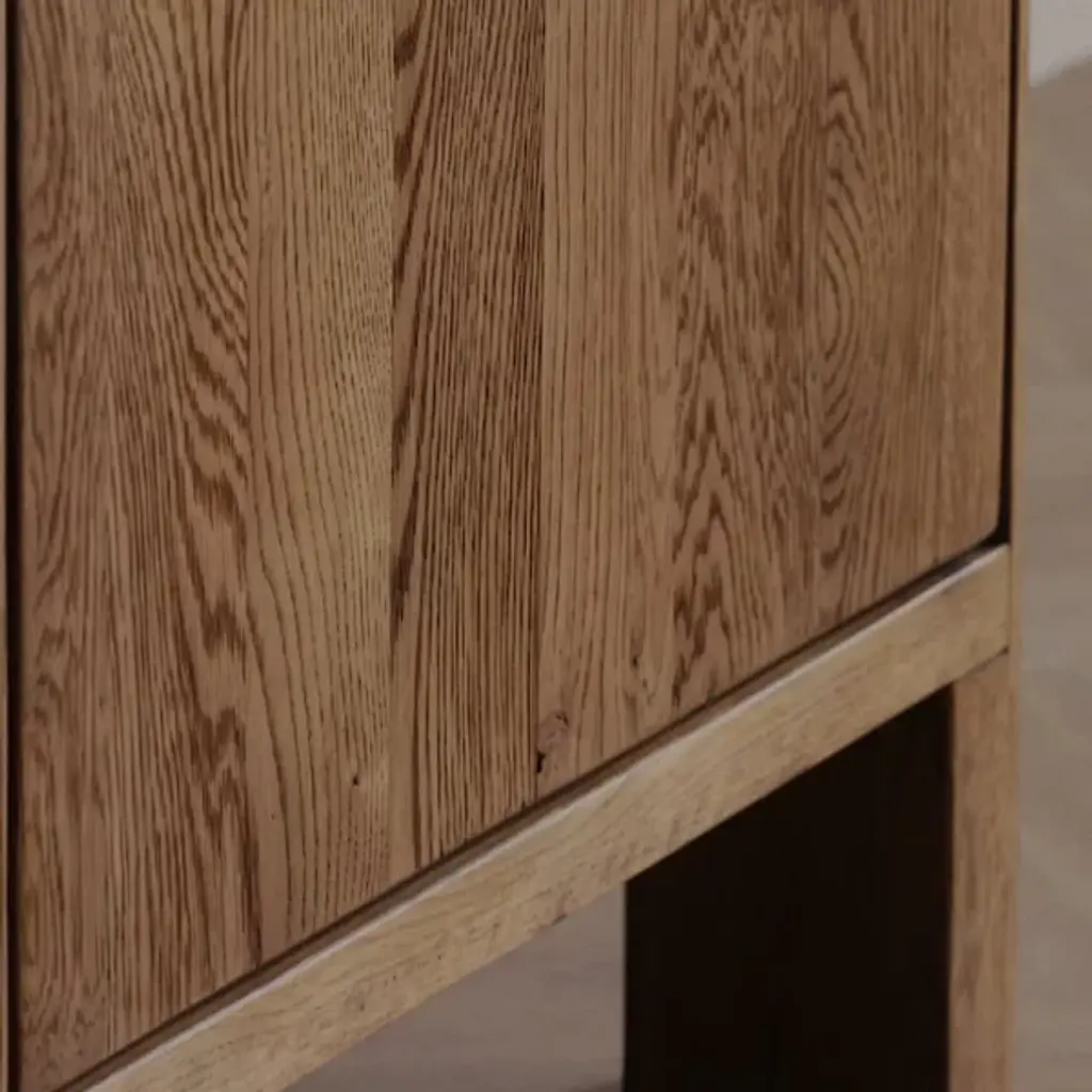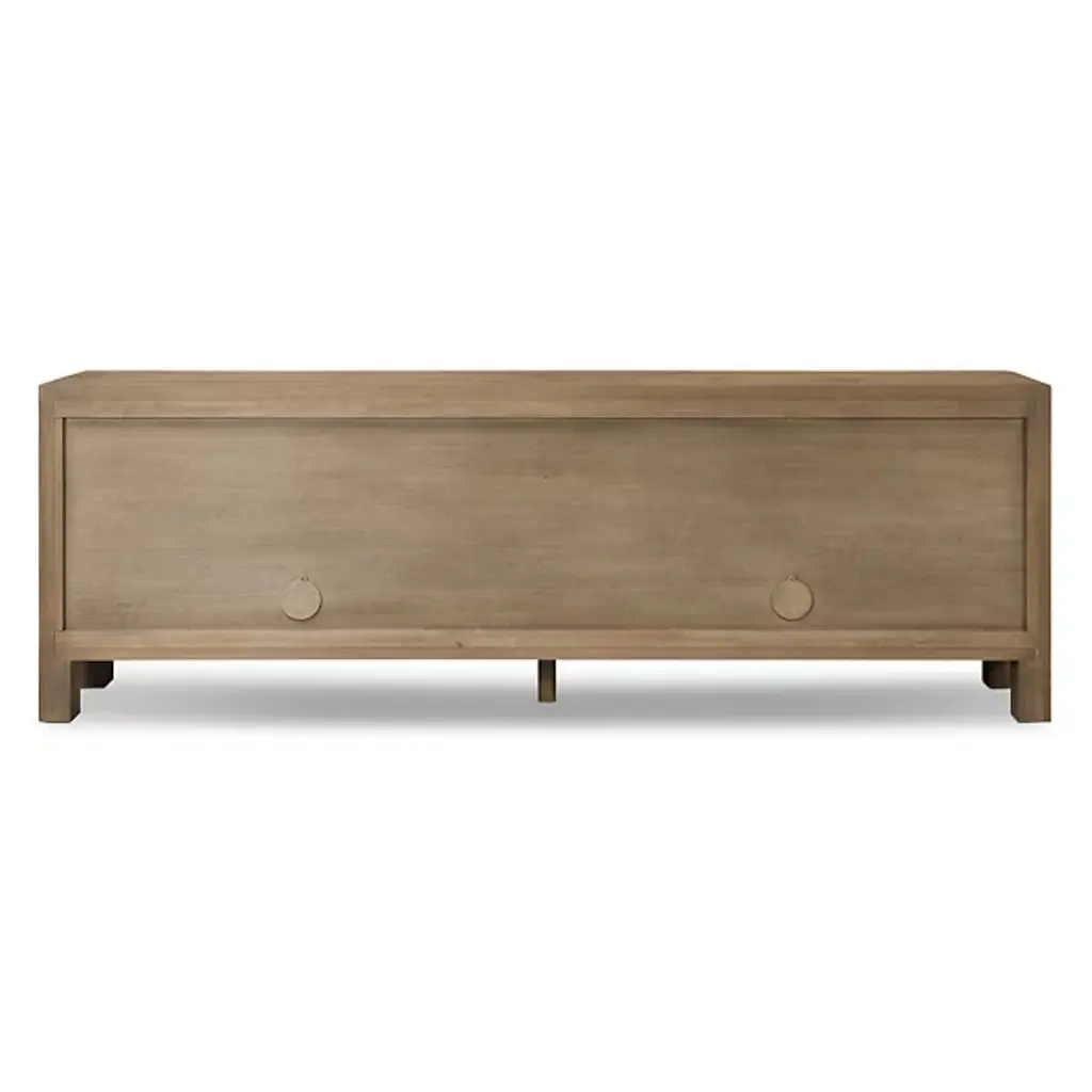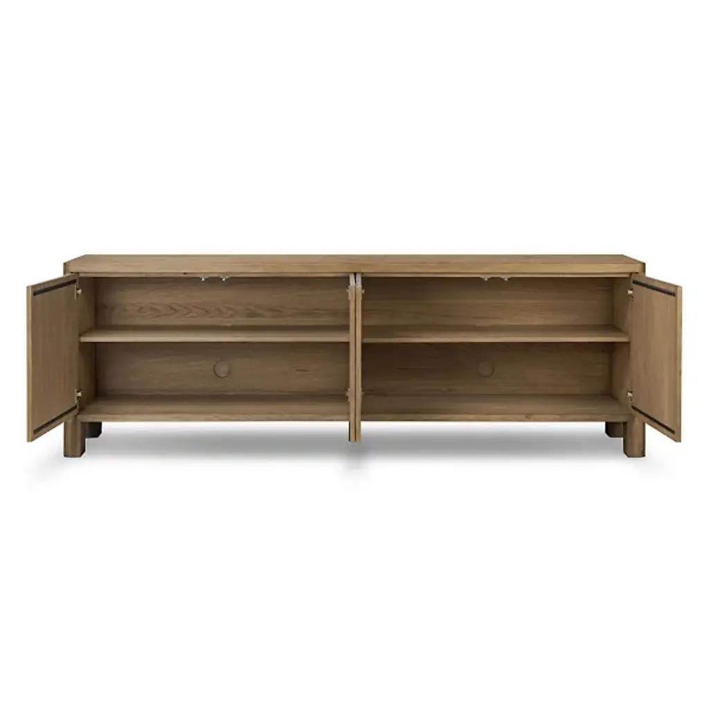 Crafted from resawn oak with a worn, natural finish, the Noeline Sideboard from Four Hands offers generous storage behind four push-latch doors. The design features subtly rounded corners that soften its clean lines, while natural knots and graining enhance its rich, organic appeal. Dual rear cutouts ensure seamless cord management, making this sideboard both stylish and functional, perfect for adding a touch of warmth and practicality to any space.