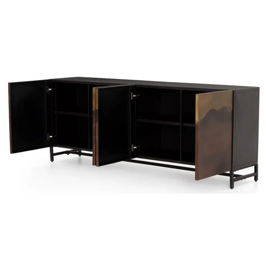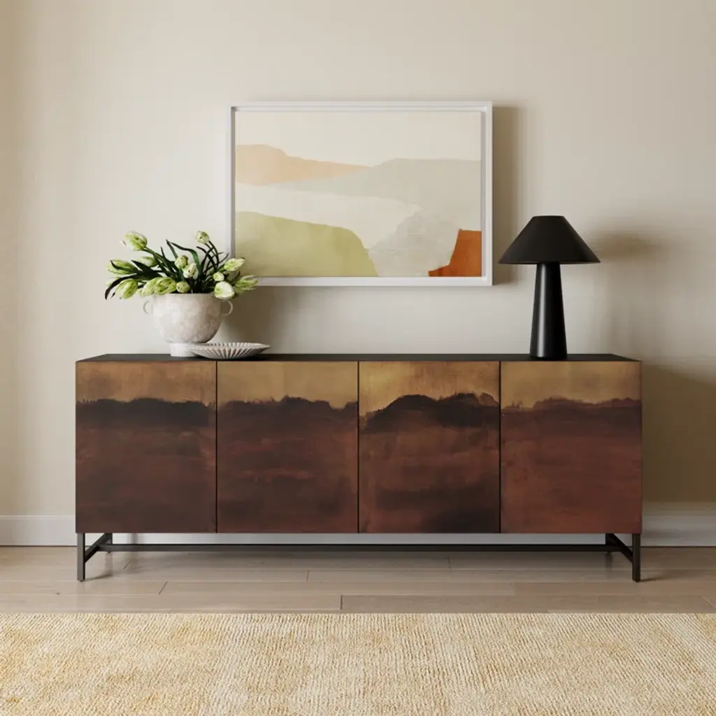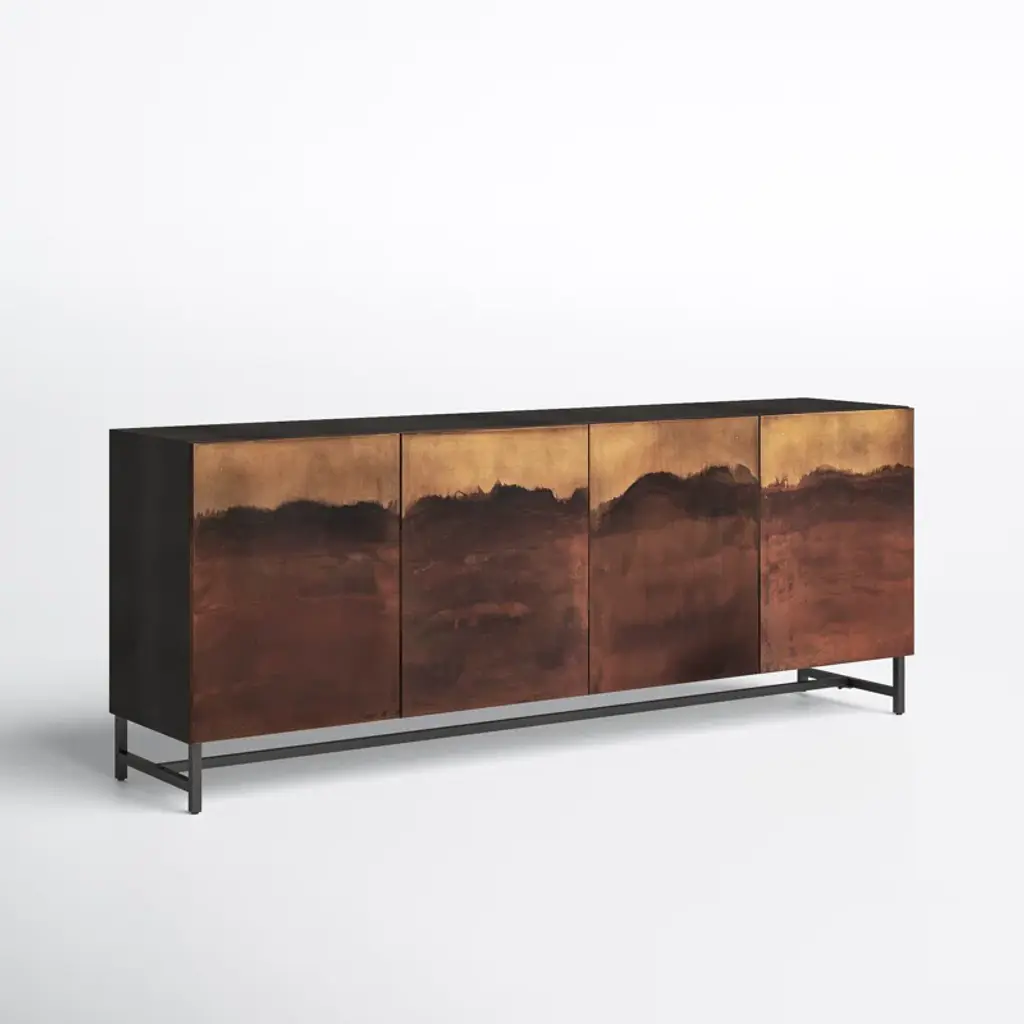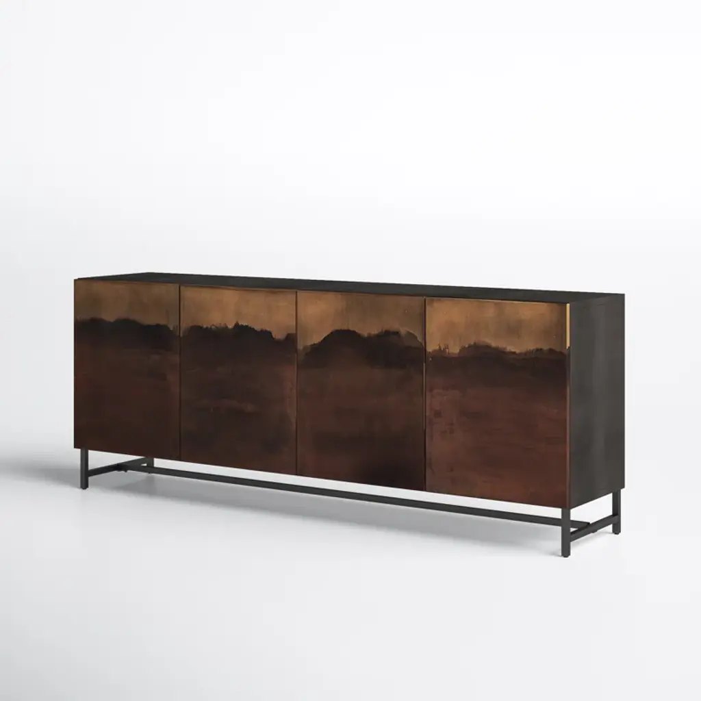 This 82” wide sideboard combines functionality with artistic design. It’s crafted from metal in rich brown and ombre tones and set atop a sturdy iron frame. Its four cabinet doors showcase a hand-rubbed finish for a uniquely aged, visually textured look. Inside, eight shelves provide storage for serving ware, media equipment, and more. The sleek, hardware-free design creates a modern, streamlined profile, while rear cutouts keep cords organized and out of sight.