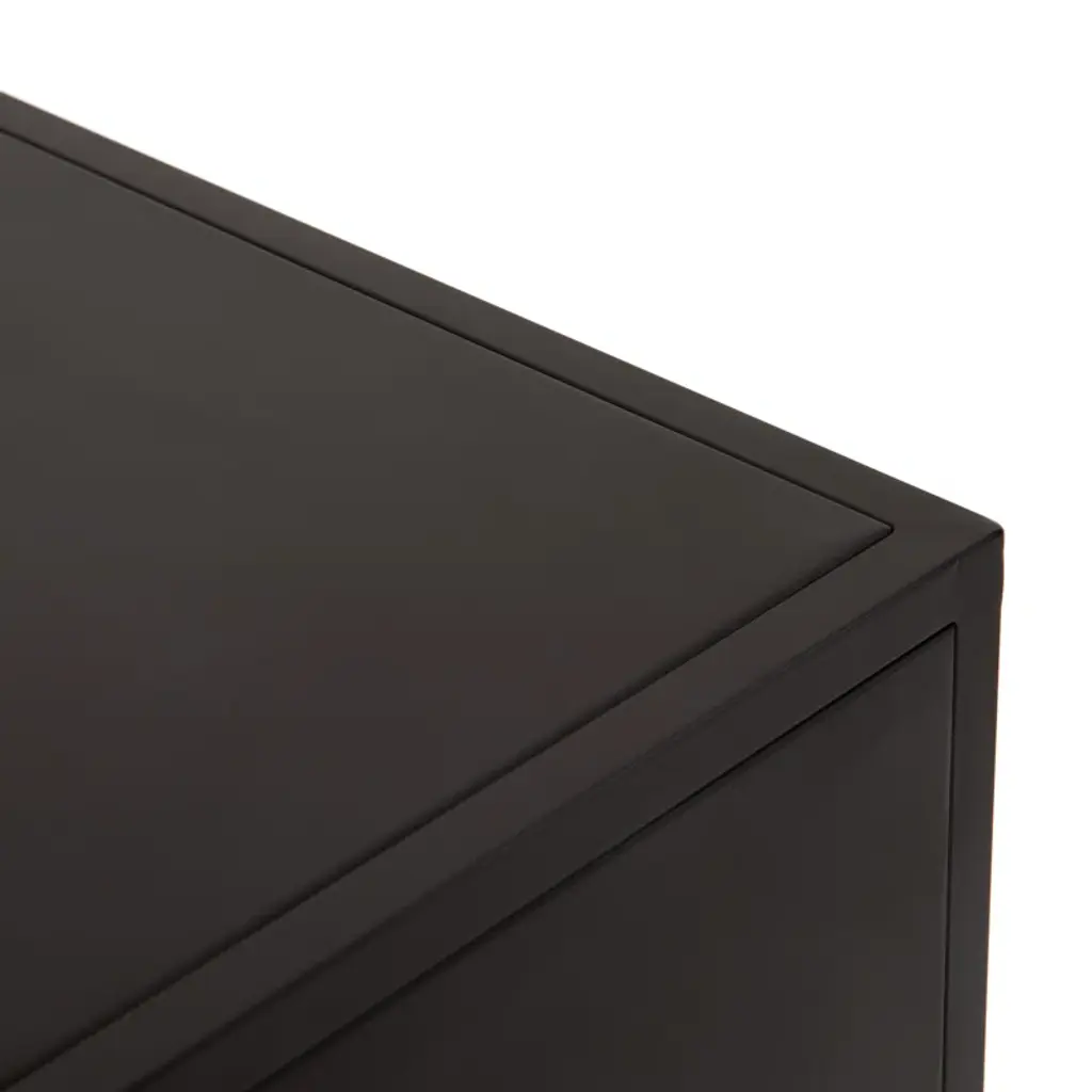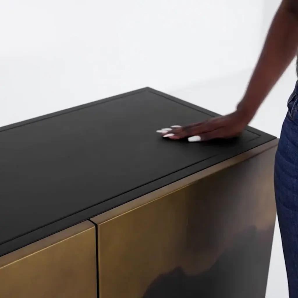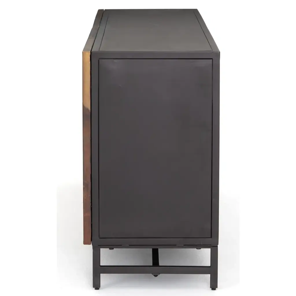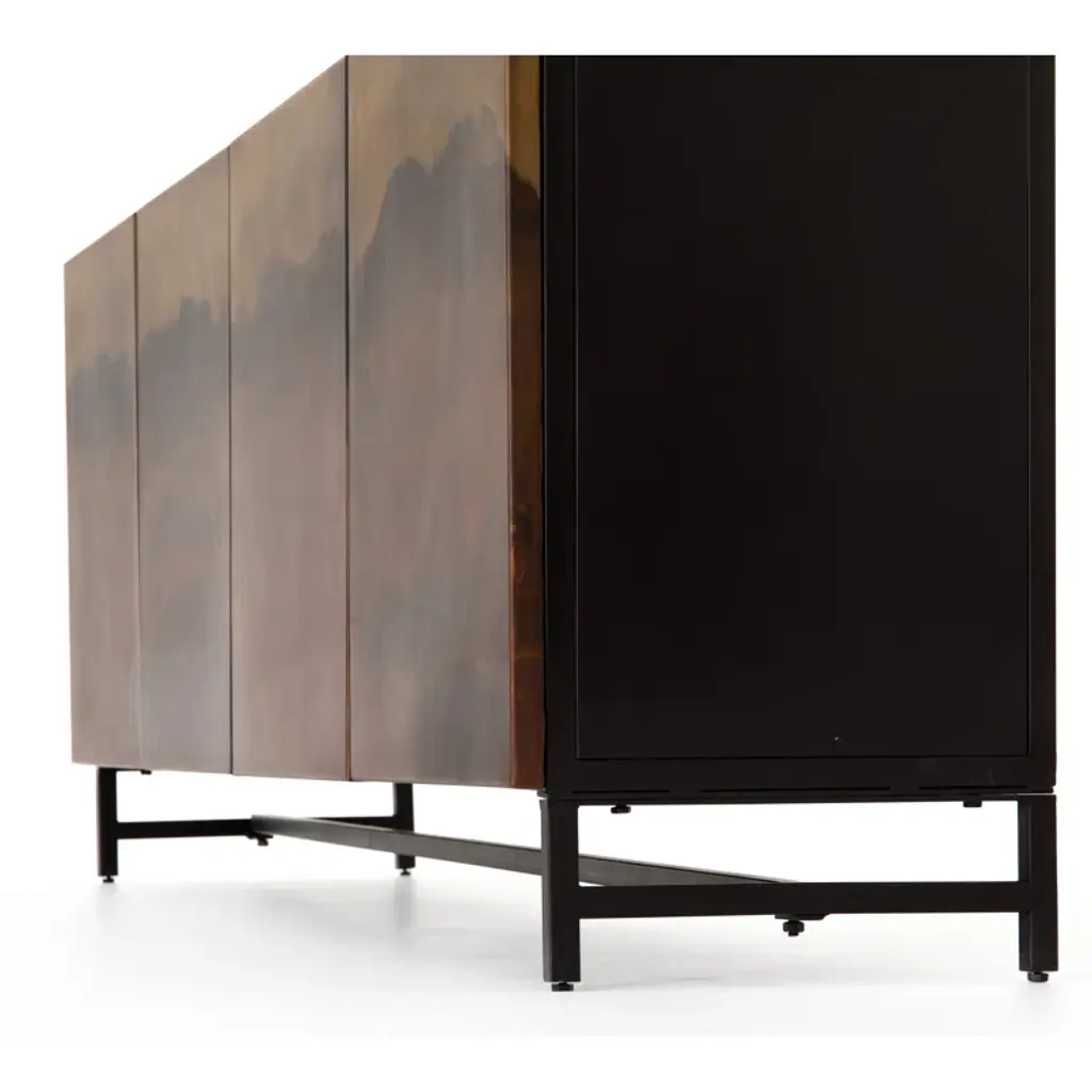 This 82” wide sideboard combines functionality with artistic design. It’s crafted from metal in rich brown and ombre tones and set atop a sturdy iron frame. Its four cabinet doors showcase a hand-rubbed finish for a uniquely aged, visually textured look. Inside, eight shelves provide storage for serving ware, media equipment, and more. The sleek, hardware-free design creates a modern, streamlined profile, while rear cutouts keep cords organized and out of sight.