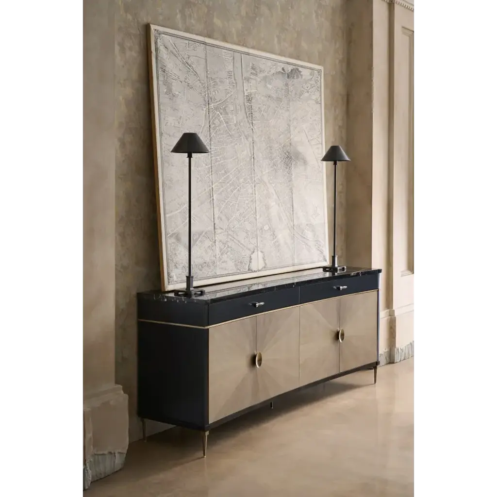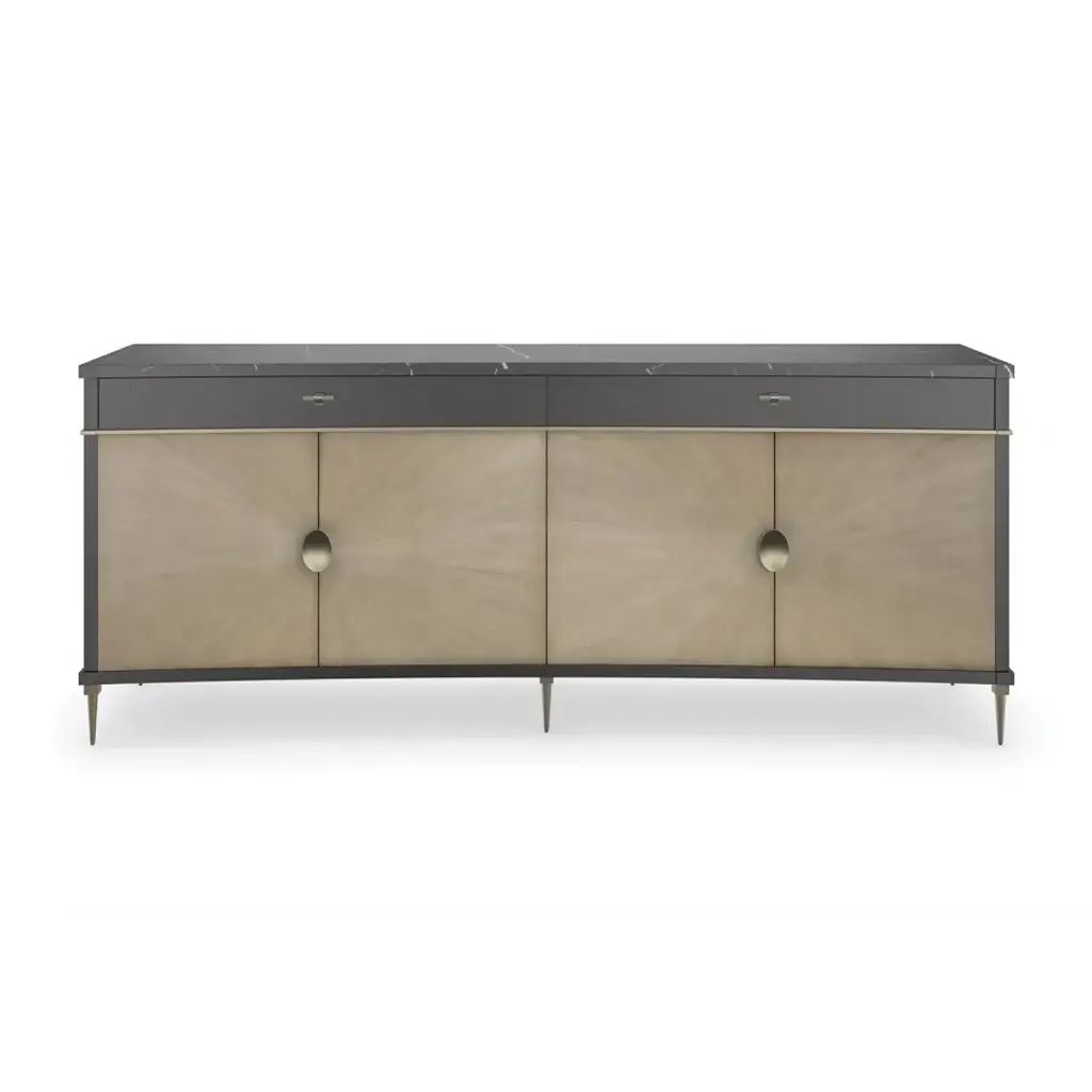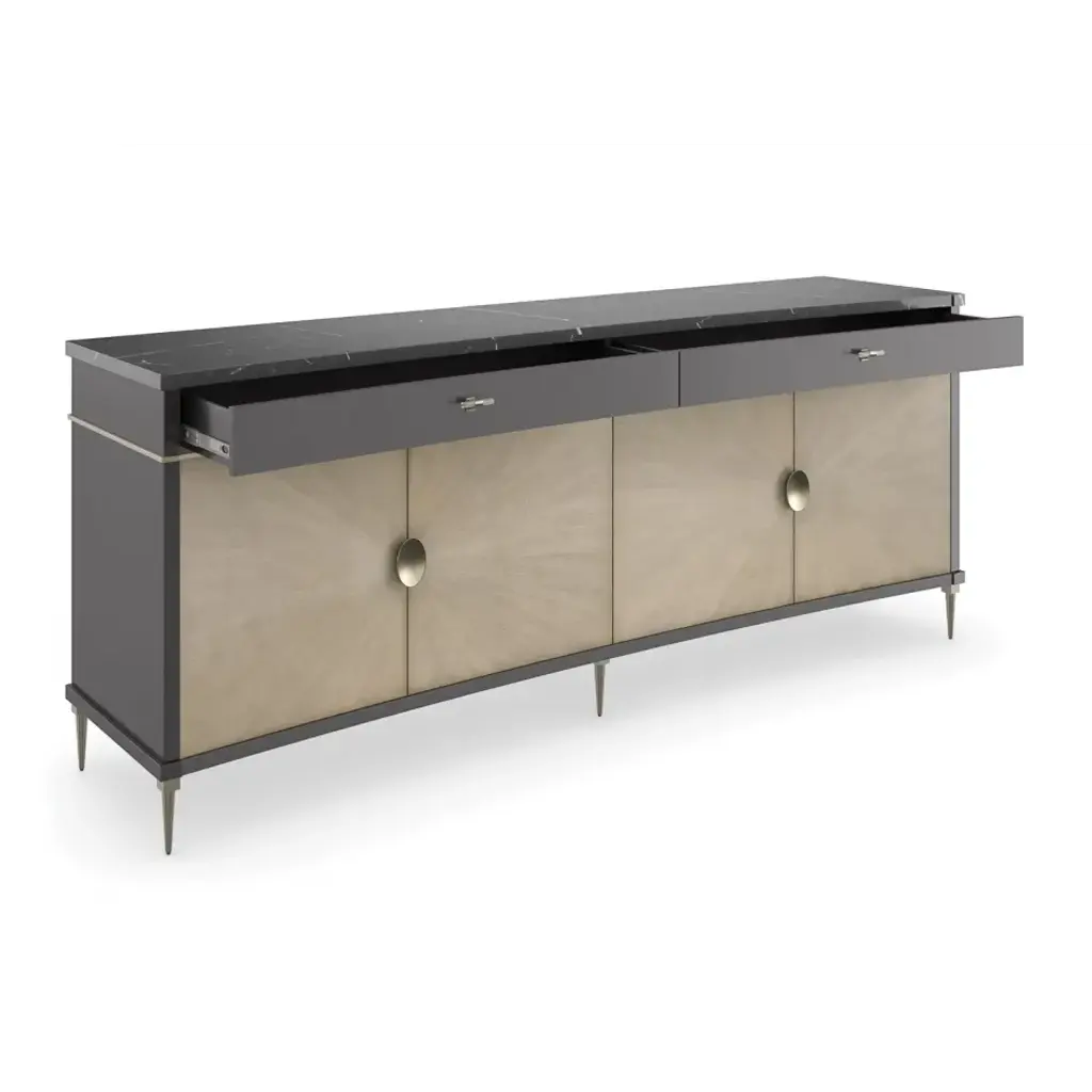 A contemporary take on French design and the Directoire style, this buffet brings a Neoclassical architectural presence with its clean shapes and decorative veneers. Punctuated by an Almost Black finish and Brushed Gold accents, it features radiating door fronts in Gray Gables to highlight the intricate wood grains of elegant Tiger Maple. A black marble top adds depth and a luxe yet durable surface for serving and display.